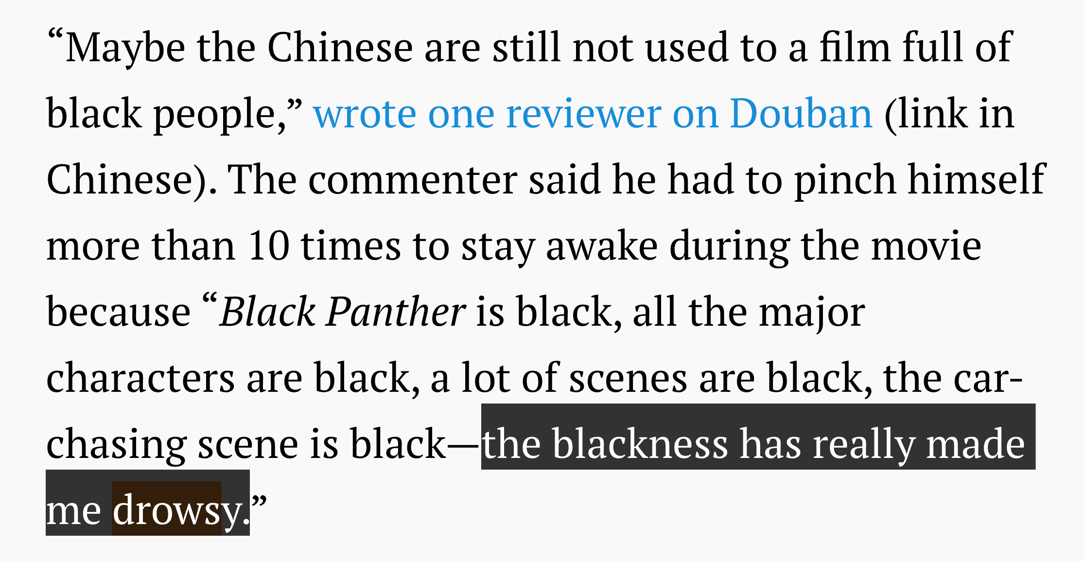 I ran across this quote in a Quartz article called “A Torture for the Eyes,” where Echo Huang reports on some of the negative response the film Black Panther received in China. Y’all: this quote. If it were aural in origin, I would produce a beat just to sample it. I’d have it on half the pads of my Ableton Push. I have already worked it into one very bad poem draft. But fuck that. It will be an epigraph to something I’m writing. I promise you.