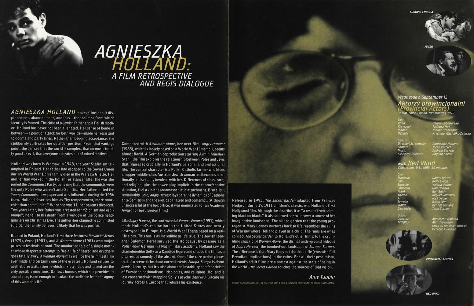 Director Agnieszka Holland has been one of the loudest and most profound voices of Eastern European cinema since the early 1980s. Her award-winning film about surviving the Holocaust, Europa Europa (1991), catapulted her to well-deserved fame. The daughter of a Jewish father and a Catholic mother who participated in the Resistance, Holland has deep connections to war-torn and broken Europe. Though her first films, Provincial Actors (1979), Fever (1981), and A Woman Alone (1981) were banned in Poland, they were met with critical acclaim and won awards internationally. Holland’s first Hollywood feature is The Secret Garden (1993), based on Frances Hodgson Burnett’s 1911 novel. Holland and Amy Taubin, film critic for the Village Voice and frequent contributor to Sight and Sound, engage in a Dialogue that spans Holland’s fruitful film career.