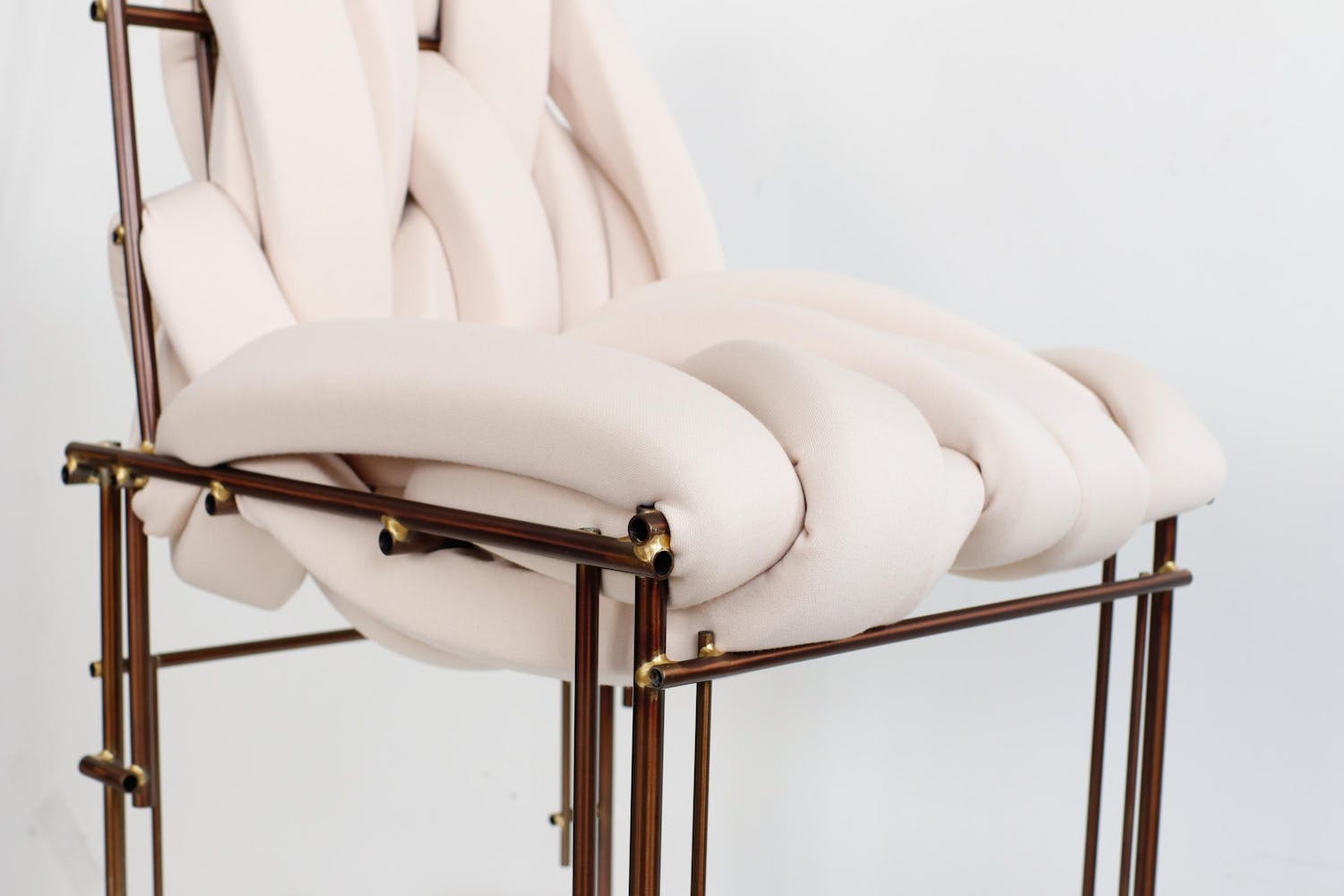Using the Lawless works as an example, after I finished that process the metal frame is joined together with brass brazing, then it gets a heat patina on it. When I’m creating the base structure, I’m thinking very architecturally about how these pieces are coming together and how weight, balance, and proportion combine to make the expressive furniture. The final moment is me in the studio combining these two raw industrial materials—upholstered foam sections and metal base structure—with my body.