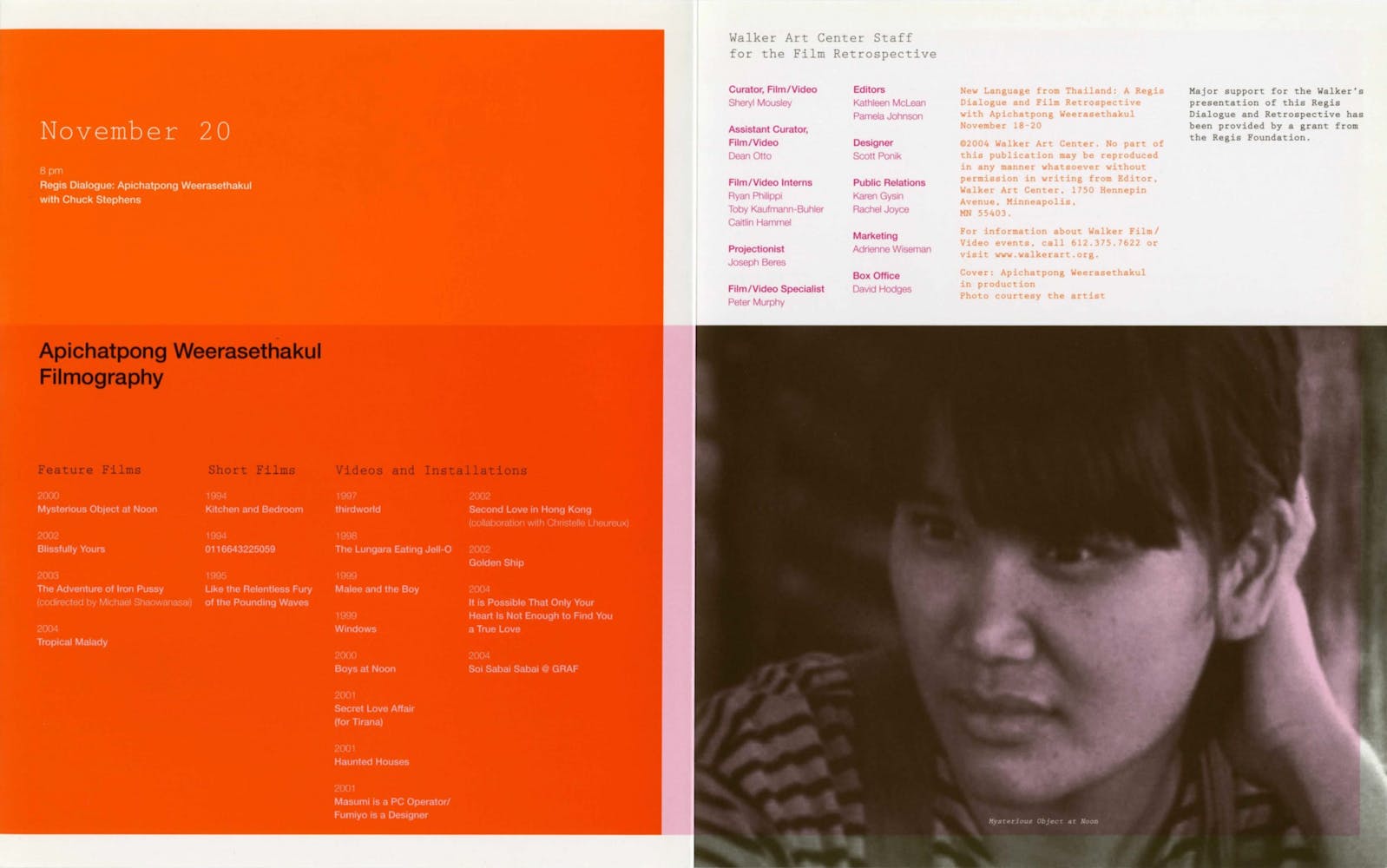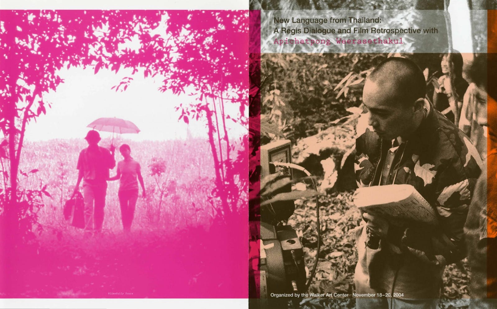 Thai filmmaker Apichatpong Weerasethakul has gained attention worldwide for his artistic and groundbreaking experimental films. His first major feature, Mysterious Object at Noon (2000), received critical acclaim. The director’s next works, Blissfully Yours (2002) and Tropical Malady (2004), both garnered prizes at Cannes, the former winning the Un Certain Regard prize and the latter winning the Jury Prize. Despite pushback from Thai government censors, Weerasethakul continued to make films with controversial content, including those giving voice to ordinary people. At the Walker Art Center, the director and Bangkok-based arts journalist Chuck Stephens gather to reflect on Weerasethakul’s filmmaking achievements. Stephens is a contributing editor for Film Comment, film critic for the San Francisco Bay Guardian, and an occasional contributor to the LA Weekly, the Village Voice, and Cinema Scope. Recorded in 2004.