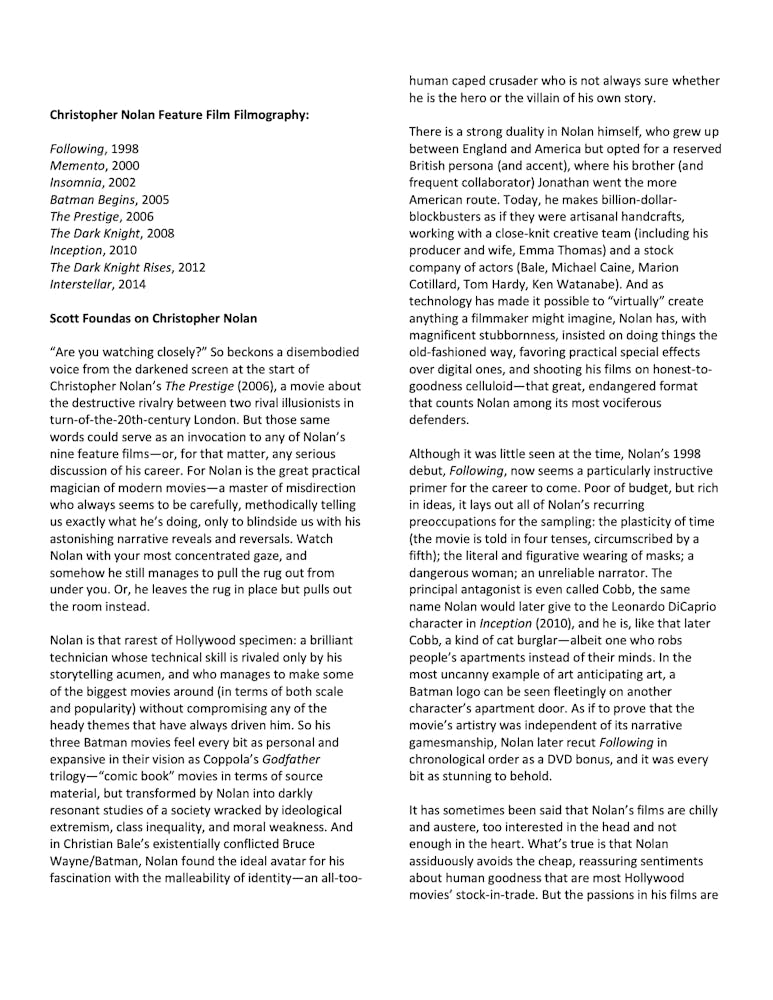 Exploring universal themes of family, love, and loss as well as the implications of more concretely physical phenomena—gravity, matter, and time—Christopher Nolan’s work is renowned by audiences, critics, and fellow filmmakers alike. First gaining attention in the United States in 2001 with the independent film and Sundance hit Memento, British director Nolan has maintained his distinctive perspective with his recent work while also enjoying enormous popular attention.