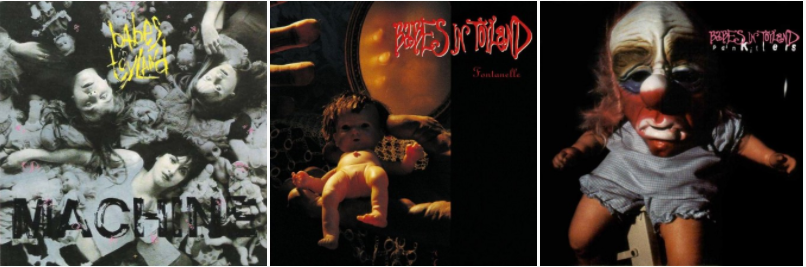 She shared that she used to collect broken doll parts—pieces of antique dolls, particularly the bisque arms and legs—so, naturally, her favorite photos by Sherman are ones where Sherman is using prosthetic body parts. But the covers of Babes in Toyland’s Fontanelle (Reprise, 1992) and the EP Painkillers (Reprise, 1993) didn’t bear those images: they focused on dolls instead.