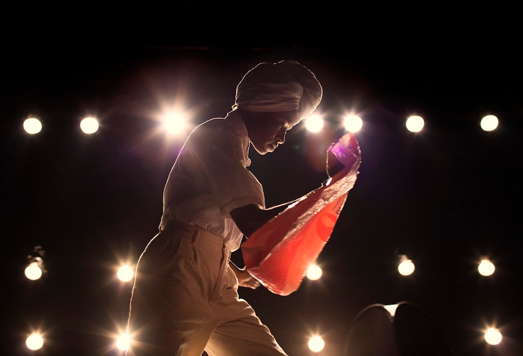 She puts on a fur coat that seems too heavy for her frame, wraps a small cut-out of her portrait around her forehead, picks up the mic in one hand and a horn and a bag of bread in the other. The whole stage is now lit up from the back; at some point a triumphant and trumpet-heavy piece of music is played in the background. For the next ten minutes or so, Michel rocks back and forth on her turned-out feet, letting the objects in her hands swing and sway along with the rhythm. Her head slightly dropped, her body always relaxed but also distorted, she would occasionally squeeze the horn or mumble something into the mic. Nothing much happens over this rather long period of time, and at once so many things are happening, so many feelings are being generated in this repetitive, and at times comedic slowness.