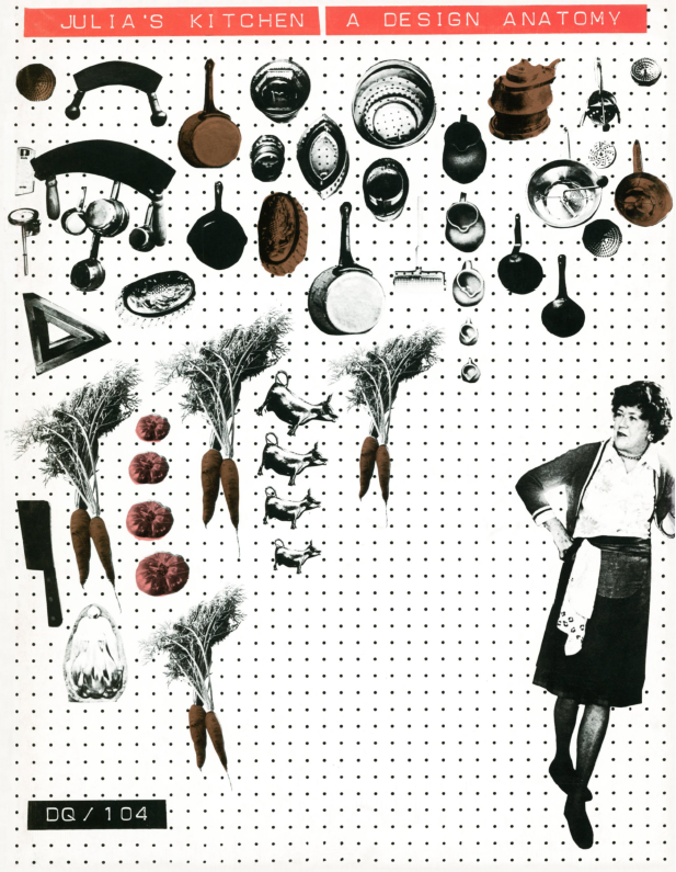 Twin Cities-based industrial designer Bill Stumpf, who championed user-centered approaches best exemplified in his iconic chair designs, expanded his ergonomic research interests when he proposed an issue of Design Quarterly dedicated to a study of celebrity chef Julia Child’s kitchen—a space designed and constructed by Child and her husband Paul in 1961 for their Massachusetts home. Stumpf and his team embedded themselves in the kitchen for several days, observing Child as she moved about the three-room space, cooking and using the many pieces of kitchen equipment that hung on utilitarian pegboard. They studied the efficacy of the kitchen layout and appraised the appliances and tools. A poster was also included in the issue, which shows a perspectival sketch of the kitchen and notates its various features and uses. Child’s actual kitchen is on now on display at the Smithsonian Institution’s National Museum of American History in Washington, DC.