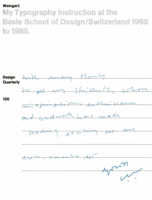 A concise history of Swiss typography is contained in this slim volume by two of its most influential practitioners, Armin Hofmann and Wolfgang Weingart, who taught at the famous post-graduate program of the Basle School of Design since 1968. The elder Hofmann, representing the refinement of modernist typographic principles and theory, had effectively exported Switzerland’s design philosophy around the world since the 1950s, while Weingart, the contrarian, rebelled against the dogma of Swiss design and in the process ushered in its second flowering during the 1970s and 1980s. Weingart’s influential philosophy of typographic experimentation and expression is mapped in the issue, which he summarizes as: “For me, making typography is like coordinating a four-headed creature: design ideas, conceptual thinking, typographic elements and printing techniques.”
