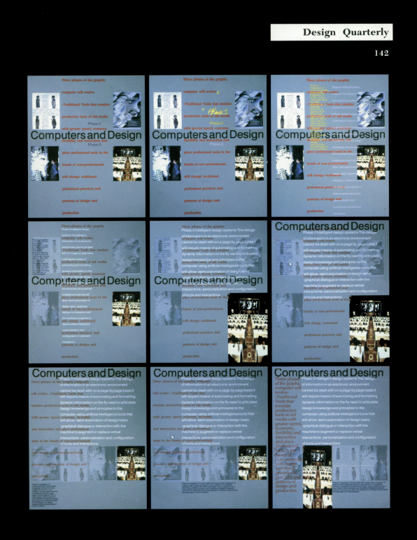 Guest-edited by Muriel Cooper this issue explores the pioneering work in display interfaces and data visualization by Cooper and her students and colleagues at the famed Media Lab at MIT. Tracing the relatively nascent history of visual computing, Cooper draws upon examples of older media and technologies to make her case for a comprehensive understanding of the potential of digital technology in the age of burgeoning multimedia. As the founder of the Media Lab’s predecessor, the Visible Language Workshop, Cooper had created inventive book designs at the MIT Press before abandoning that successful career path in 1976 to explore the potential of new graphic languages that could bridge the worlds of art, design, and technology.