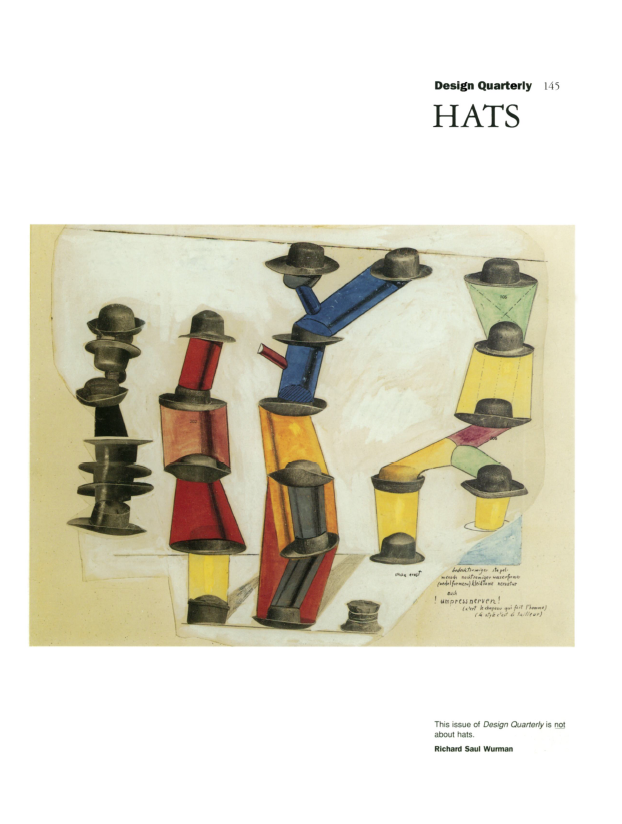 “The issue is not about hats. It is about hats as a metaphor for units of information,” declares the frontispiece of this issue guest-edited by Richard Saul Wurman, founder of Access Press, a publisher of maps, guides, atlases, and comparative charts. Wurman lays out his sage advice to aspiring information architects, describing the five ultimate “hat racks” for organizing or hanging information: alphabet, time, location, continuum or magnitude, and category. Through copious examples and typologies, Wurman hints at his future fame as the creator of the TED conference and its pithy, memorable presentations: “This issue of Design Quarterly is about a singular passion: making things of personal interest understandable to others.”