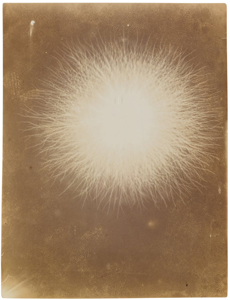Using cameras and camera-less techniques in combinations with and without electricity, Baraduc sought snapshots of the soul in different states, such as during a nightmare, in anger, or at prayer. His pictures arose from the emulsions as nonfigurative patterns, suggesting subtle phenomena at the cusp of matter and spirit.