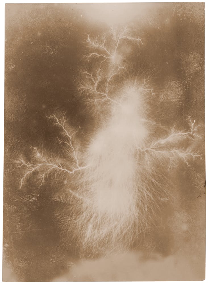 One photographic experimenter strapped a light-sensitive plate to an angry person’s forehead to make a picture of a feeling, while another left emulsions beneath the night sky to capture “celestographs” of distant stars. Some researchers made photographic impressions of a mummified hand after it was mesmerized by three hypnotists for four weeks. Other researchers compared images of electric sparks made on a prostitute’s freshly washed skin with those made on the flesh of a little girl.
