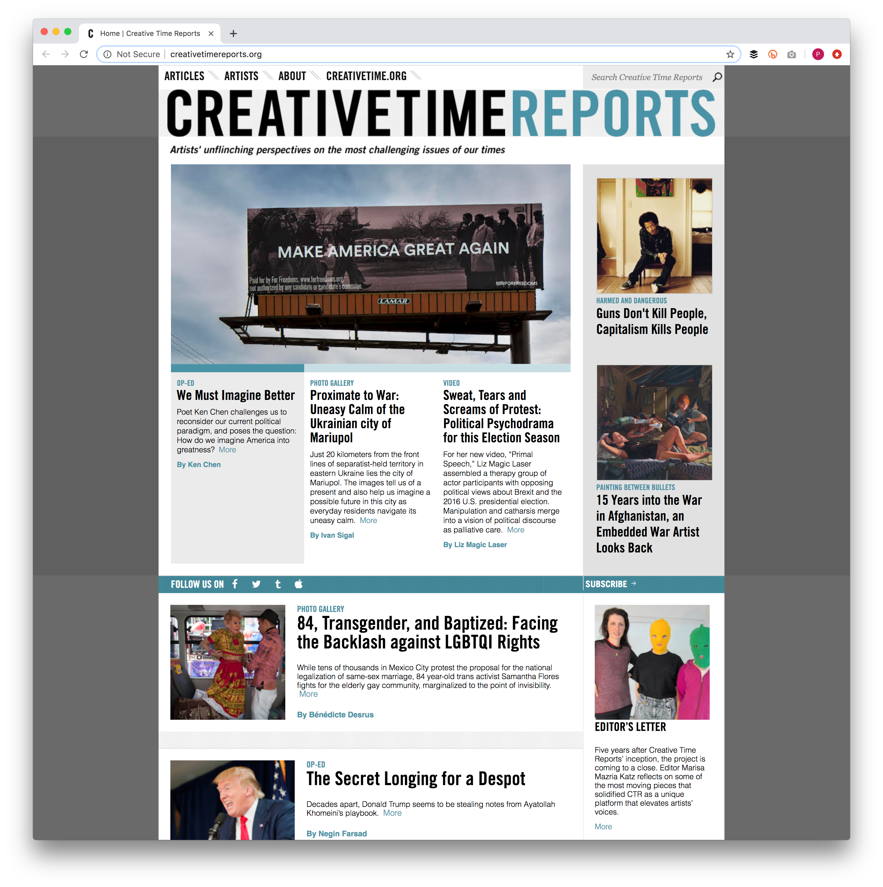 Today Creative Time Reports remains not only a profound resource for analysis of world events but also an incredibly useful compendium of artists’ writings for anyone doing research into specific geographies; political, social, and economic realities; or artistic practices. And the urgencies that we responded to at the outset of the project have only increased in the seven years that have since passed.