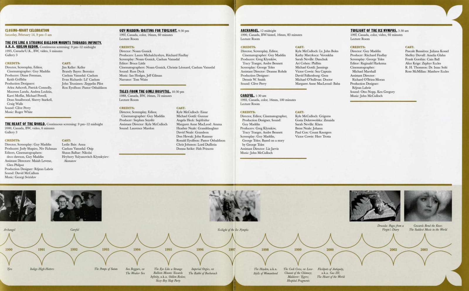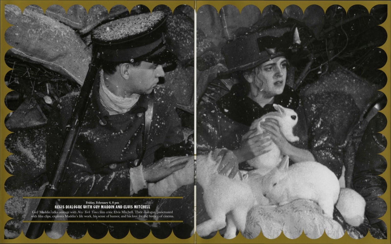 “Bold,” “vivid,” “ironic” may be the first words to come to mind when considering filmmaker Guy Maddin’s oeuvre, especially given his appetite for stylized black-and-white tableaux depicted with a teeming, sometimes overwrought vitality—Bosch-scapes with the action, and actors, almost spilling out of the frames. But that showmanship is balanced by a sense of emotional detail. The films are often rendered with the melodramatic creaminess of early, less subtle cinema, but with a dramatic verve that subsumes mere “tongue-in-chic” poses. The aspect of spiritual honesty, paired with his vaudevillian existentialism, results in a filmography that is simply unforgettable. Maddin’s output isn’t merely sardonic homage, nor is it simple, ostentatiously florid filmmaking; he uses the archness of the past to offer insight into the present. (He casts actresses with large, dark, expressive eyes and cherubic faces—iconic old-fashioned camera subjects he then subverts by using contemporary acting skills).