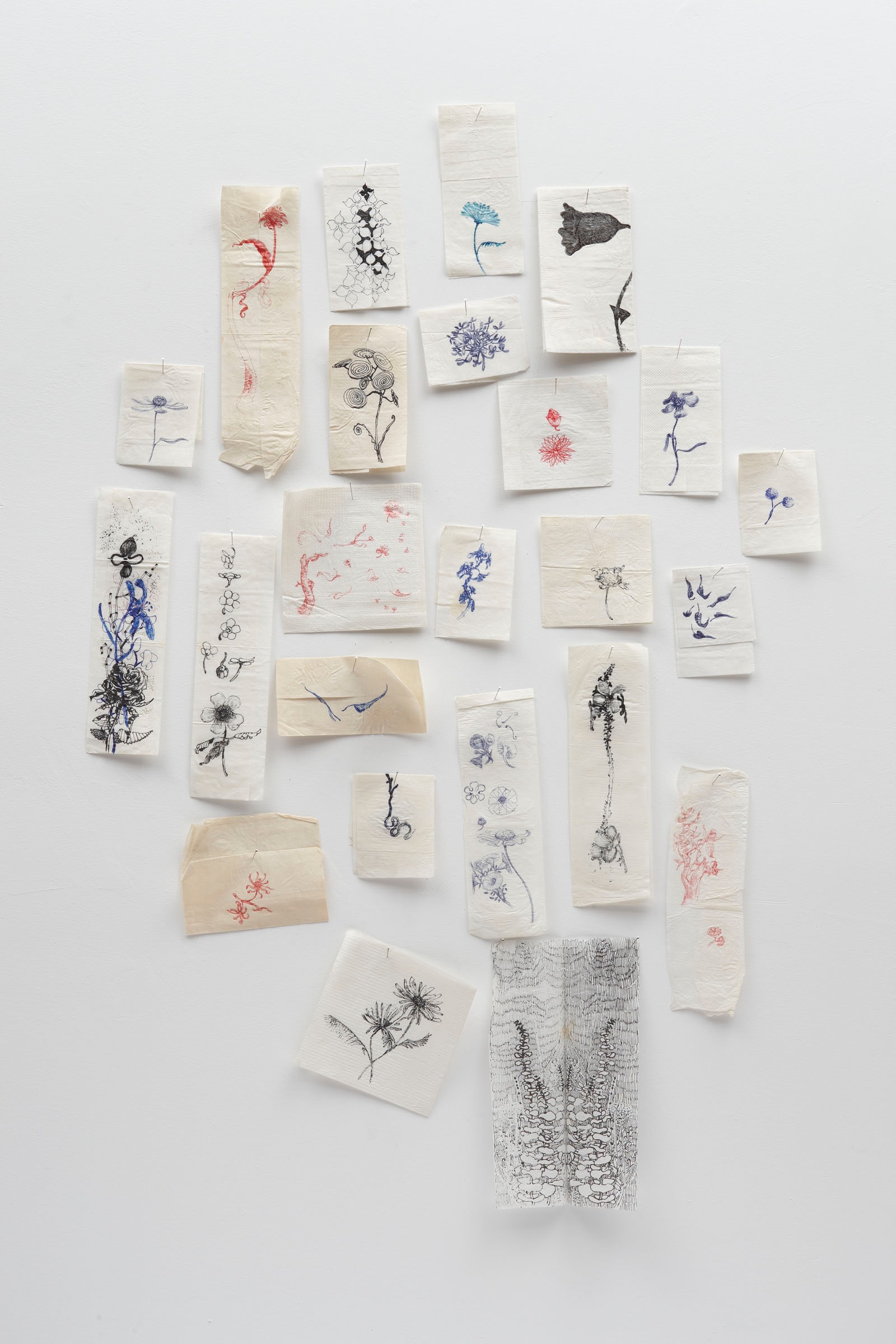In A Diary of Flowers, a series from the early 1990s that brought the artist his first critical acclaim, Hodges’s adoption of literary forms, such as elegy and metaphor, found even greater expression. These works were born of straightforward, ritualistic acts of drawing each day on coffeehouse napkins. Over time, the artist’s accumulated “doodles” would be assembled into cloudlike clusters or groupings, ranging from 8 to 576, which served as elegiac markers, memorializing friends and other individuals, many of whom were lost during the height of the AIDS crisis. In a related series of “saliva drawings,” Hodges transferred small ballpoint-pen drawings of flowers onto other sheets of paper using his saliva. This bodily act of transfer and agency was a response to cultural attitudes about AIDS and its transmission in the early years of the pandemic. And though the artist generally resists such narrow, identity-oriented readings of his art, preferring to emphasize its broader communicative potential, Hodges’s works of this period were no doubt informed by these stark realities, which he transcribed through subtle, evocative gestures of mourning and memorial.