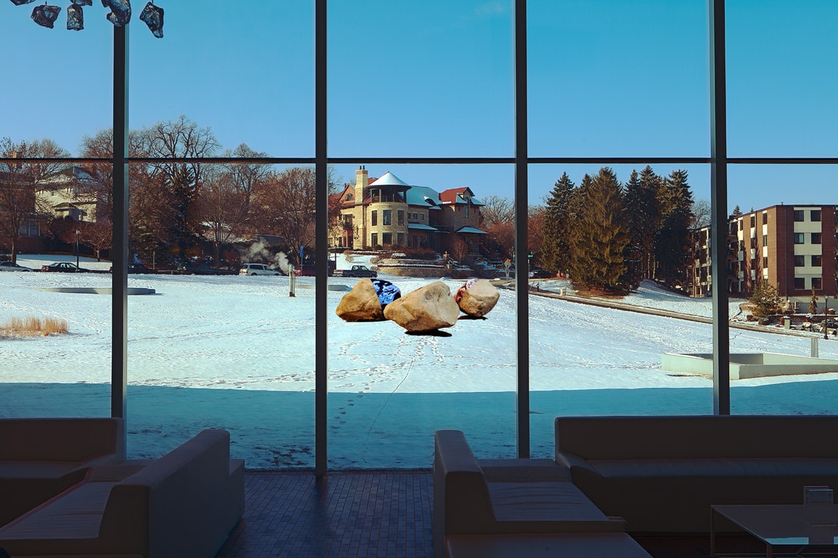 The boulders of Untitled, which debuted indoors in November 2011 at Barbara Gladstone Gallery in New York, do seem to defy their materiality. This is, indeed, part of their magic. As you walk amid the sculptures and they are animated by light, they at once seem massive and monumental yet light and buoyant, almost weightless. These qualities typify other outdoor public works Hodges has created in recent years, including look and see (2005), first created for the New York Public Art Fund and now permanently sited at the Albright-Knox Art Gallery in Buffalo. The design for the piece was inspired by the patterns of camouflage, a recurring motif in Hodges’ art associated with identity, both its masking and exposure. Rendered in cutout forms of polished and painted steel, look and see changes character, as the Walker’s boulders no doubt will, through the seasons and as light, weather, and atmospheric conditions shift throughout the days and months.
