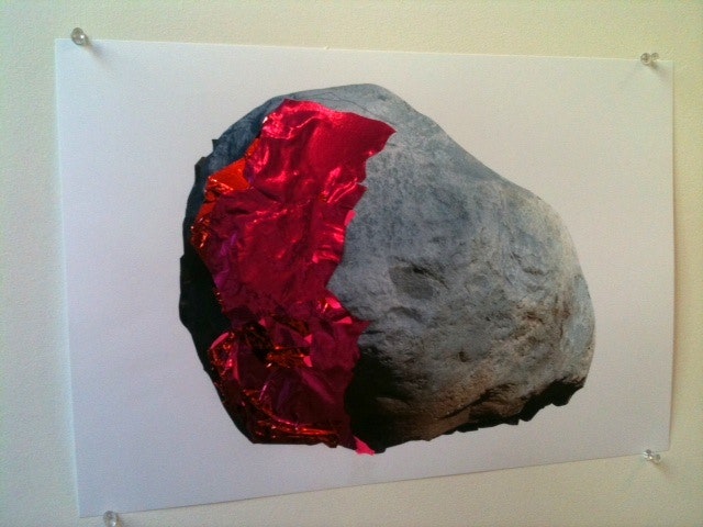 It was a small depiction of a boulder onto which the artist had adhered a piece of shiny pink foil. The metal swatch followed the contours of one of the faces of the rock, highlighting its dimensions, catching and casting light and throwing shadows across the surface. Jim had just returned from his first trip to India and the studio was redolent with ideas–drawings and folded paper constructions were displayed on tables and walls around the space.