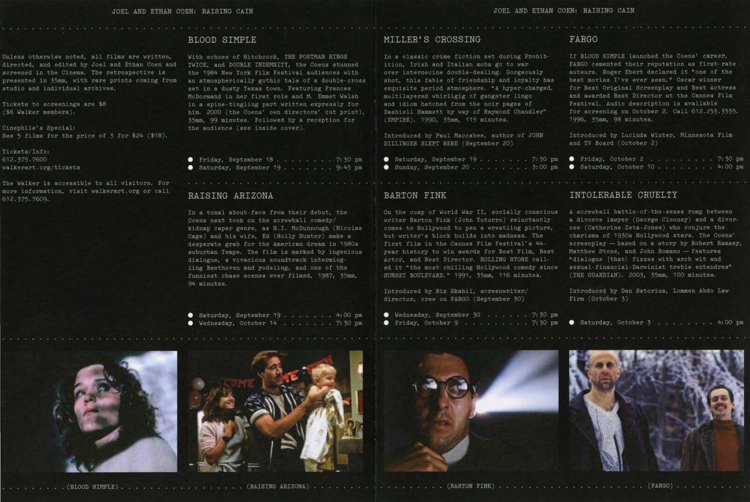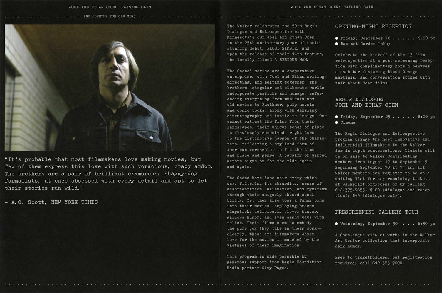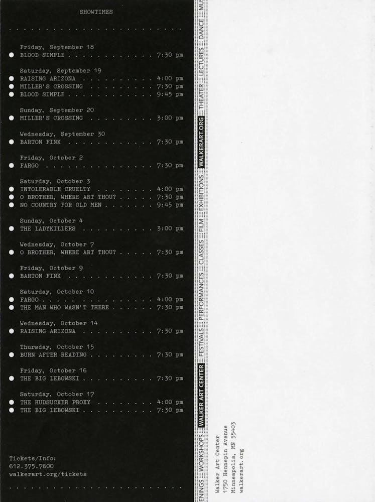 The Walker celebrates the 50th Regis Dialogue and Retrospective with Minnesota’s own Joel and Ethan Coen in the 25th-anniversary year of their stunning debut, Blood Simple, and upon the release of their 14th feature, the locally filmed A Serious Man.