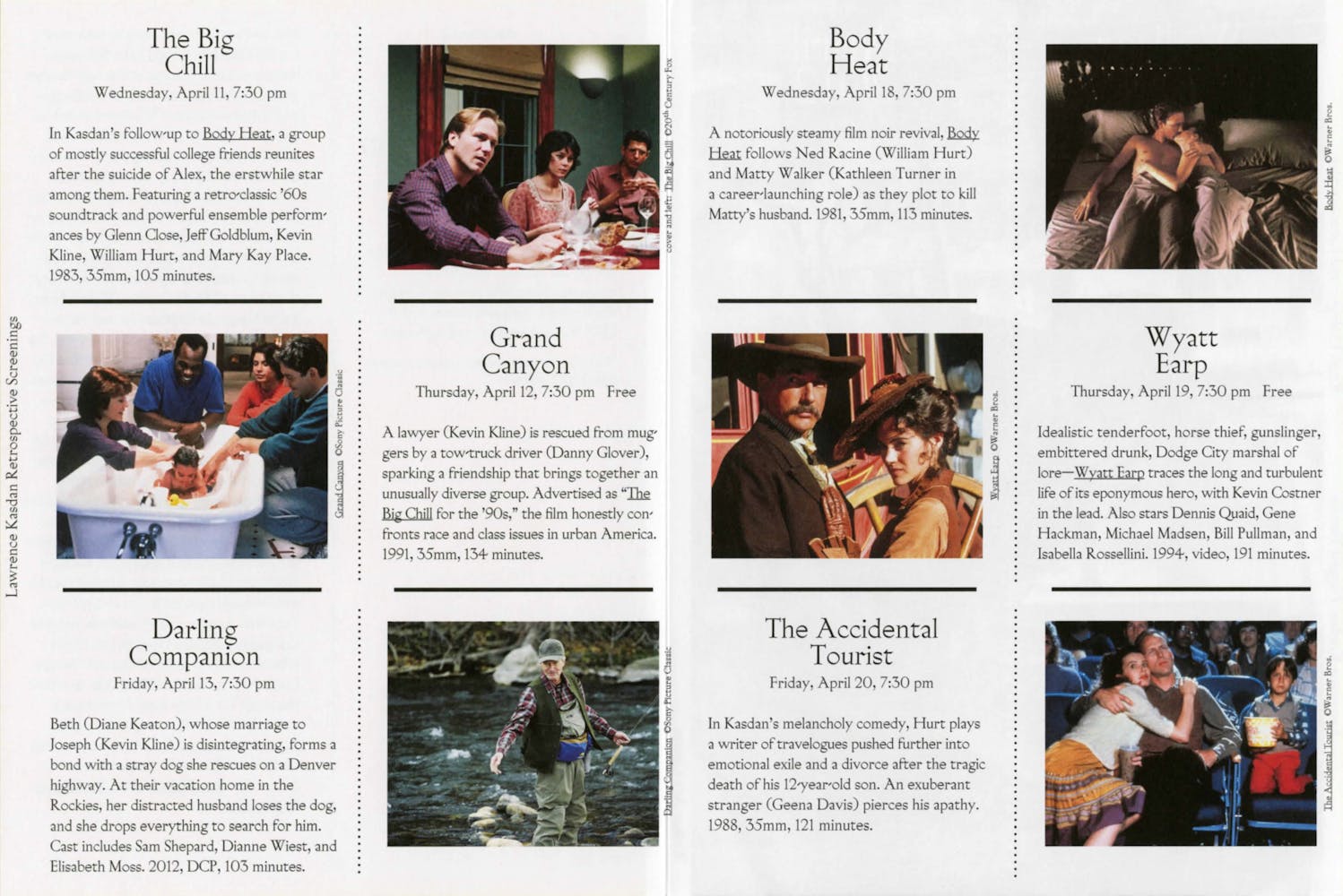 Not just anybody can claim to have written for Indiana Jones and Luke Skywalker, painted an iconic portrait of the baby boomer generation at the crossroads of middle age, and filmed a couple of Westerns as fine as any made in Hollywood since Hollywood effectively stopped making them. We could stop there and already have one of the more remarkable careers in contemporary American movies, but Lawrence Kasdan has also made a sizzling film noir that Sam Fuller or André de Toth would have been proud to call his own, and had a hand in launching the careers of Kevin Costner, William Hurt, Kevin Kline, and Kathleen Turner—actors who have reappeared in his work over the years, seeming less like movie stars than like an enthusiastic company of traveling players.