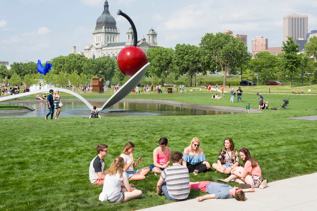 The Walker Art Gallery, whose walls were covered with the voluminous, eclectic collection of the Minneapolis lumberman and civic leader Thomas Barlow Walker, brought a significant new cultural dimension to this area of the city. This extensive aggregation of nineteenth-century painting, Chinese jade and ceramics, American Indian pottery, and European decorative art objects was open, free to the public. By placing it across the street from the Armory, he unwittingly helped determine the future use of that large parcel of city-owned land. With the opening in 1963 of the Guthrie Theater next door to the Walker Art Center, new audiences for the arts were developing, and during that decade, attendance at both the museum and the theater continued to grow. Even though the land across Vineland Place was an undeveloped field, it was also a bright green carpet in the summer over which visitors to both institutions would stroll.