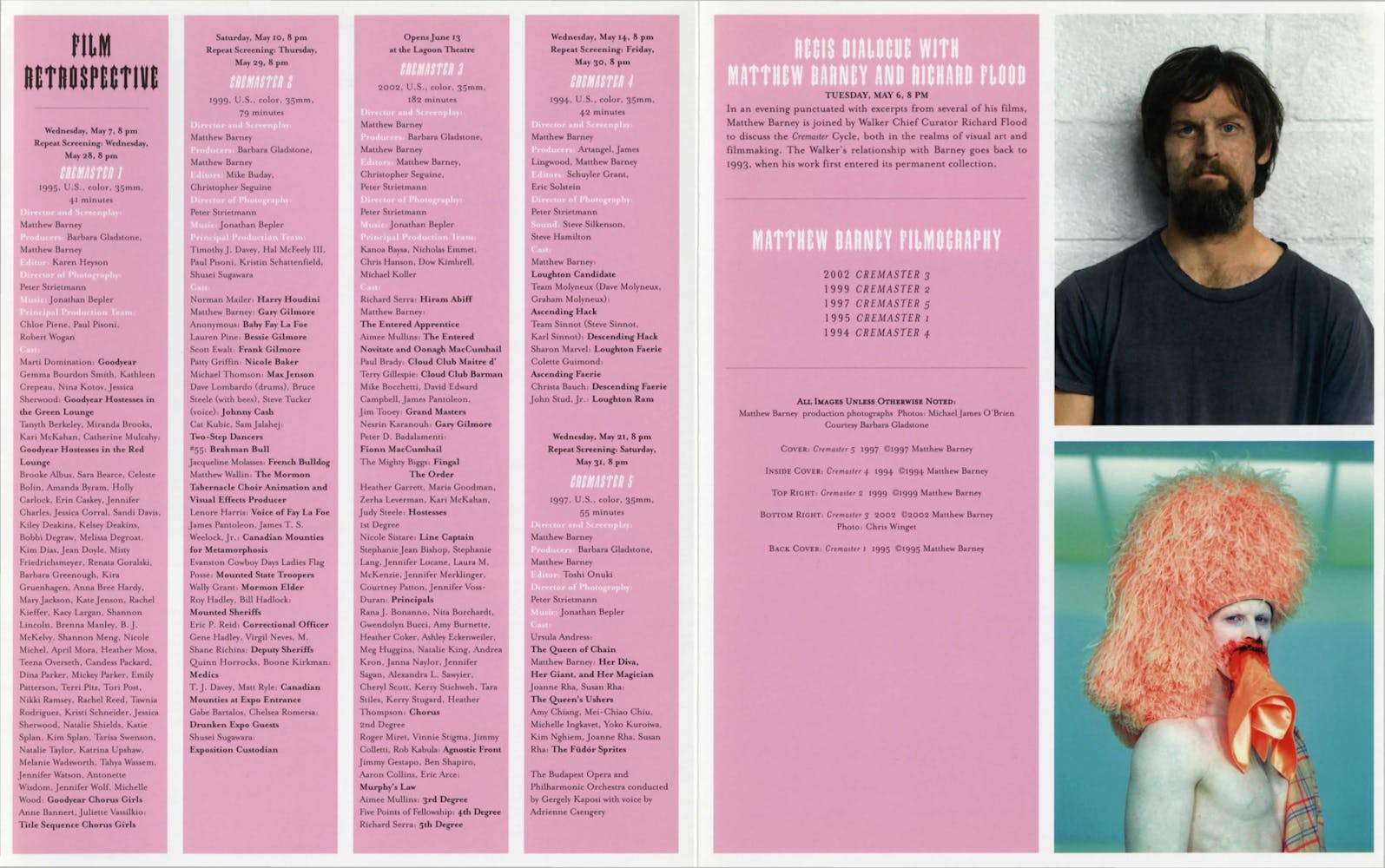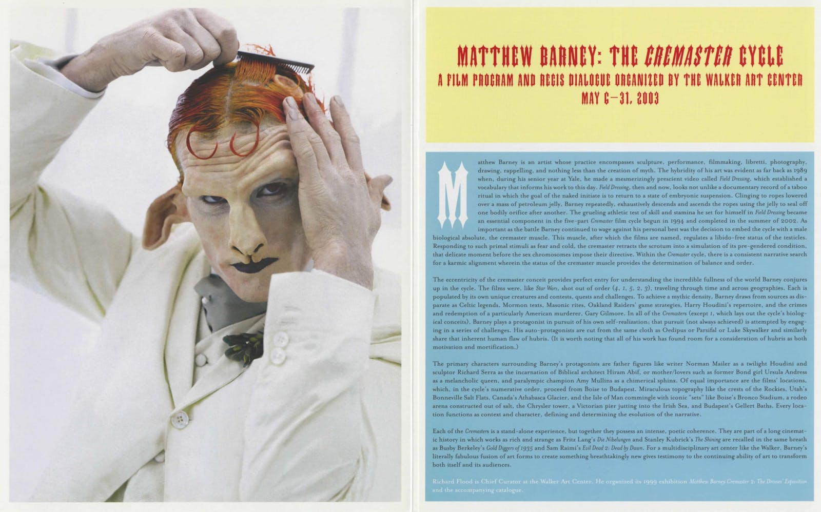 Each of the Cremasters is a stand-alone experience, but together they possess an intense, poetic coherence. They are part of a long cinematic history in which works as rich and strange as Fritz Lang’s Die Nibelungen and Stanley Kubrick’s The Shining are recalled in the same breath as Busby Berkeley’s Gold Diggers of 1935 and Sam Raimi’s Evil Dead 2: Dead by Dawn. For a multidisciplinary art center like the Walker, Barney’s literally fabulous fusion of art forms to create something breathtakingly new gives testimony to the continuing ability of art to transform both itself and its audiences.