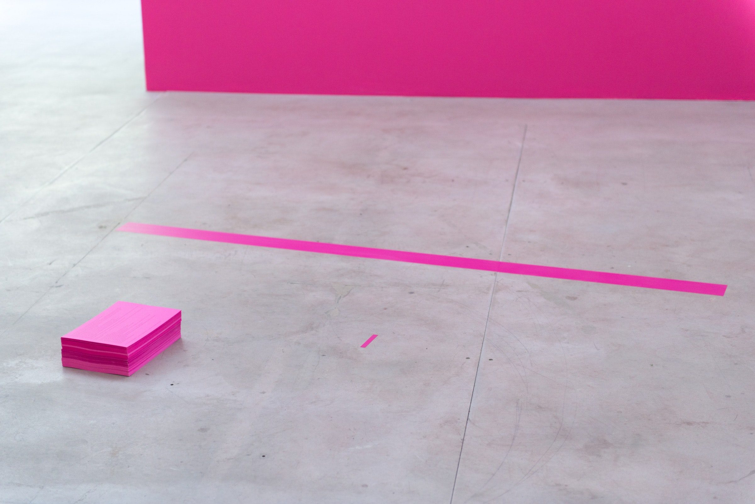 Scholar Philip Auslander differentiated “documentary” from “theatrical” forms of documenting performances,16 the first merelly giving evidence and ensuring longevity beyond the performance itself, while the second includes works that are specifically performed for the camera lens. Auslander generalizes that most performance art documentation purports “to make the artist’s work available to a larger audience, not to capture the performance as an ‘interactional accomplishment’ … [it] participates in the fine art tradition of the reproduction of works rather than the ethnographic tradition of capturing events.”17 The footage in STAGING: solo – archival achieves both: at once it offers an excerpt of the performance (giving a sense of speed, spatial parameters, interplay between dancers), as well as its context (drawing attention to audience behavior and setting within a gallery and public space). Hassabi’s third iteration—STAGING: 5min (2018)—is described by the artist as a “sculptural entity” and consists of three elements: the taped Pink Line and Spike Mark, as well as a stack of identical sheets of paper, each showing an excerpt from the written script for STAGING: solo, an invitation for the viewer to stand in the dancer’s space, and, while reading the text, begin dancing the piece. Borrowing from Gonzalez-Torres, the stack has a prescribed height and must be replenished by the exhibiting institution. STAGING: 5min is at once a discrete sculptural work, as well as a place of anticipation and rest. Immediately prior to a dancer’s arrival, the stack is removed, and then following their departure, the stack is replaced.