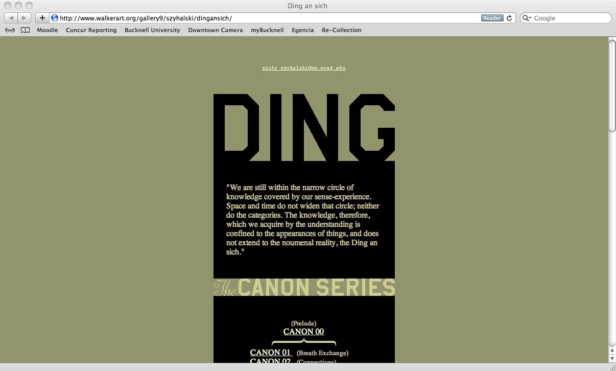 When Steve Dietz and the Walker Art Center asked me to write about the re-launch of the 1997 web-based artwork Ding an sich, one of the reasons humorously offered for my selection was that I was alive at the time of the original commission. I had a chuckle, but it seems entirely appropriate to measure the life cycles of new media artworks against such corporeal terms. For instance, I teach about Ding an sich in my undergraduate art courses, and much of my audience had not been born by the time this artwork was created. A generation of people has grown up to learn about this work, while a generation of technology has collapsed around it, making this a good time to revisit Ding an sich. This tack of tangibility is also relevant because it evokes questions the art world has long wrestled with–the relationship in art between materiality and experience or meaning, the body of art, and the “thingness” of the thing–into which this work and its relaunch may provide new insight.