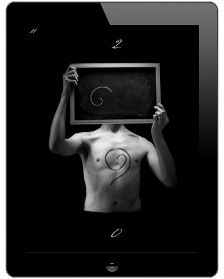 In 1997, some of the less generous reactions to emergent net.art were that it did not show “the hand of the artist,” that works lacked sensual materiality, and that the genre was screen-based, thin, and had no “body” (these despite the fact that net.art followed decades of photography and conceptual art). Ding an sich was one net.art work that, like Stella’s Minimalism before it, integrated the viewer’s embodied interactions into its phenomenological core. Extending this shared body, the new Ding an sich app will include accessibility for hearing- and sight-impaired audiences. The work reveals several depictions of the human body (two heads facing each other, a woman reading, a man spinning and another holding a chalkboard) that the viewer explores with their own hands, trying various touches, pinches and swipes to activate. The new app’s touchscreen technology lends the work a tactile intimacy untenable with traditional painting and even further than the original web-based version. The hand of the artist is replaced with the hand of the viewer. And, of course, the current project to retool Ding an sich points to the manifest materiality of this and of all digital artworks.