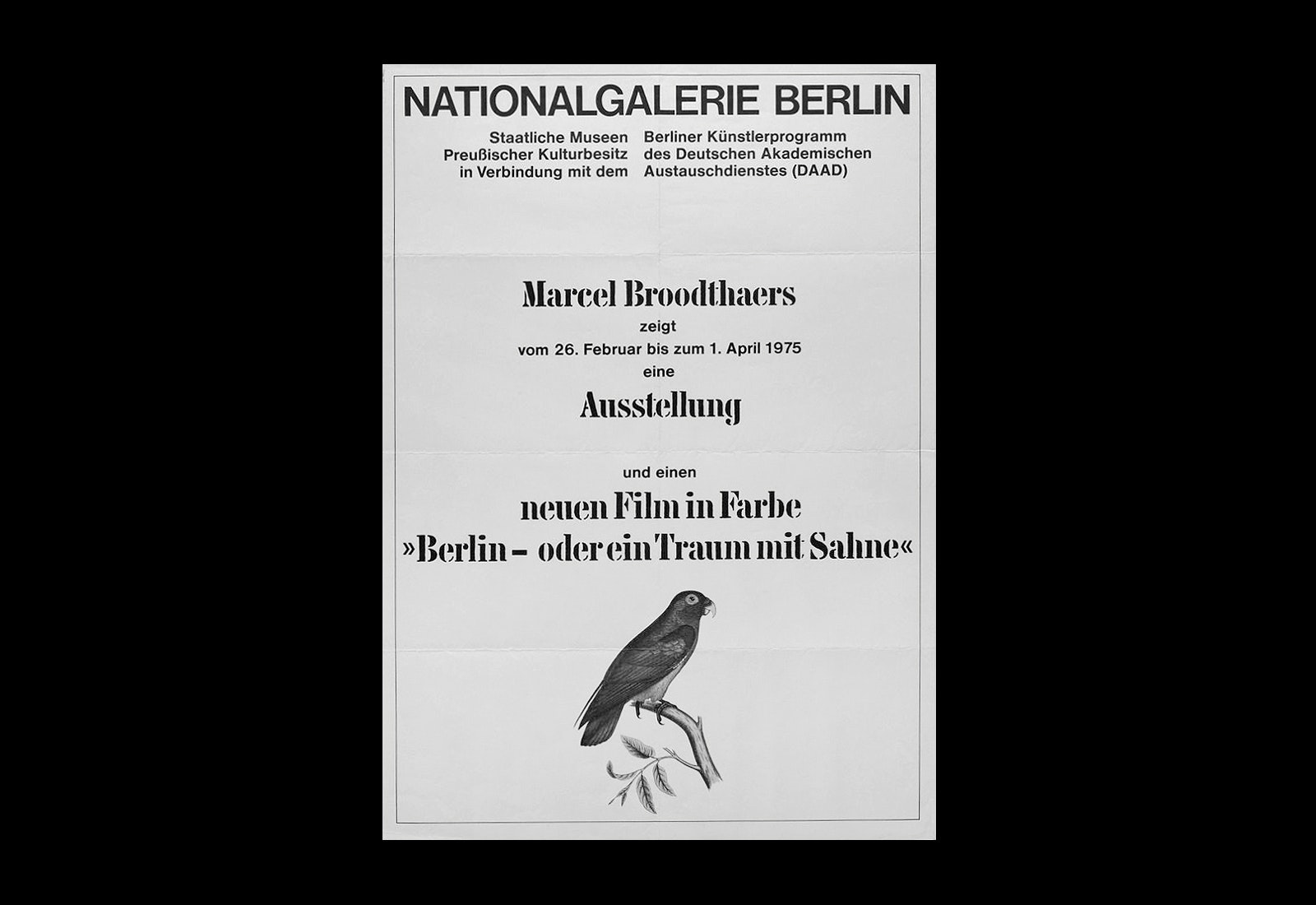 Broodthaers, then, formed the starting point for the design of the catalogue, and online visual research soon turned up an unexpected companion piece to Dites Partout Que Je L’A Dit in the form of a poster designed by Broodthaers in 1975 for an exhibition and film screening at the National Gallery, Berlin featuring the same parrot illustration and one of the artist’s trademark stencil typefaces. These two elements thus suggested themselves as visual components on which an identity for the exhibition and catalogue might hang. Immediately, typography became a question: a stencil face, while perfect for display, is generally less readable in text sizes. Enter Klod AM, a new typeface designed by Adrien Menard, a French designer recently relocated to Brooklyn, and discovered thanks to Instagram.