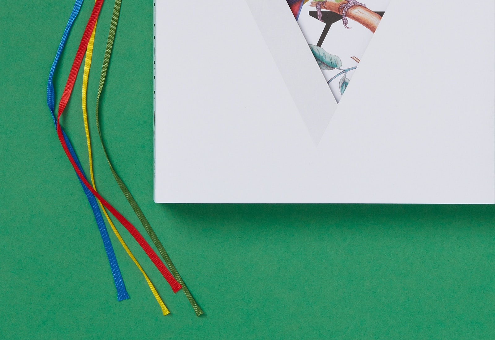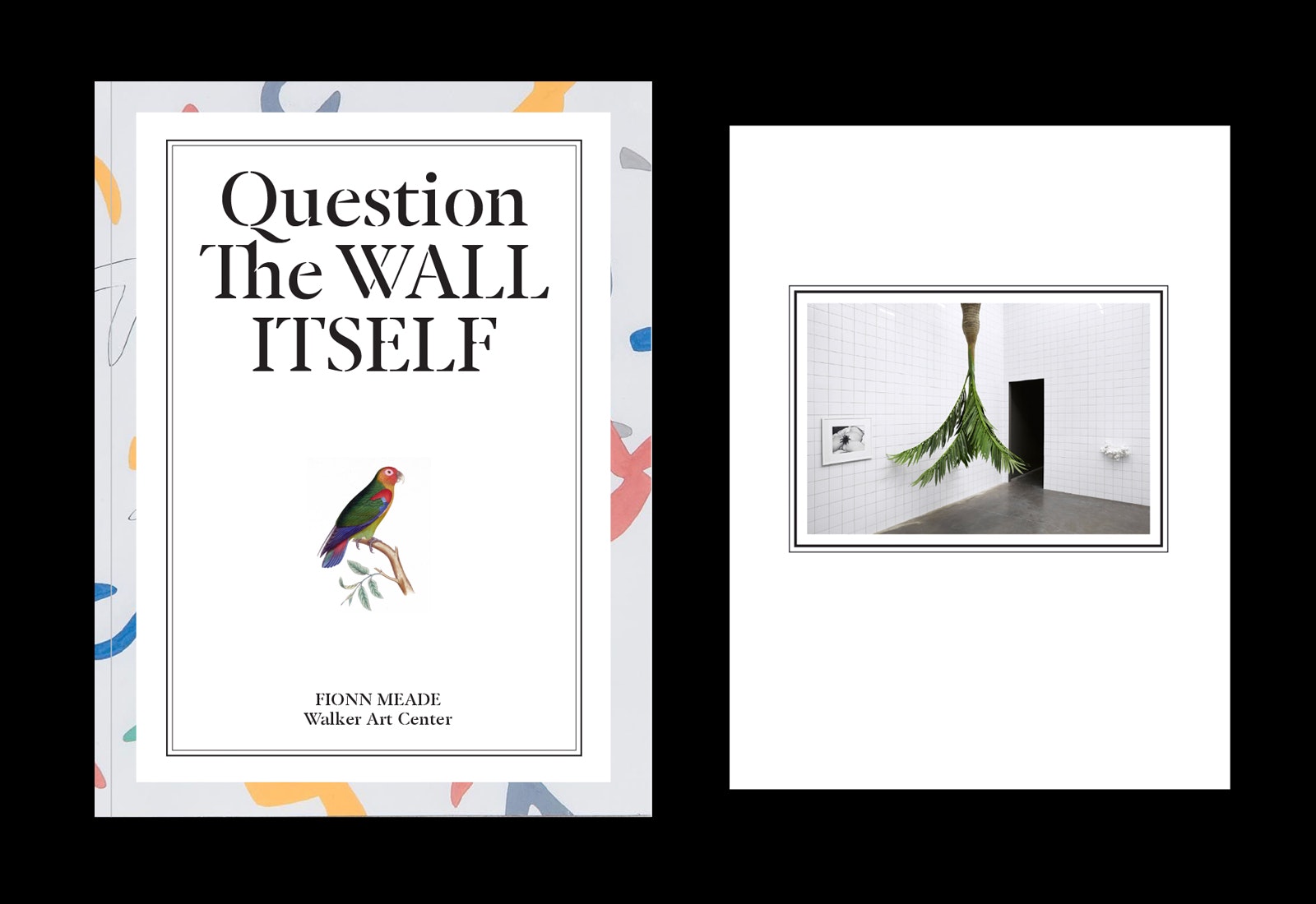 As a book object the catalogue thus seemed almost complete, but it wasn’t until going on press at Die Keure in Belgium that the finishing touches were decided upon, budget permitting. With the parrot serving as a kind of stand-in or prop for the exhibition as a whole, it had always seemed that the catalogue itself required an additional, perhaps even superfluous, decorative element, something that would exceed the bounds of the book-as-exhibition held within its pages. This took the form of four ribbon bookmarks in red, yellow, green, and blue, bound into the book block to function not simply to separate the four sections of the catalogue—curatorial essay, installation views, critical essays, and artist pages—but to serve as its own kind of colorful plumage. With this final material gesture—tucked into the interior of the catalogue and sight unseen until the books were shipped—the design idea behind the catalogue for Question the Wall Itself perhaps found its most clear realization.