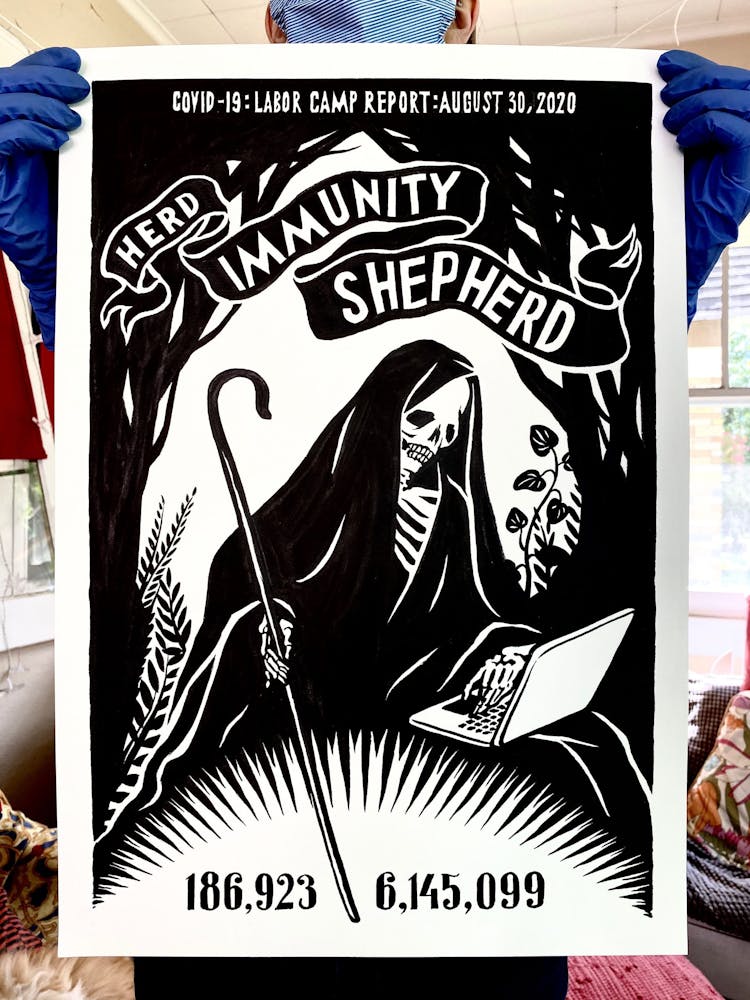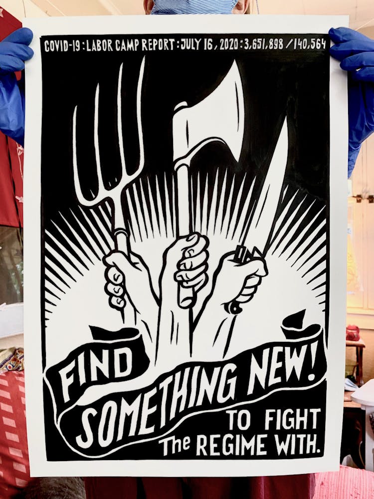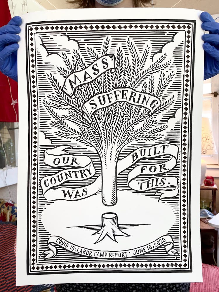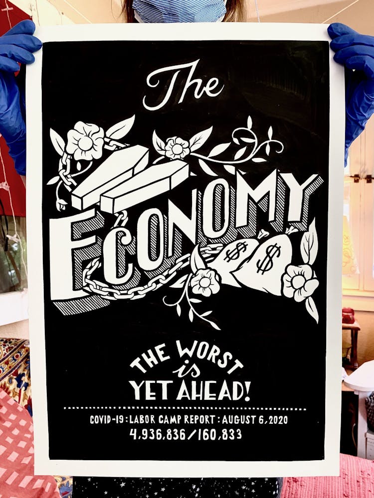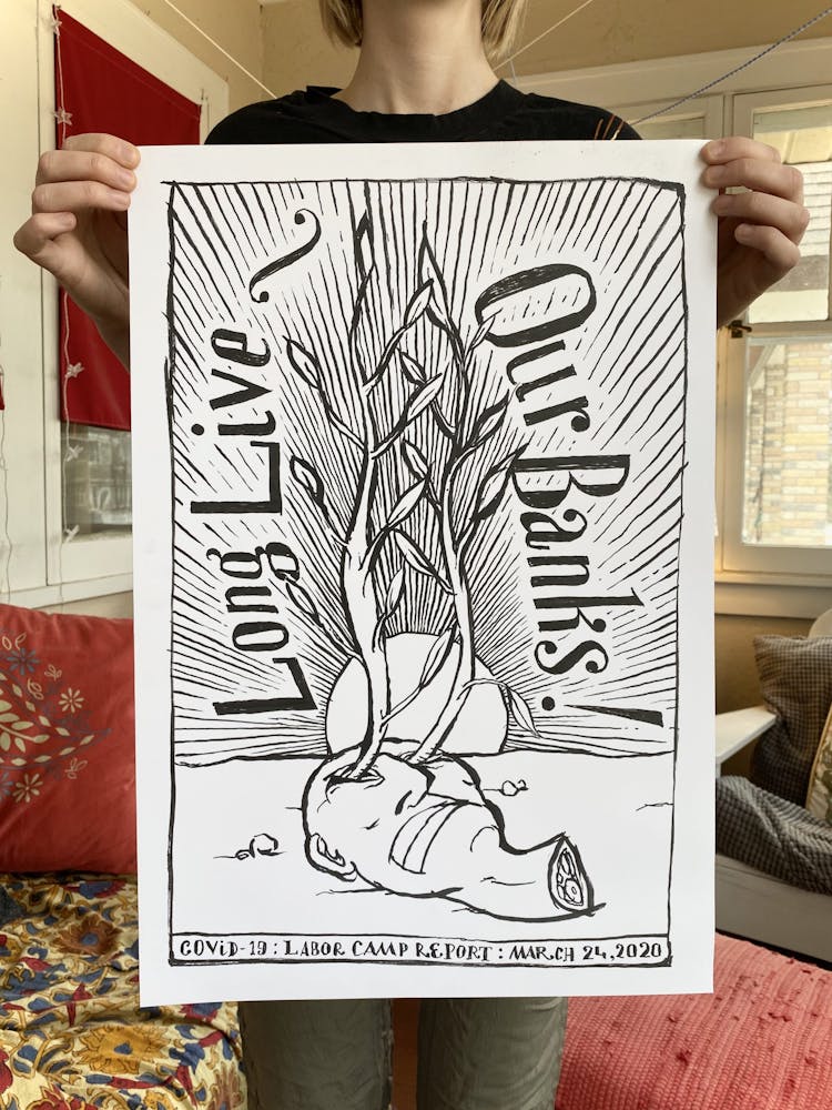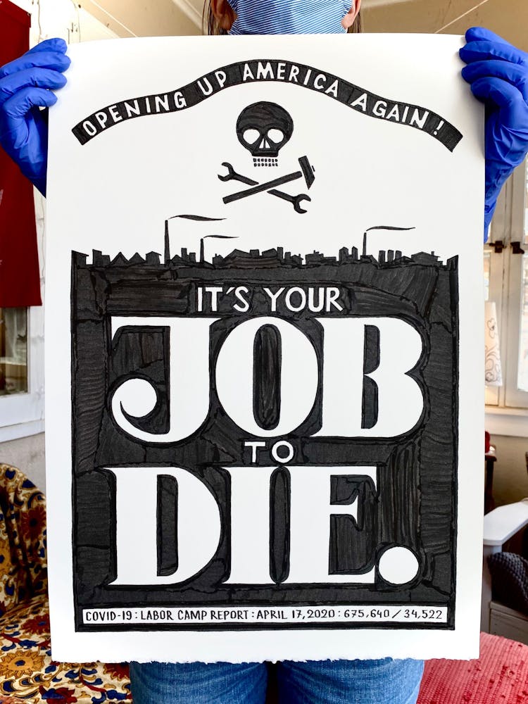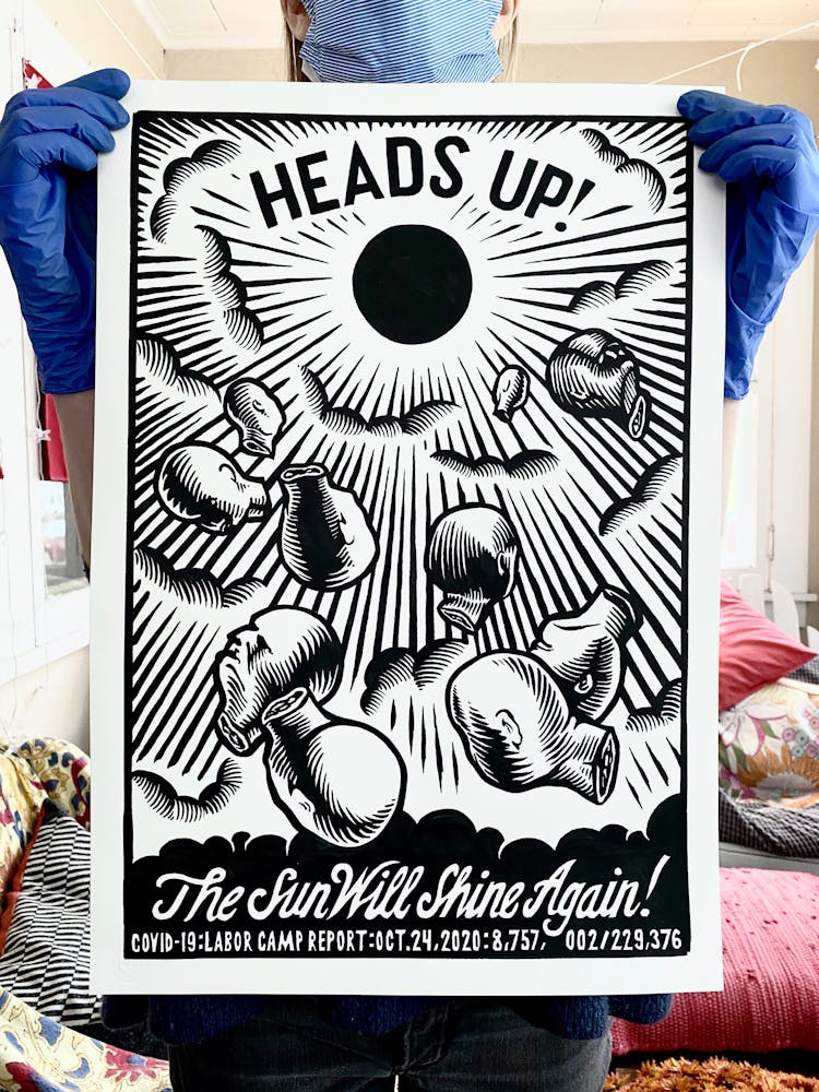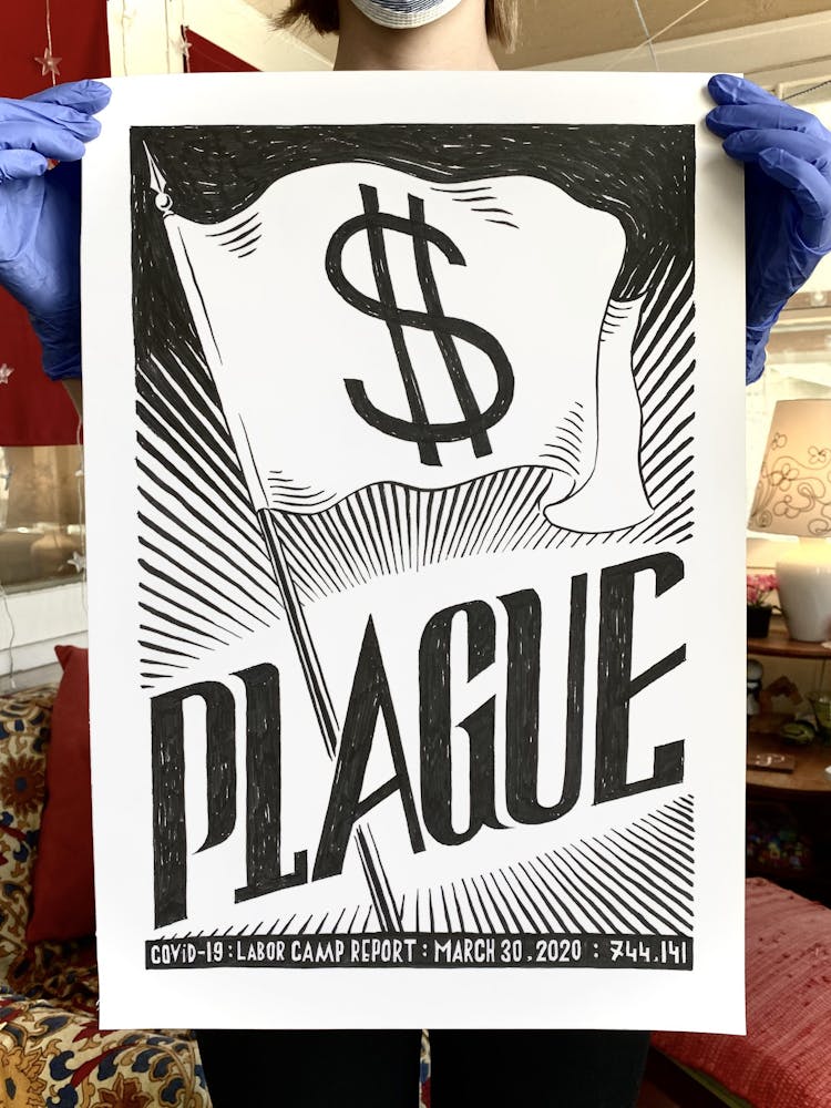 “I was, like us all, disoriented and disturbed and upset and afraid,” he recalls. “I had to do something to keep my mind off things.” An image came to mind—a severed head, seedlings sprouting from its eye sockets—and he drew, not quite knowing why. “I just wanted to draw it, and the idea of the economic implications of [COVID-19] was on my mind the whole time.” As with many of his works, Szyhalski hand-lettered text, adding a phrase that felt related: “Long live our banks!” He asked his daughter, Ava, to hold the drawing up, snapped an iPhone photo, and posted it on Instagram and Facebook, along with explanatory text: “Pondering the notion casually floated by our ‘leadership’ that some will need to die in order to save the ‘economy.’” He struck a nerve: his posts racked up hundreds of likes and comments and sparked DMs from around the country and the world, asking for more.