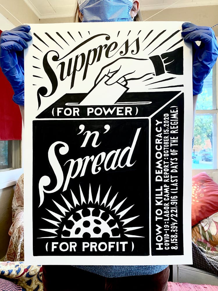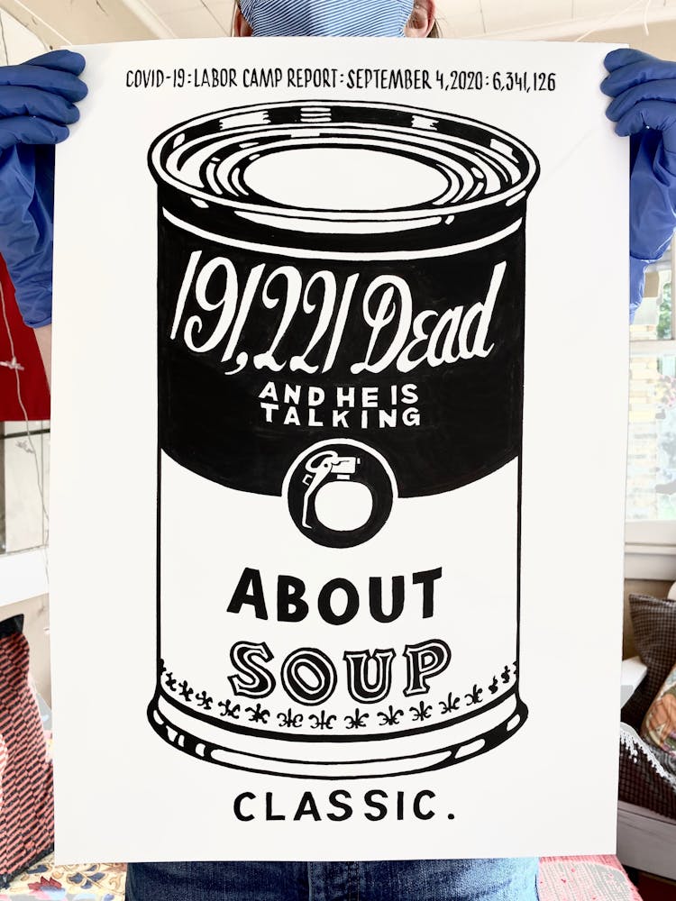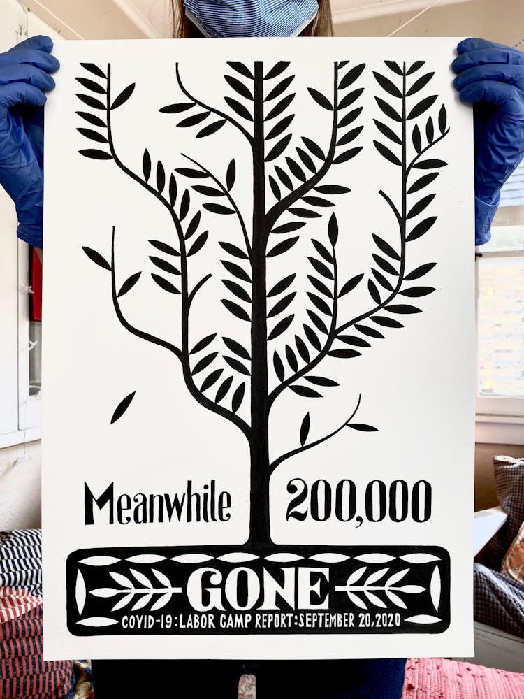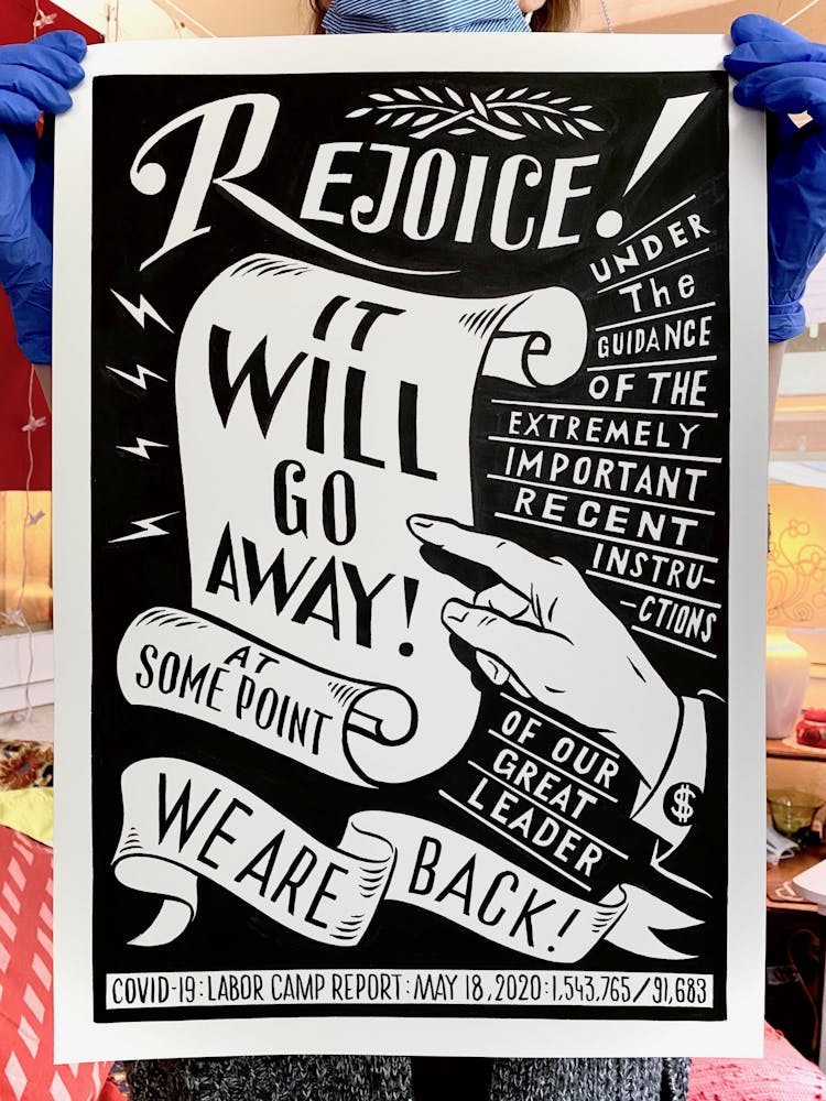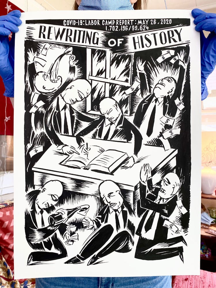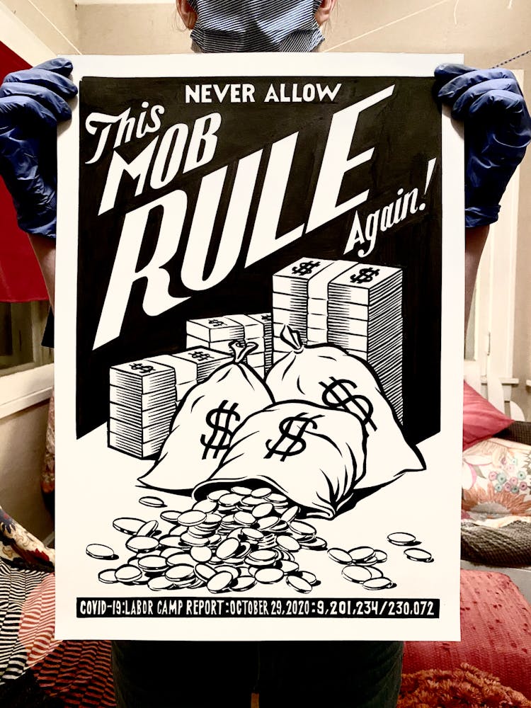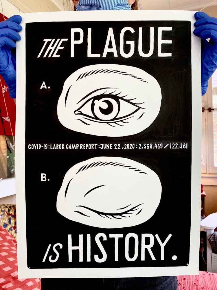 “I was, like us all, disoriented and disturbed and upset and afraid,” he recalls. “I had to do something to keep my mind off things.” An image came to mind—a severed head, seedlings sprouting from its eye sockets—and he drew, not quite knowing why. “I just wanted to draw it, and the idea of the economic implications of [COVID-19] was on my mind the whole time.” As with many of his works, Szyhalski hand-lettered text, adding a phrase that felt related: “Long live our banks!” He asked his daughter, Ava, to hold the drawing up, snapped an iPhone photo, and posted it on Instagram and Facebook, along with explanatory text: “Pondering the notion casually floated by our ‘leadership’ that some will need to die in order to save the ‘economy.’” He struck a nerve: his posts racked up hundreds of likes and comments and sparked DMs from around the country and the world, asking for more.