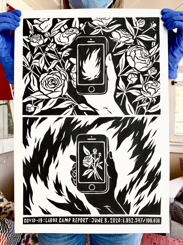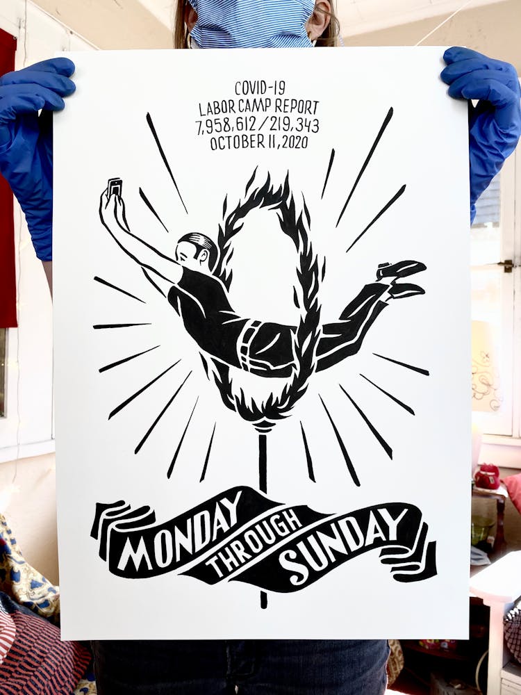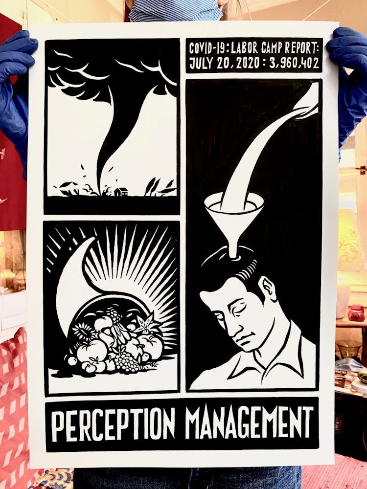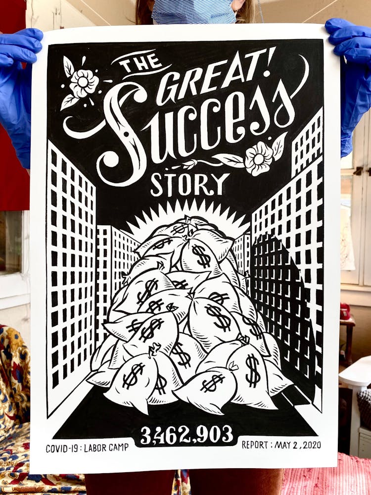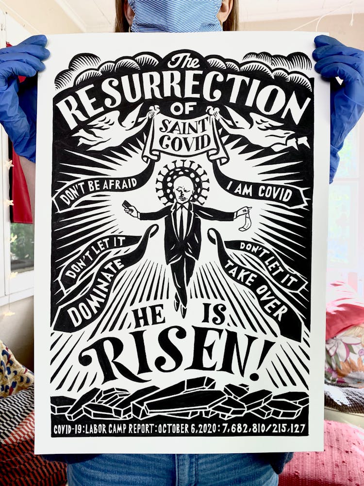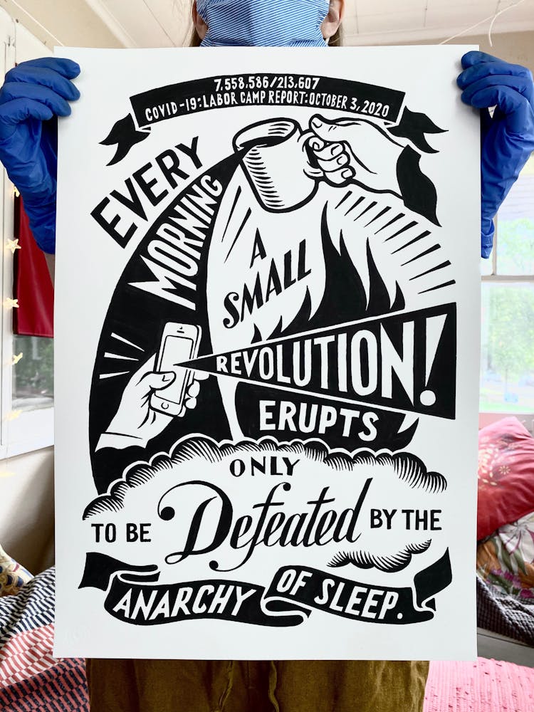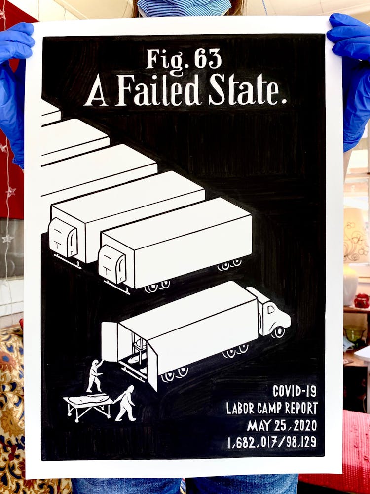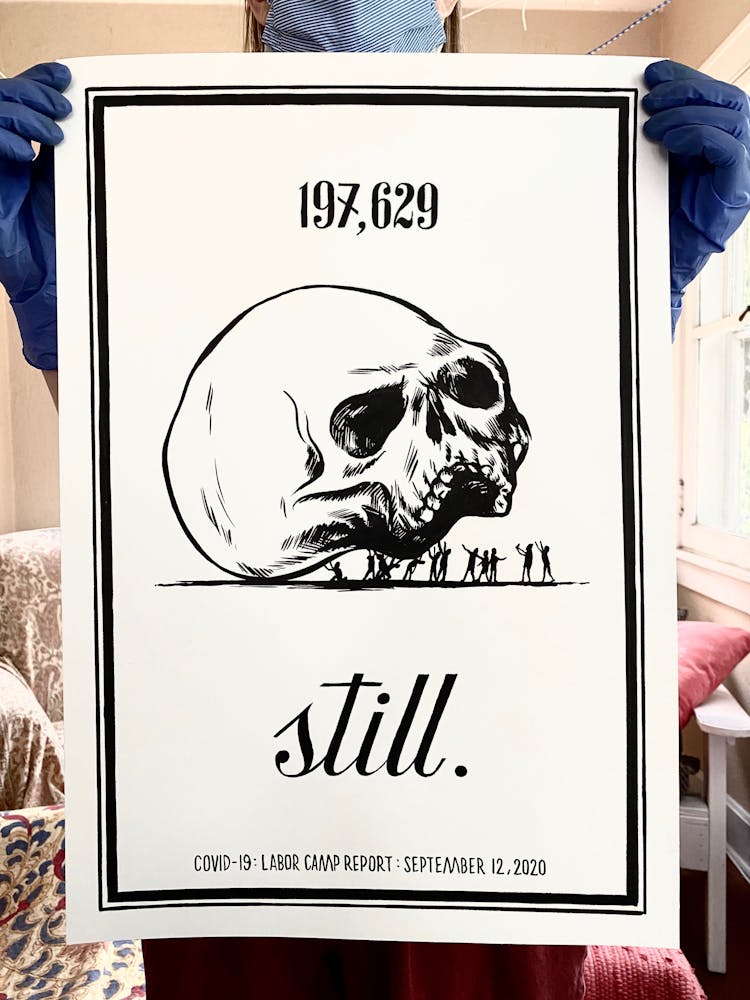 “I was, like us all, disoriented and disturbed and upset and afraid,” he recalls. “I had to do something to keep my mind off things.” An image came to mind—a severed head, seedlings sprouting from its eye sockets—and he drew, not quite knowing why. “I just wanted to draw it, and the idea of the economic implications of [COVID-19] was on my mind the whole time.” As with many of his works, Szyhalski hand-lettered text, adding a phrase that felt related: “Long live our banks!” He asked his daughter, Ava, to hold the drawing up, snapped an iPhone photo, and posted it on Instagram and Facebook, along with explanatory text: “Pondering the notion casually floated by our ‘leadership’ that some will need to die in order to save the ‘economy.’” He struck a nerve: his posts racked up hundreds of likes and comments and sparked DMs from around the country and the world, asking for more.