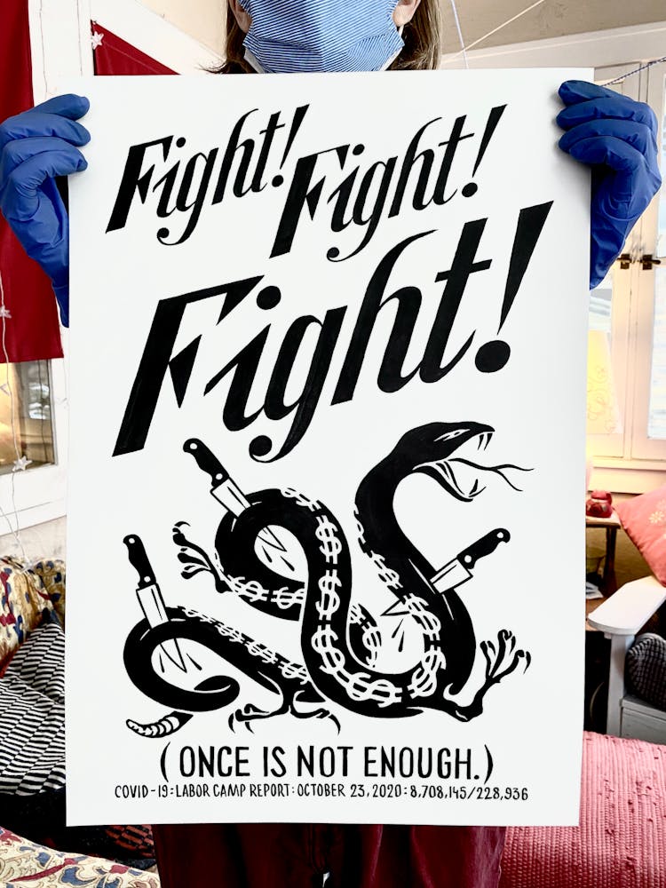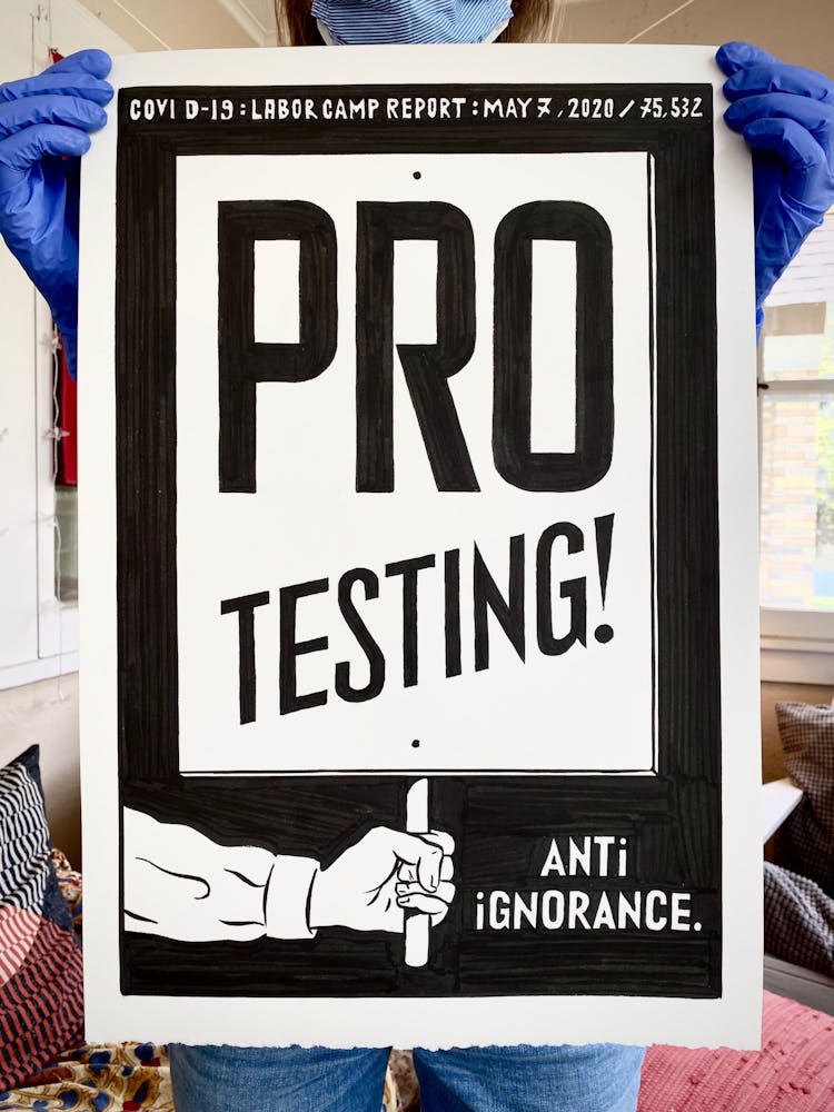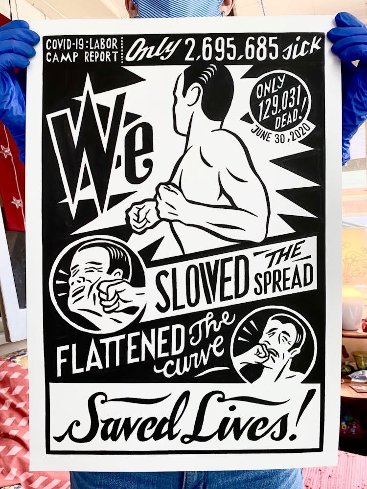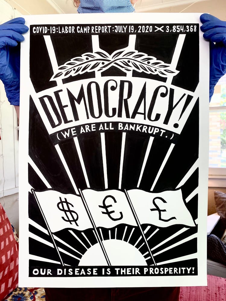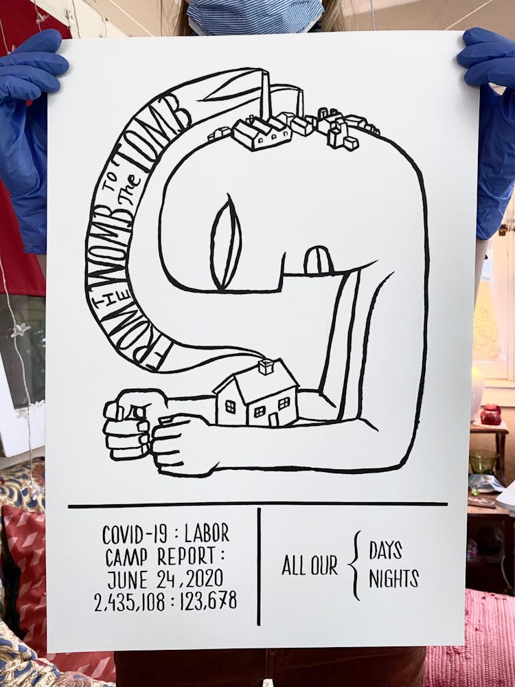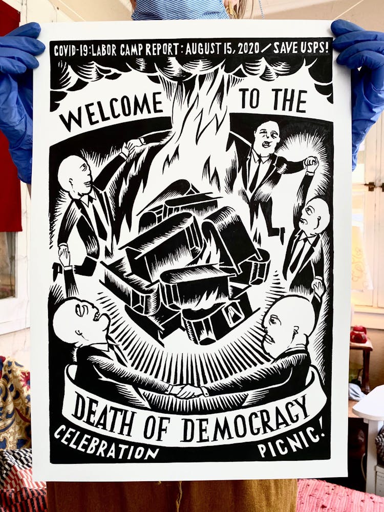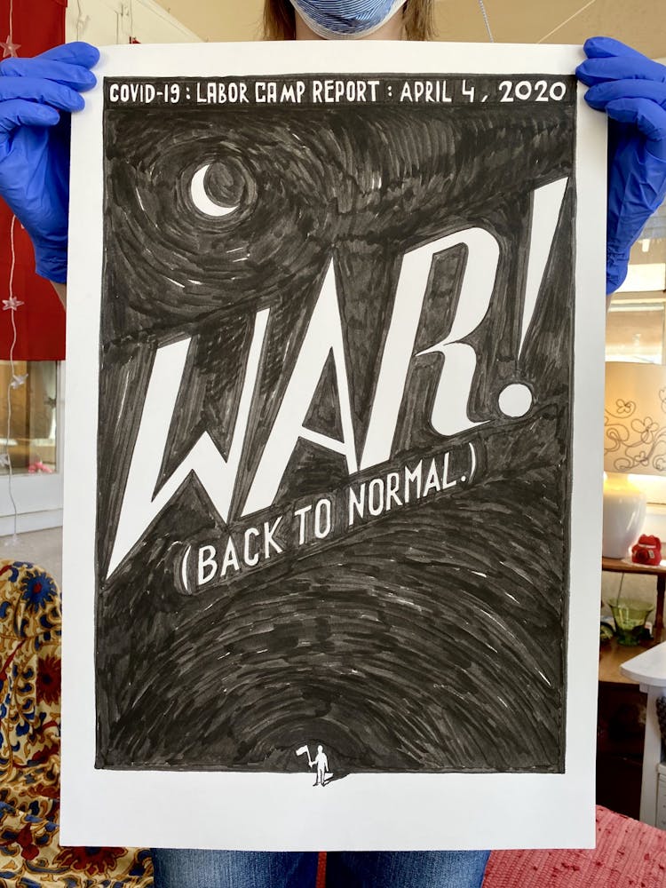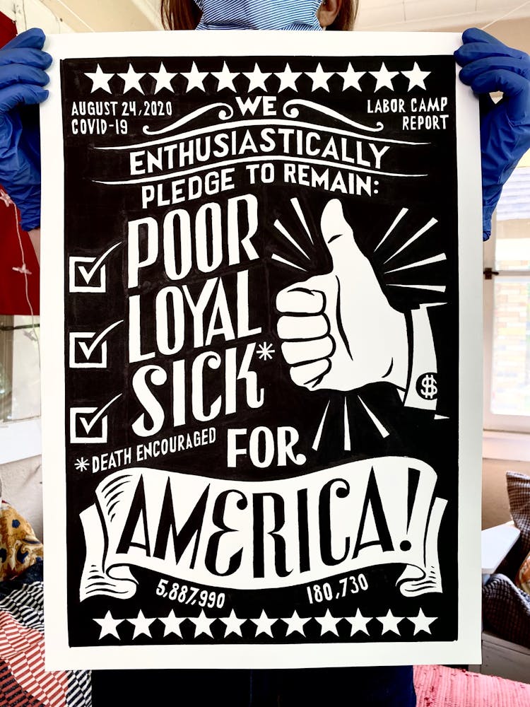 “I was, like us all, disoriented and disturbed and upset and afraid,” he recalls. “I had to do something to keep my mind off things.” An image came to mind—a severed head, seedlings sprouting from its eye sockets—and he drew, not quite knowing why. “I just wanted to draw it, and the idea of the economic implications of [COVID-19] was on my mind the whole time.” As with many of his works, Szyhalski hand-lettered text, adding a phrase that felt related: “Long live our banks!” He asked his daughter, Ava, to hold the drawing up, snapped an iPhone photo, and posted it on Instagram and Facebook, along with explanatory text: “Pondering the notion casually floated by our ‘leadership’ that some will need to die in order to save the ‘economy.’” He struck a nerve: his posts racked up hundreds of likes and comments and sparked DMs from around the country and the world, asking for more.