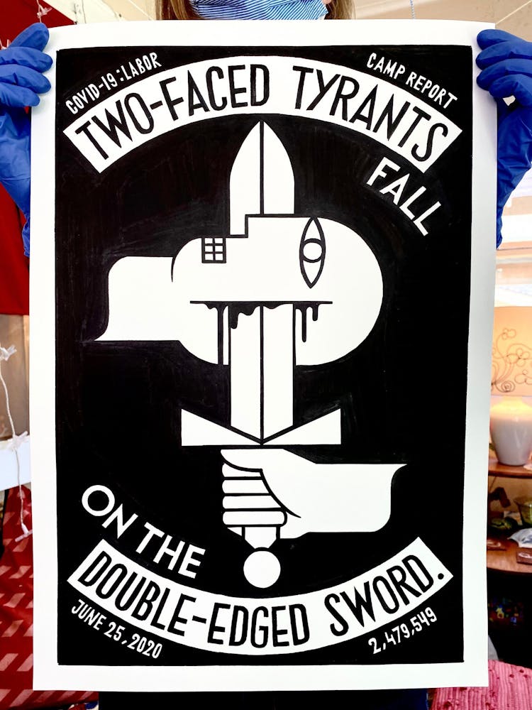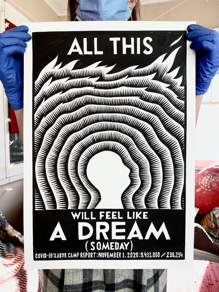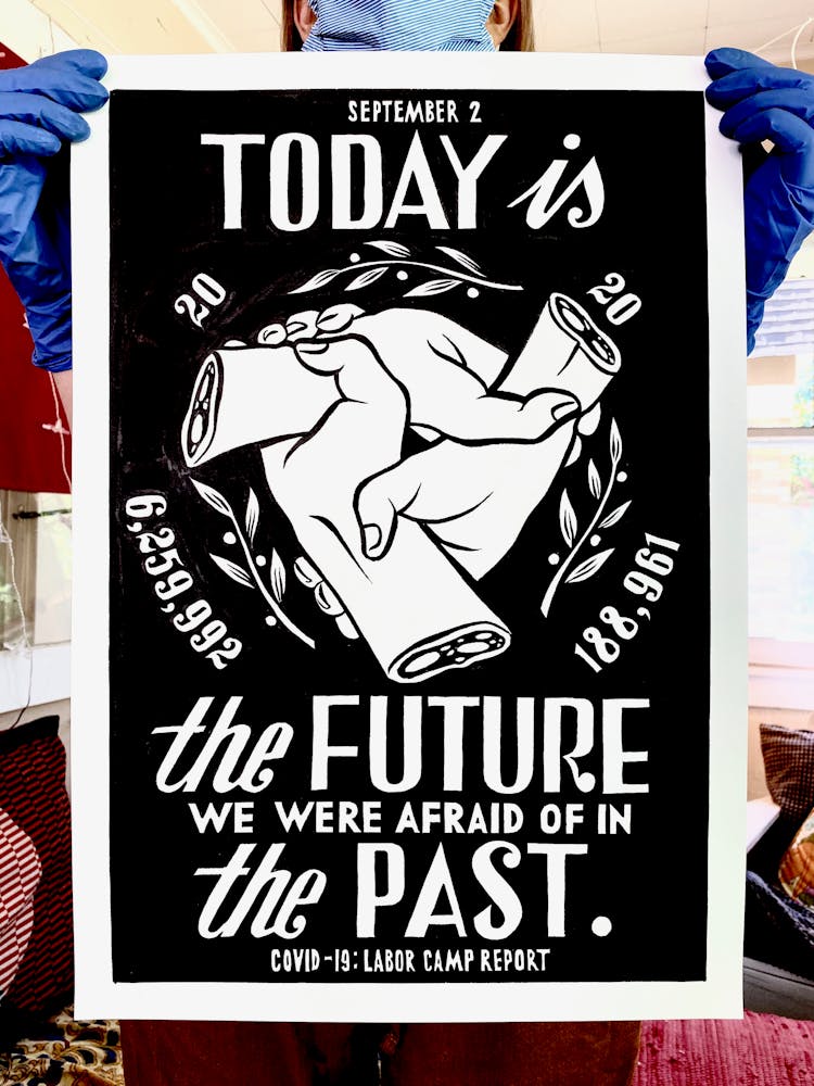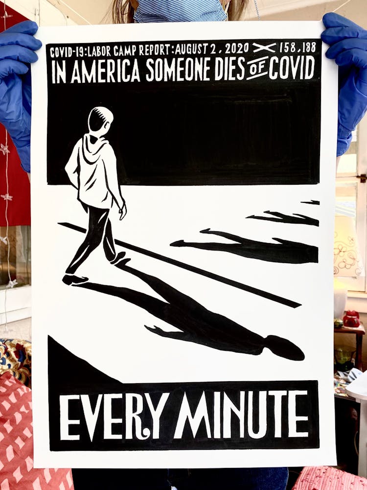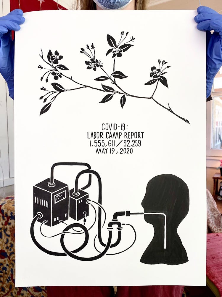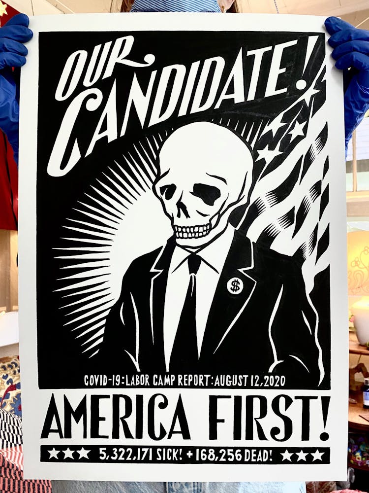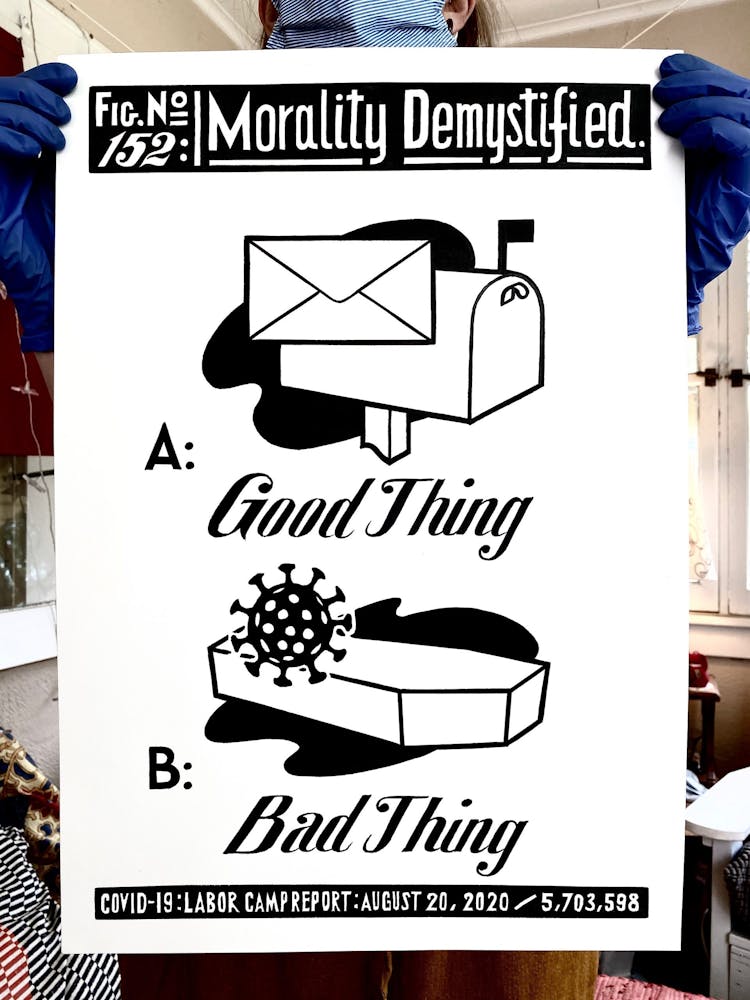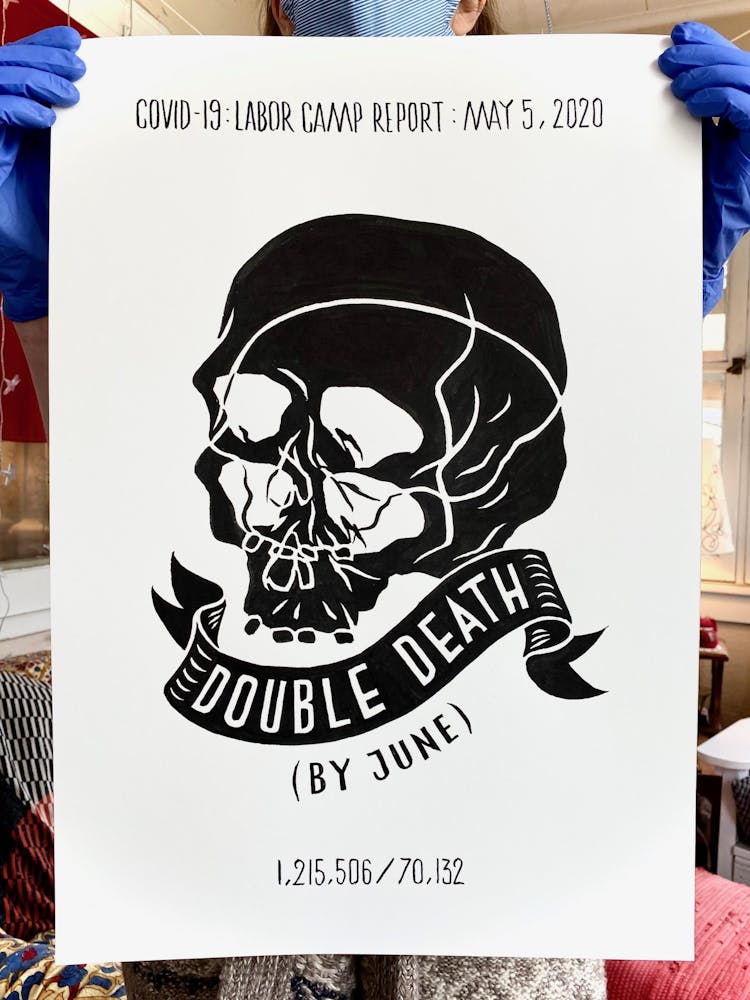 “I was, like us all, disoriented and disturbed and upset and afraid,” he recalls. “I had to do something to keep my mind off things.” An image came to mind—a severed head, seedlings sprouting from its eye sockets—and he drew, not quite knowing why. “I just wanted to draw it, and the idea of the economic implications of [COVID-19] was on my mind the whole time.” As with many of his works, Szyhalski hand-lettered text, adding a phrase that felt related: “Long live our banks!” He asked his daughter, Ava, to hold the drawing up, snapped an iPhone photo, and posted it on Instagram and Facebook, along with explanatory text: “Pondering the notion casually floated by our ‘leadership’ that some will need to die in order to save the ‘economy.’” He struck a nerve: his posts racked up hundreds of likes and comments and sparked DMs from around the country and the world, asking for more.