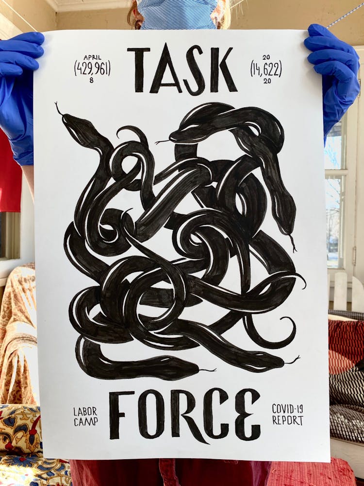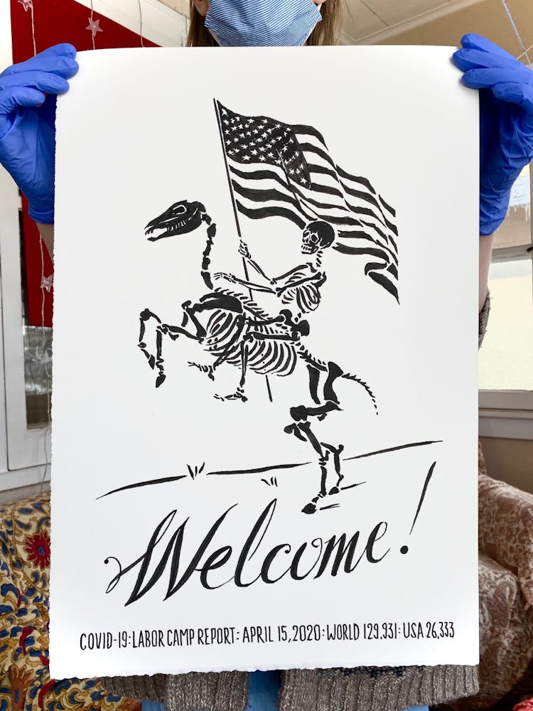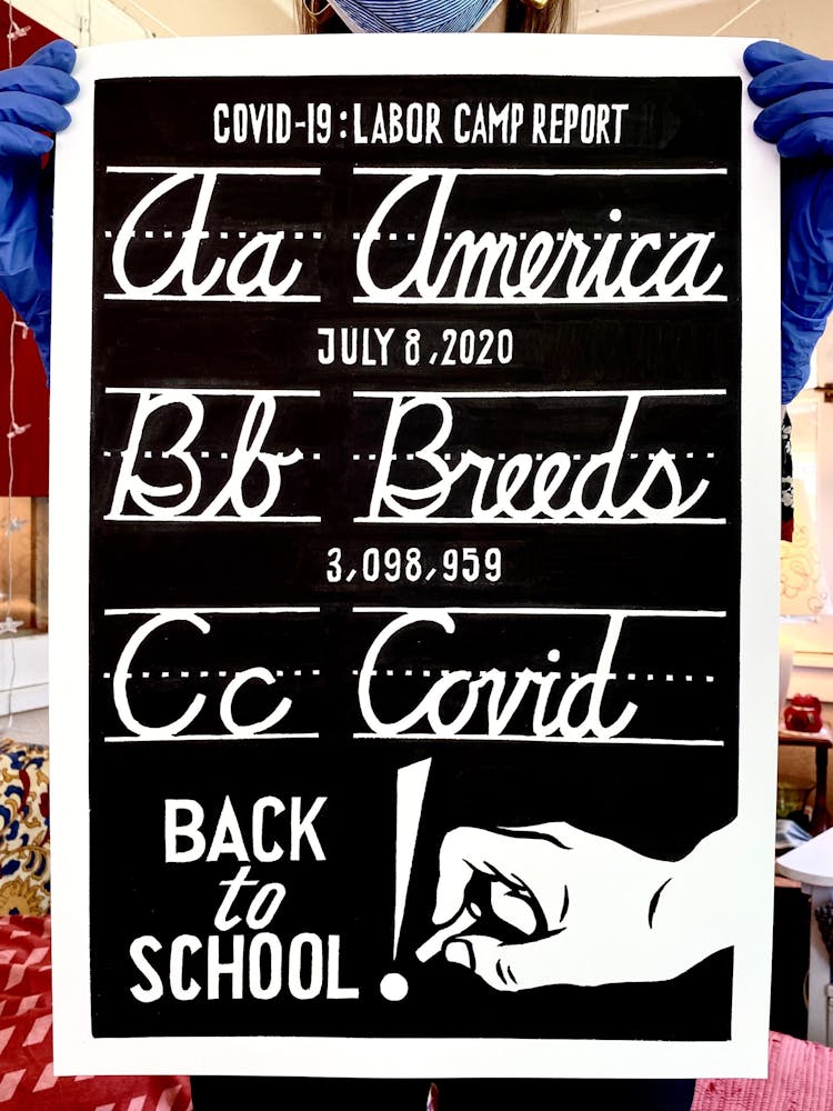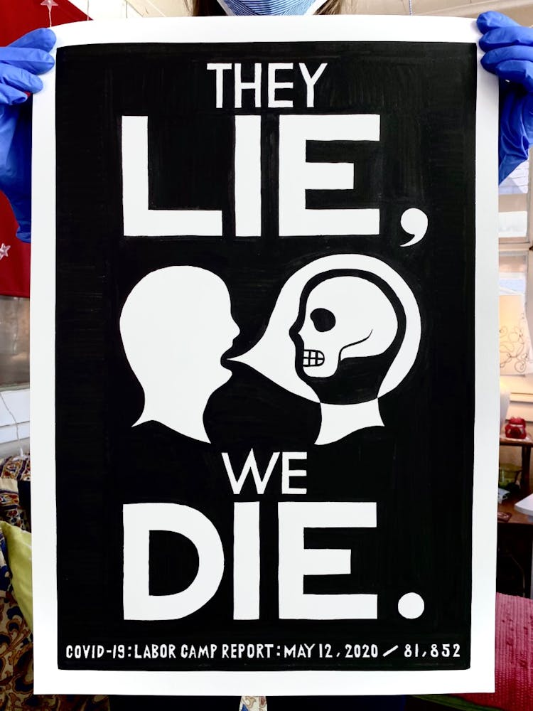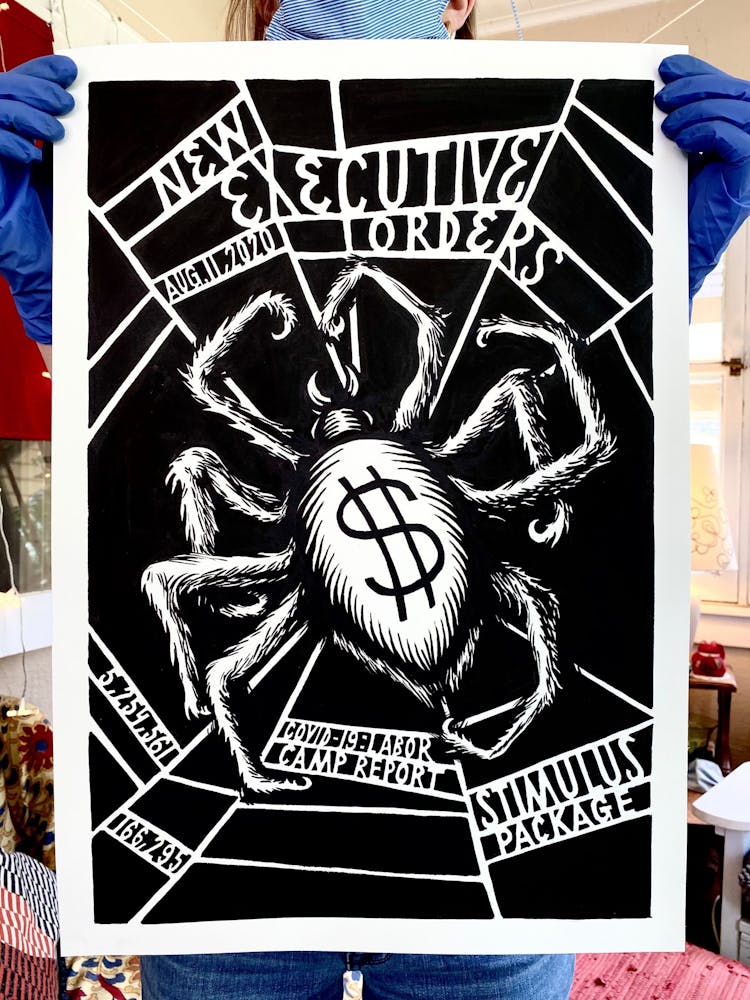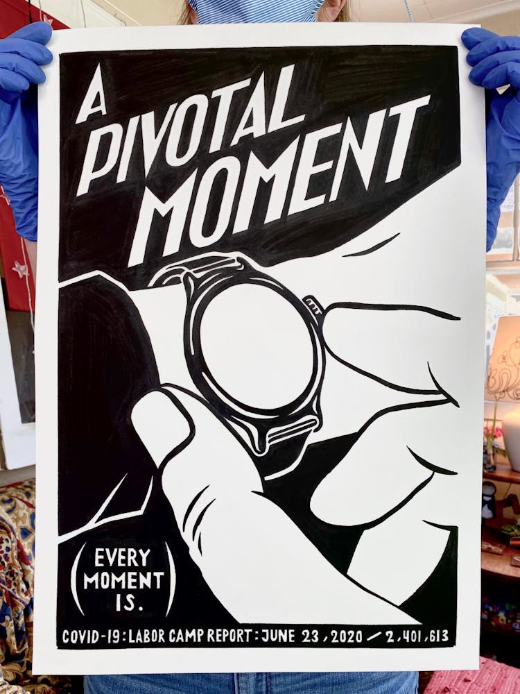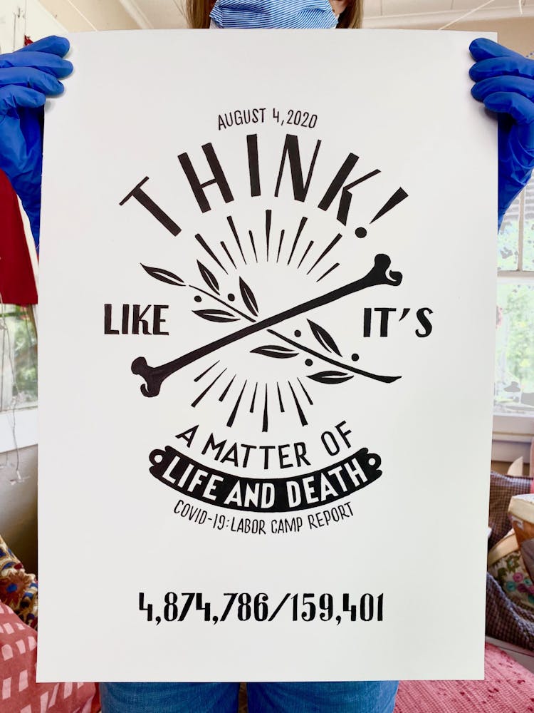 “I was, like us all, disoriented and disturbed and upset and afraid,” he recalls. “I had to do something to keep my mind off things.” An image came to mind—a severed head, seedlings sprouting from its eye sockets—and he drew, not quite knowing why. “I just wanted to draw it, and the idea of the economic implications of [COVID-19] was on my mind the whole time.” As with many of his works, Szyhalski hand-lettered text, adding a phrase that felt related: “Long live our banks!” He asked his daughter, Ava, to hold the drawing up, snapped an iPhone photo, and posted it on Instagram and Facebook, along with explanatory text: “Pondering the notion casually floated by our ‘leadership’ that some will need to die in order to save the ‘economy.’” He struck a nerve: his posts racked up hundreds of likes and comments and sparked DMs from around the country and the world, asking for more.