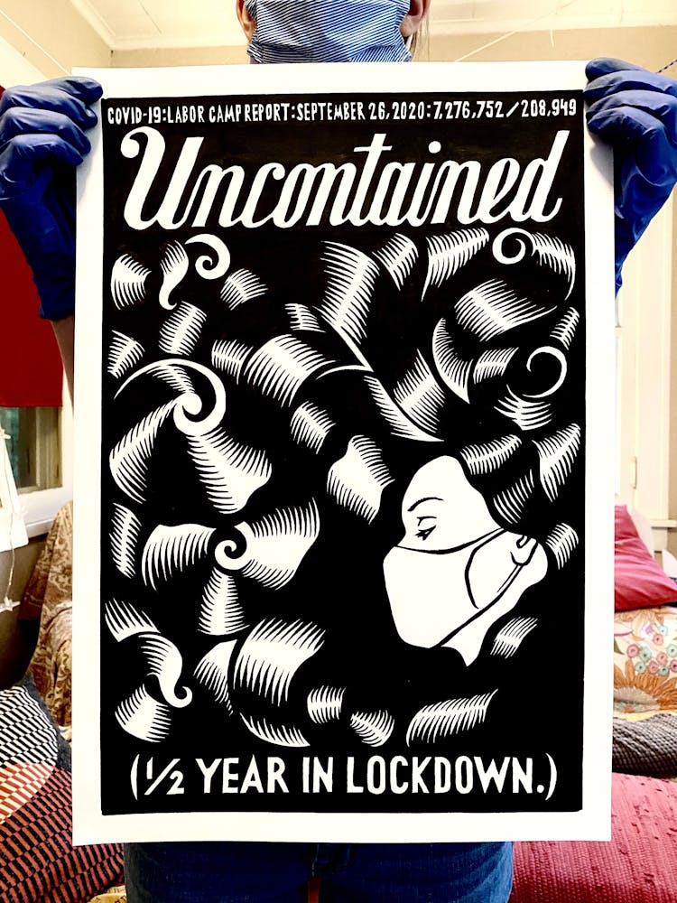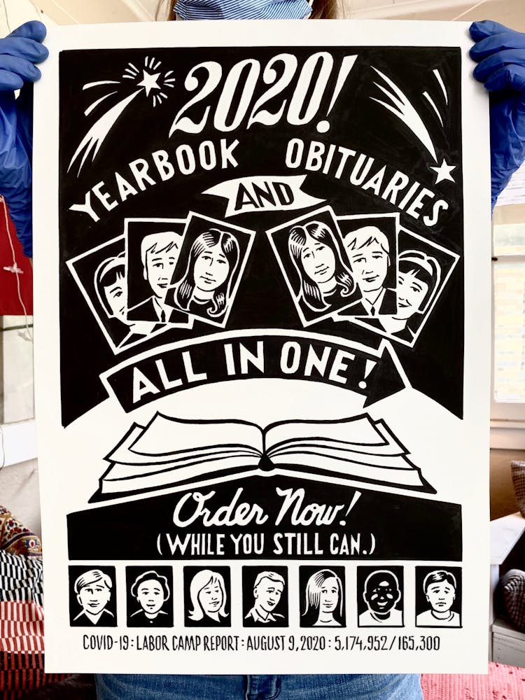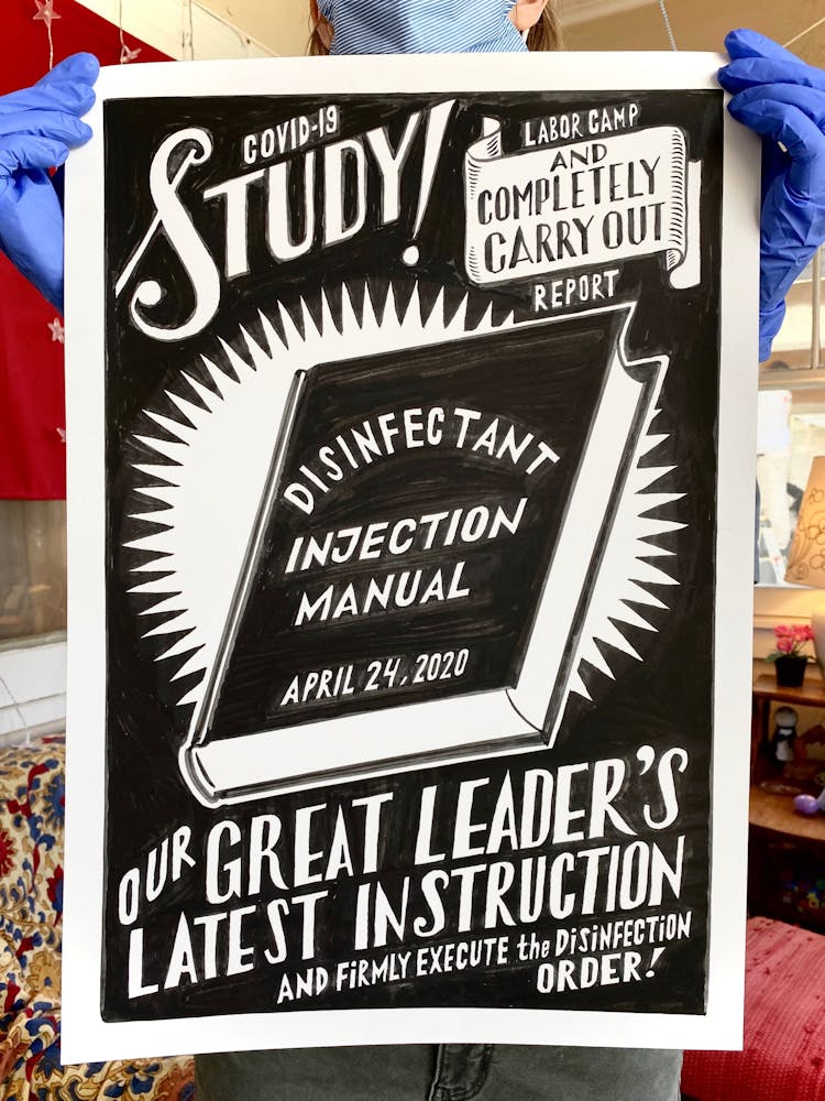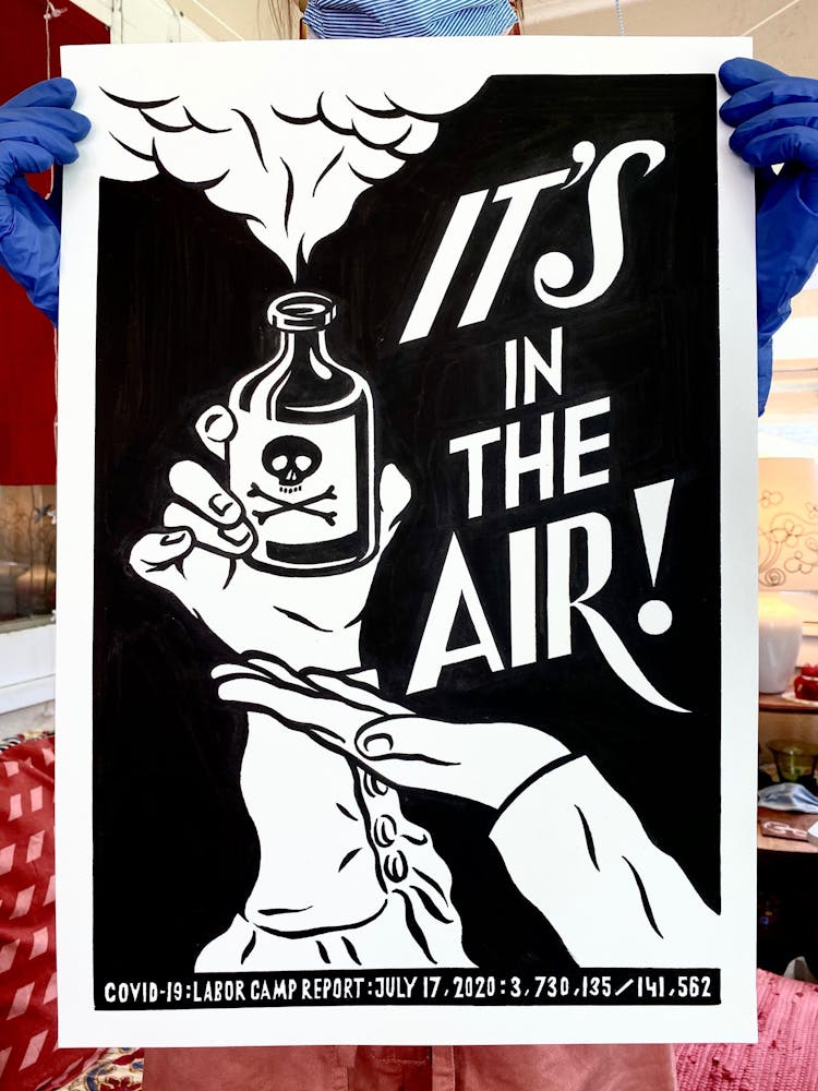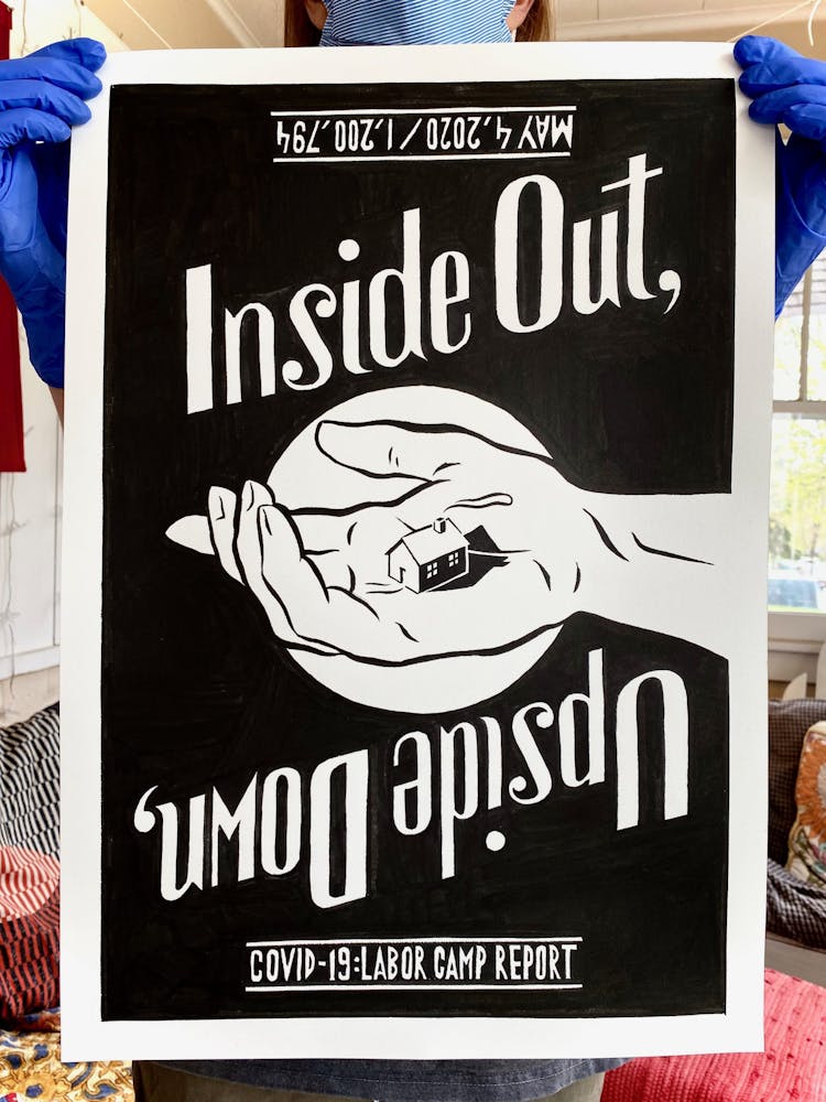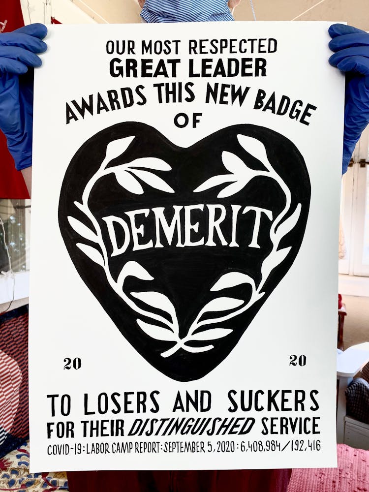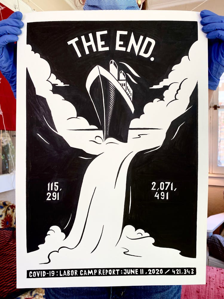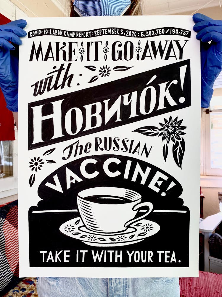 “I was, like us all, disoriented and disturbed and upset and afraid,” he recalls. “I had to do something to keep my mind off things.” An image came to mind—a severed head, seedlings sprouting from its eye sockets—and he drew, not quite knowing why. “I just wanted to draw it, and the idea of the economic implications of [COVID-19] was on my mind the whole time.” As with many of his works, Szyhalski hand-lettered text, adding a phrase that felt related: “Long live our banks!” He asked his daughter, Ava, to hold the drawing up, snapped an iPhone photo, and posted it on Instagram and Facebook, along with explanatory text: “Pondering the notion casually floated by our ‘leadership’ that some will need to die in order to save the ‘economy.’” He struck a nerve: his posts racked up hundreds of likes and comments and sparked DMs from around the country and the world, asking for more.