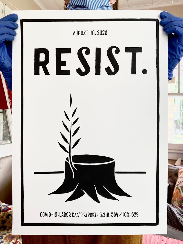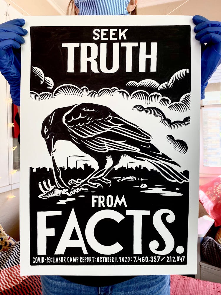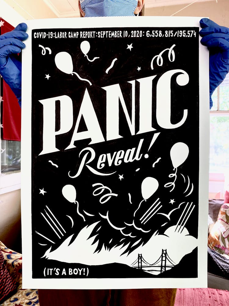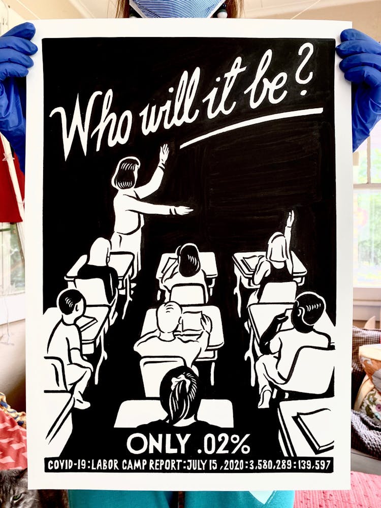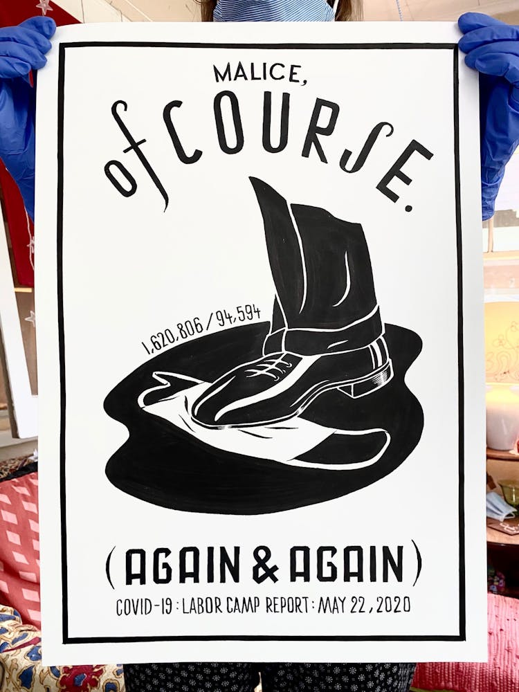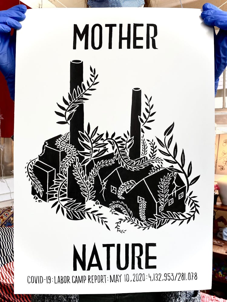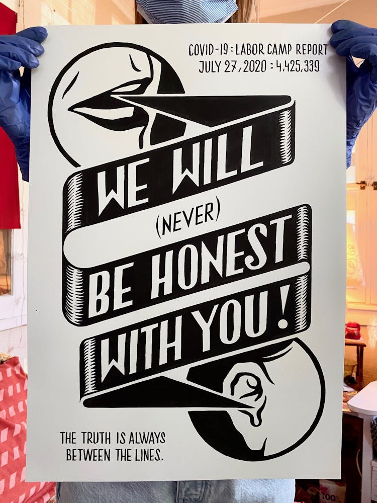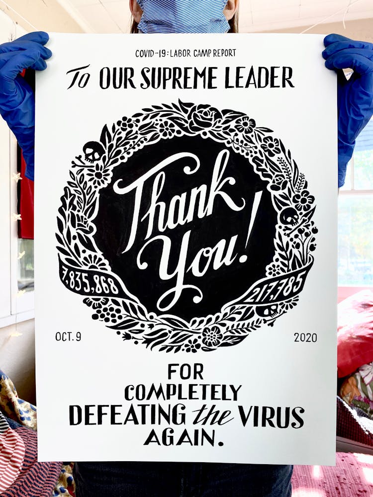 “I was, like us all, disoriented and disturbed and upset and afraid,” he recalls. “I had to do something to keep my mind off things.” An image came to mind—a severed head, seedlings sprouting from its eye sockets—and he drew, not quite knowing why. “I just wanted to draw it, and the idea of the economic implications of [COVID-19] was on my mind the whole time.” As with many of his works, Szyhalski hand-lettered text, adding a phrase that felt related: “Long live our banks!” He asked his daughter, Ava, to hold the drawing up, snapped an iPhone photo, and posted it on Instagram and Facebook, along with explanatory text: “Pondering the notion casually floated by our ‘leadership’ that some will need to die in order to save the ‘economy.’” He struck a nerve: his posts racked up hundreds of likes and comments and sparked DMs from around the country and the world, asking for more.