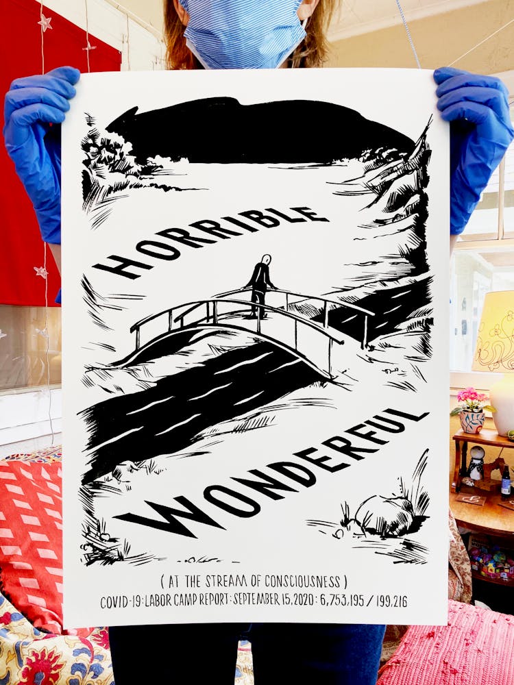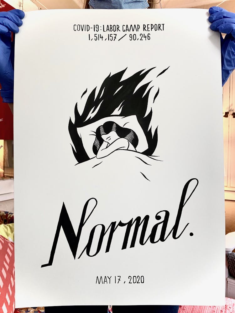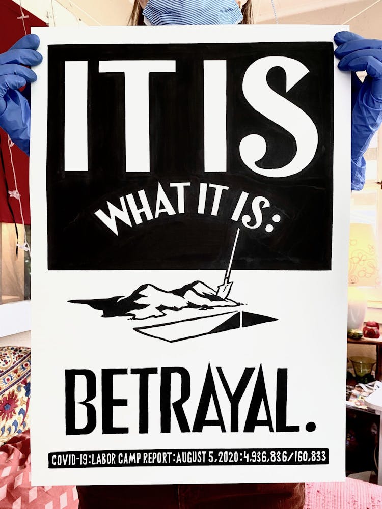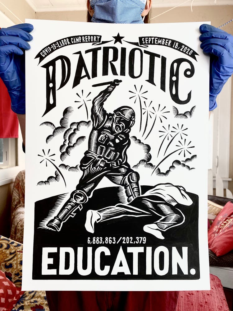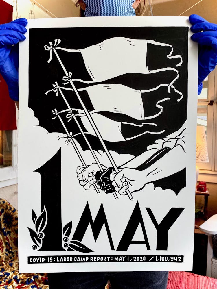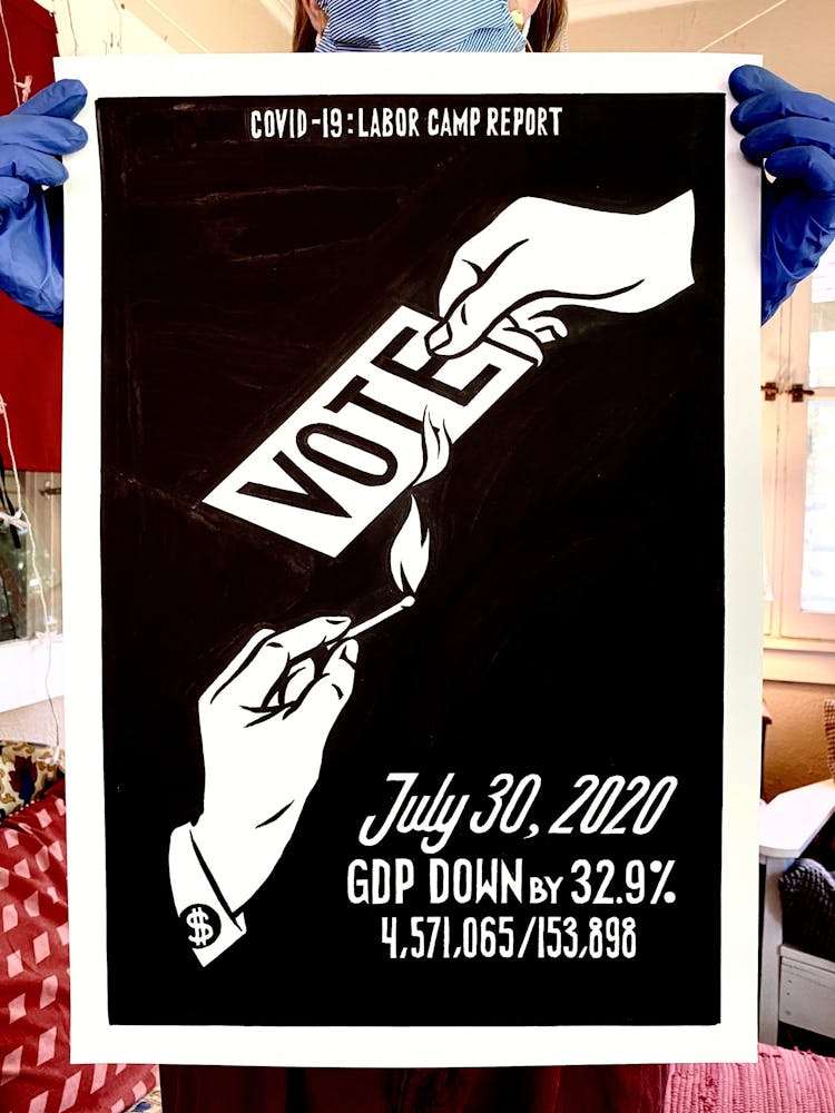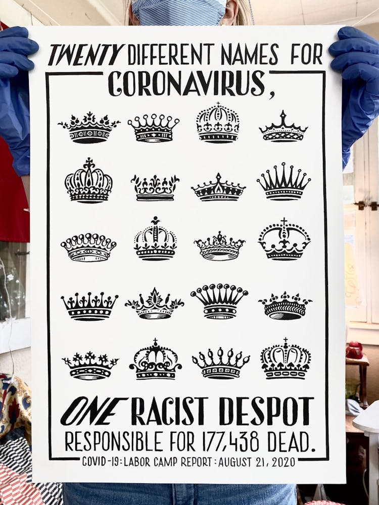 “I was, like us all, disoriented and disturbed and upset and afraid,” he recalls. “I had to do something to keep my mind off things.” An image came to mind—a severed head, seedlings sprouting from its eye sockets—and he drew, not quite knowing why. “I just wanted to draw it, and the idea of the economic implications of [COVID-19] was on my mind the whole time.” As with many of his works, Szyhalski hand-lettered text, adding a phrase that felt related: “Long live our banks!” He asked his daughter, Ava, to hold the drawing up, snapped an iPhone photo, and posted it on Instagram and Facebook, along with explanatory text: “Pondering the notion casually floated by our ‘leadership’ that some will need to die in order to save the ‘economy.’” He struck a nerve: his posts racked up hundreds of likes and comments and sparked DMs from around the country and the world, asking for more.