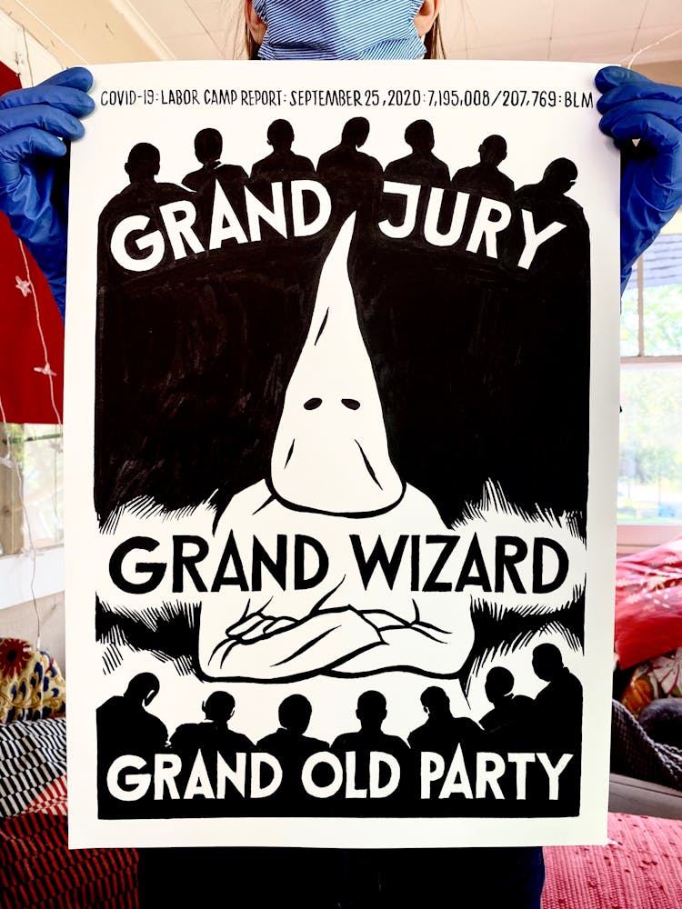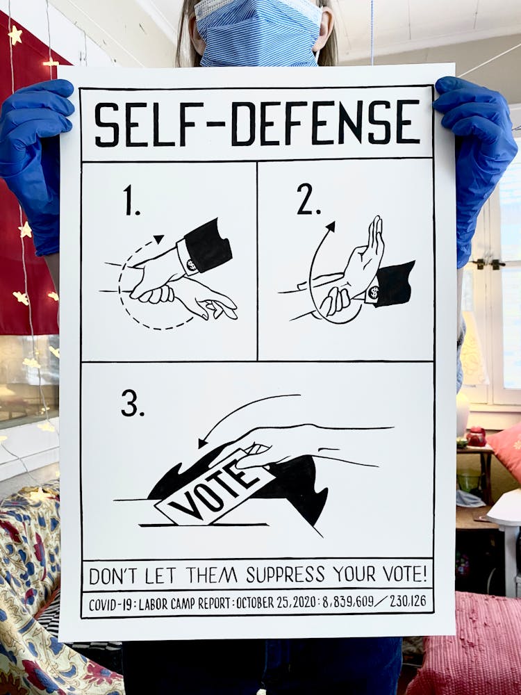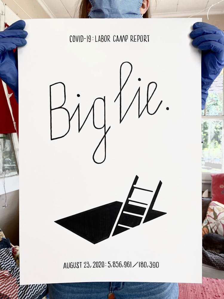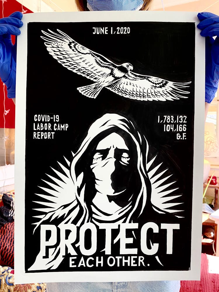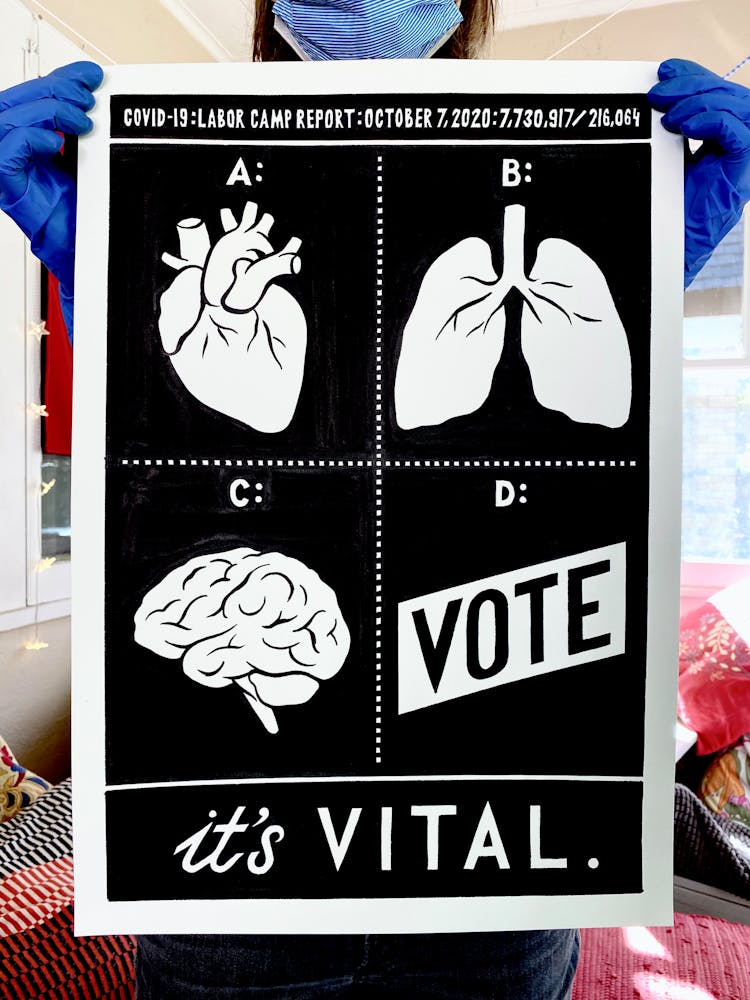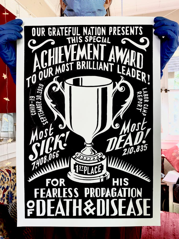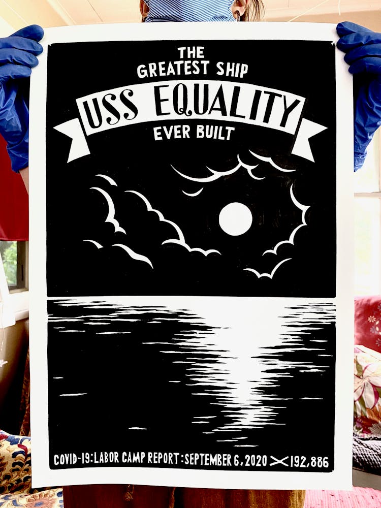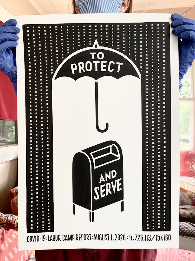 “I was, like us all, disoriented and disturbed and upset and afraid,” he recalls. “I had to do something to keep my mind off things.” An image came to mind—a severed head, seedlings sprouting from its eye sockets—and he drew, not quite knowing why. “I just wanted to draw it, and the idea of the economic implications of [COVID-19] was on my mind the whole time.” As with many of his works, Szyhalski hand-lettered text, adding a phrase that felt related: “Long live our banks!” He asked his daughter, Ava, to hold the drawing up, snapped an iPhone photo, and posted it on Instagram and Facebook, along with explanatory text: “Pondering the notion casually floated by our ‘leadership’ that some will need to die in order to save the ‘economy.’” He struck a nerve: his posts racked up hundreds of likes and comments and sparked DMs from around the country and the world, asking for more.