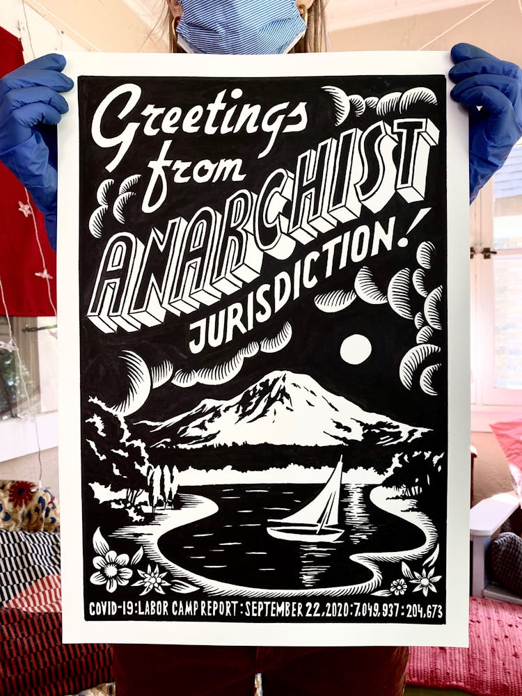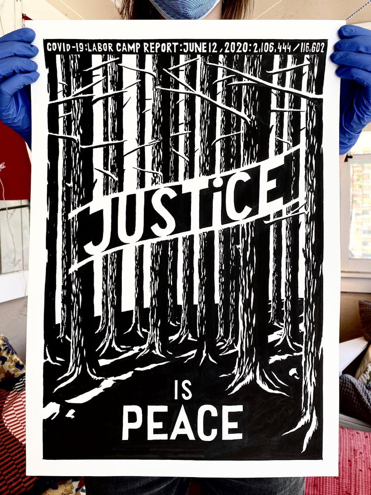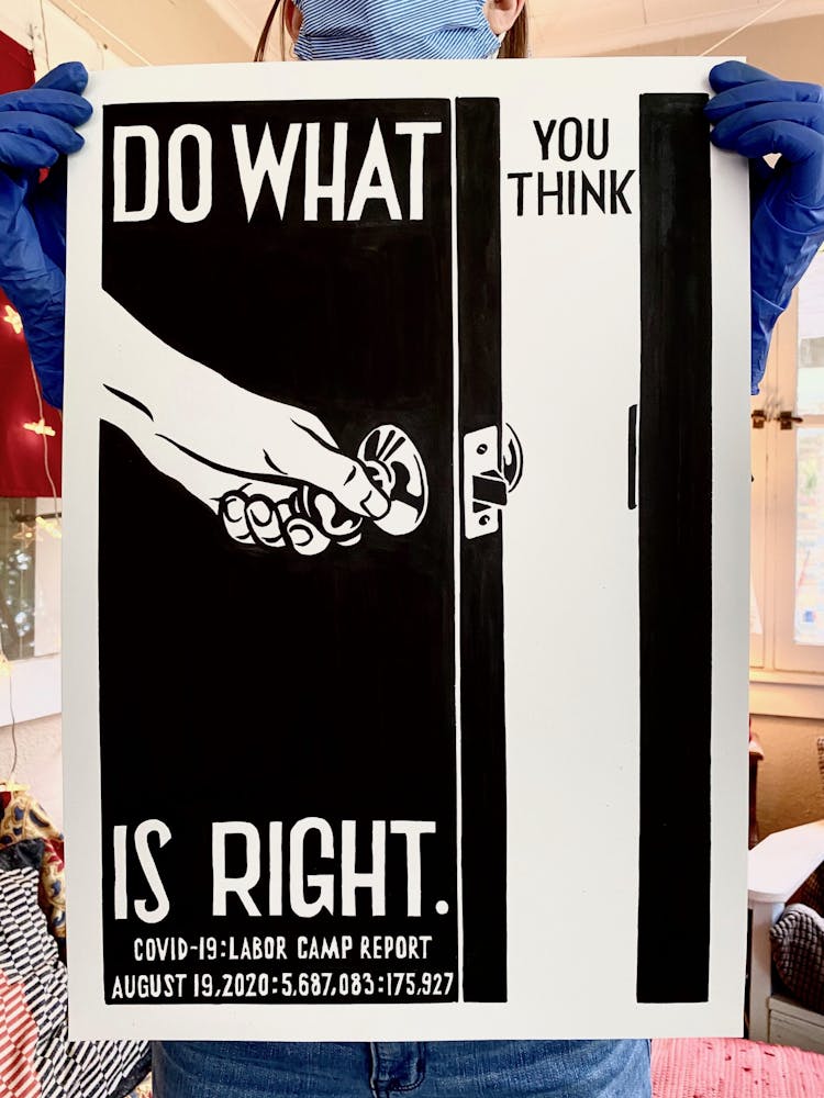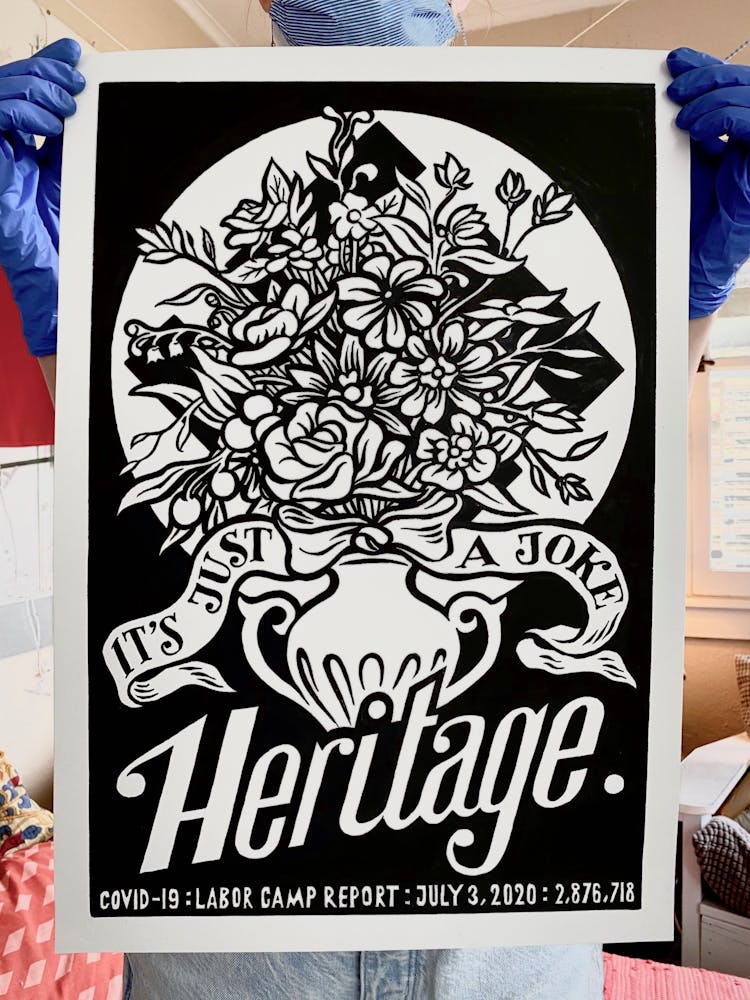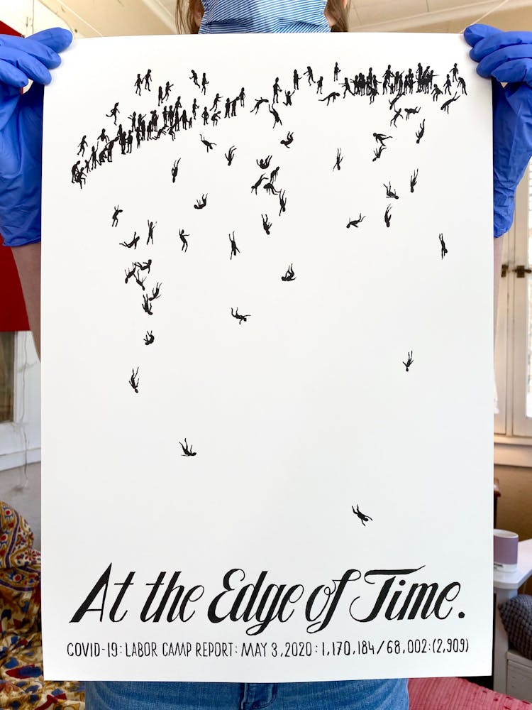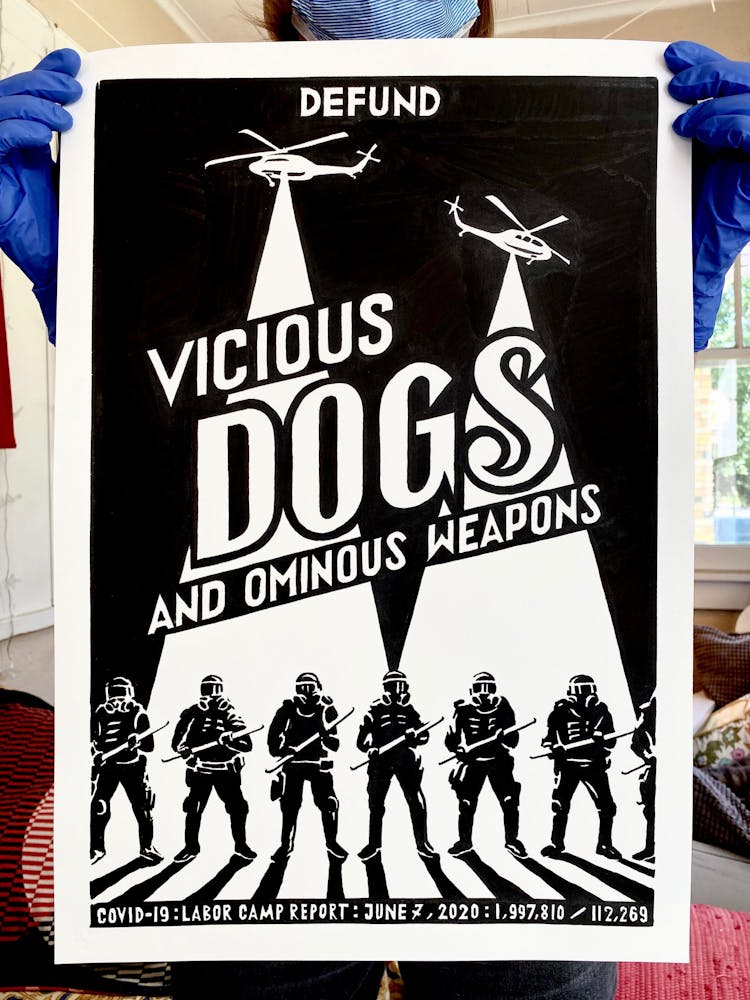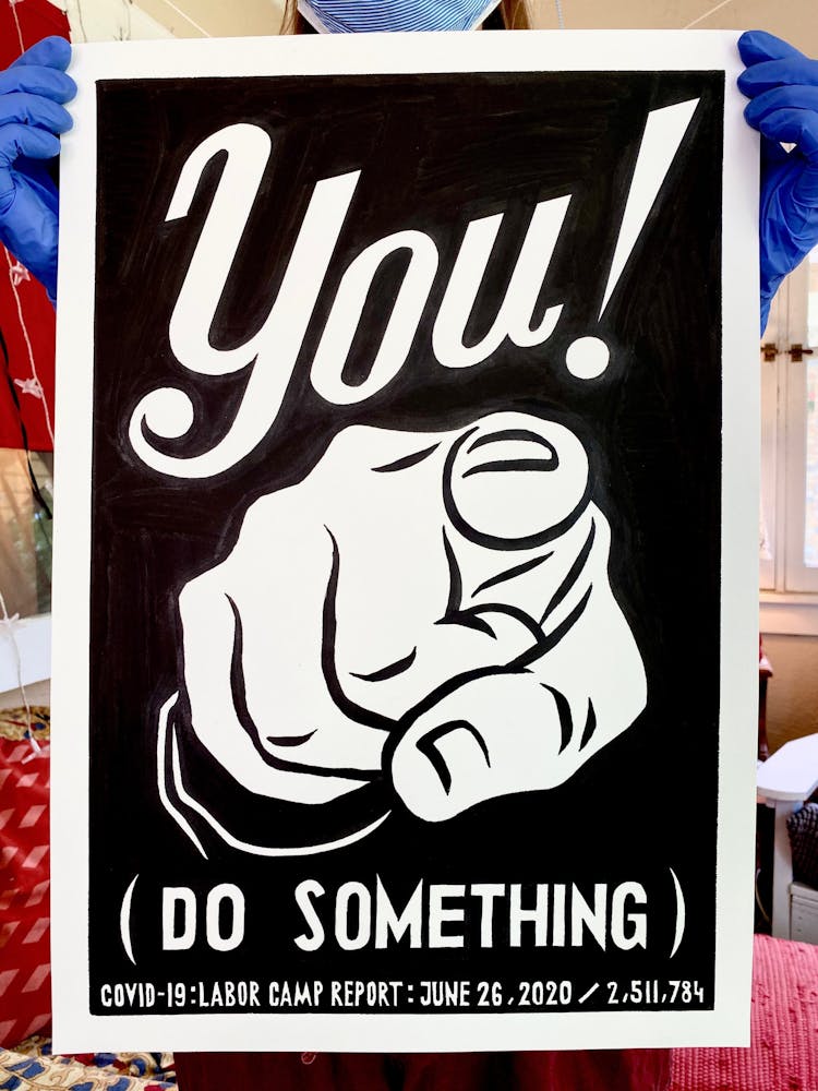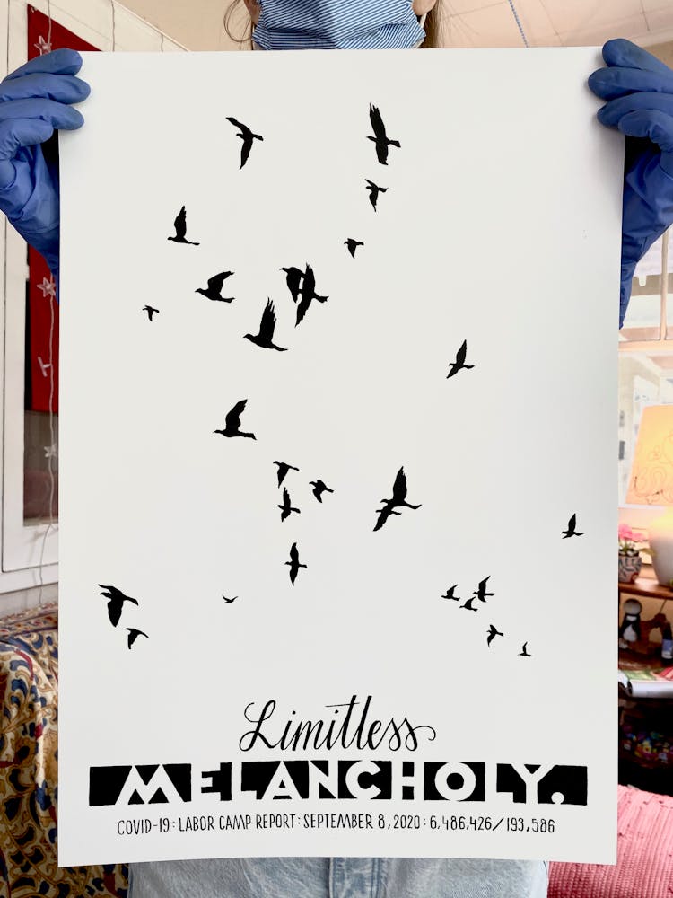 “I was, like us all, disoriented and disturbed and upset and afraid,” he recalls. “I had to do something to keep my mind off things.” An image came to mind—a severed head, seedlings sprouting from its eye sockets—and he drew, not quite knowing why. “I just wanted to draw it, and the idea of the economic implications of [COVID-19] was on my mind the whole time.” As with many of his works, Szyhalski hand-lettered text, adding a phrase that felt related: “Long live our banks!” He asked his daughter, Ava, to hold the drawing up, snapped an iPhone photo, and posted it on Instagram and Facebook, along with explanatory text: “Pondering the notion casually floated by our ‘leadership’ that some will need to die in order to save the ‘economy.’” He struck a nerve: his posts racked up hundreds of likes and comments and sparked DMs from around the country and the world, asking for more.