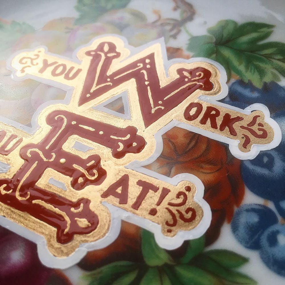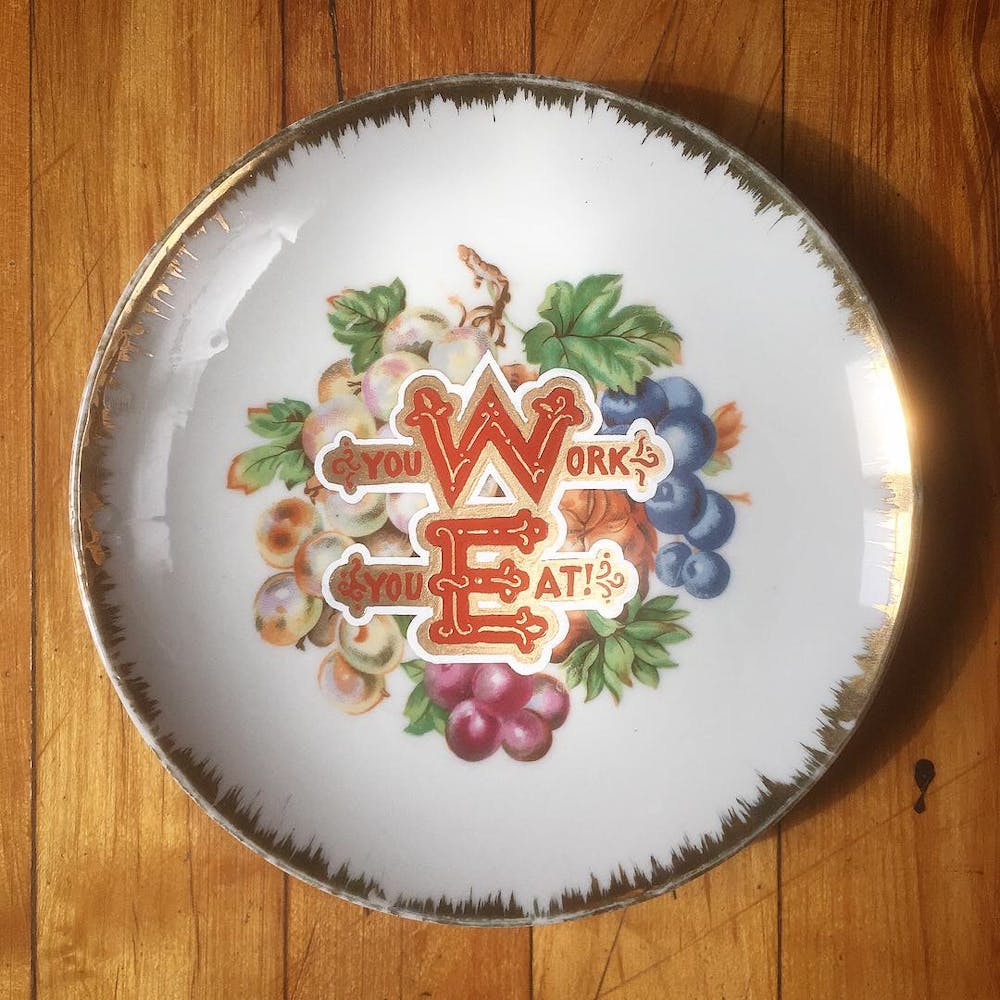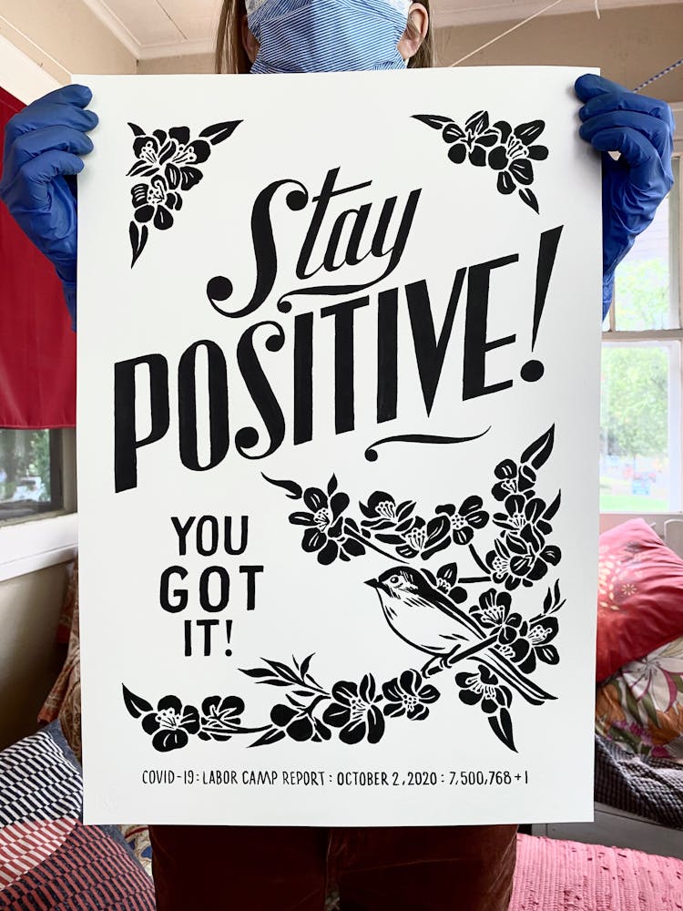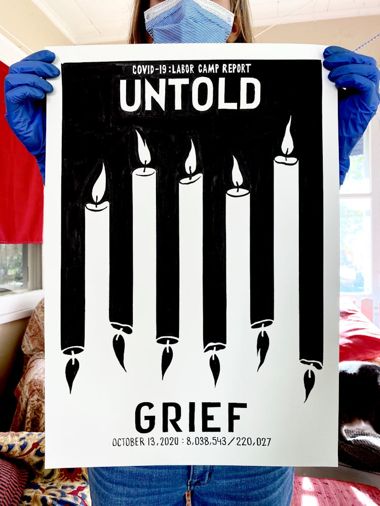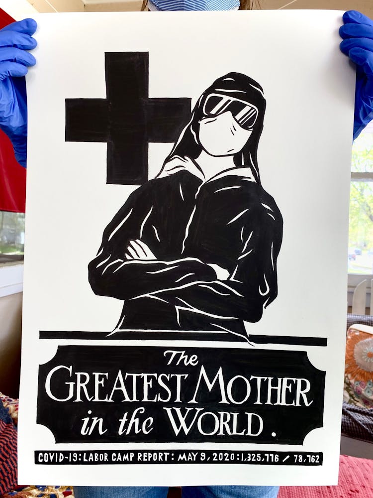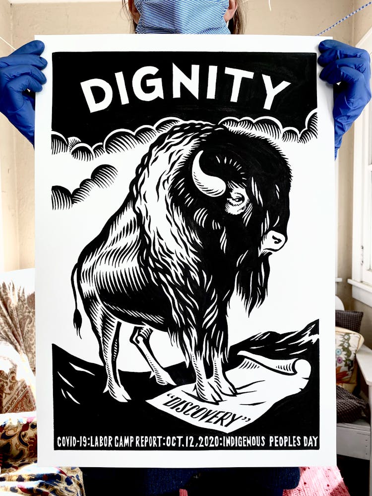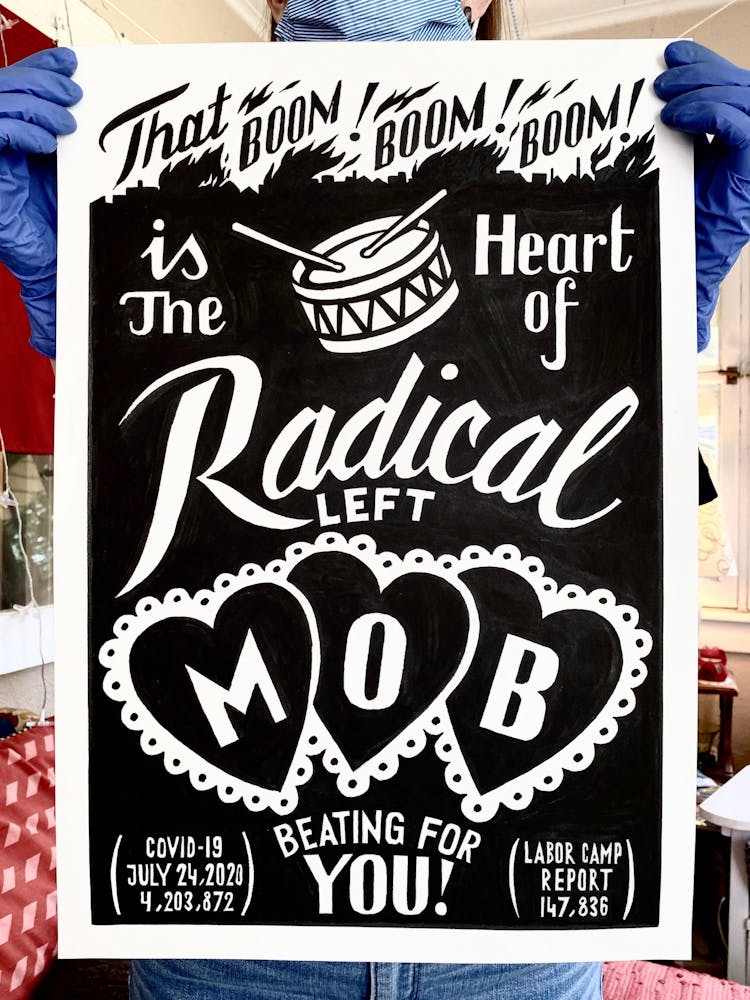 “I was, like us all, disoriented and disturbed and upset and afraid,” he recalls. “I had to do something to keep my mind off things.” An image came to mind—a severed head, seedlings sprouting from its eye sockets—and he drew, not quite knowing why. “I just wanted to draw it, and the idea of the economic implications of [COVID-19] was on my mind the whole time.” As with many of his works, Szyhalski hand-lettered text, adding a phrase that felt related: “Long live our banks!” He asked his daughter, Ava, to hold the drawing up, snapped an iPhone photo, and posted it on Instagram and Facebook, along with explanatory text: “Pondering the notion casually floated by our ‘leadership’ that some will need to die in order to save the ‘economy.’” He struck a nerve: his posts racked up hundreds of likes and comments and sparked DMs from around the country and the world, asking for more.