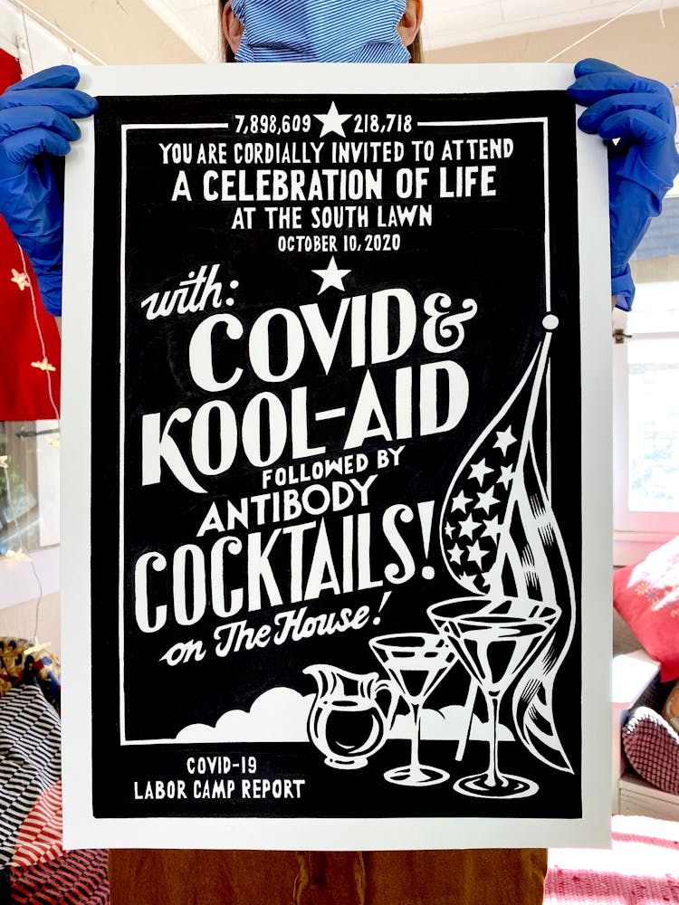 COVID! Kool-Aid! Cocktails! What does an invitation to a deadly superspreader look like anyway? Our diseased Leader moves fast: spread it while you got it!