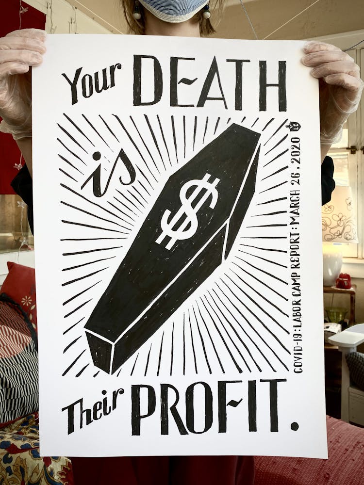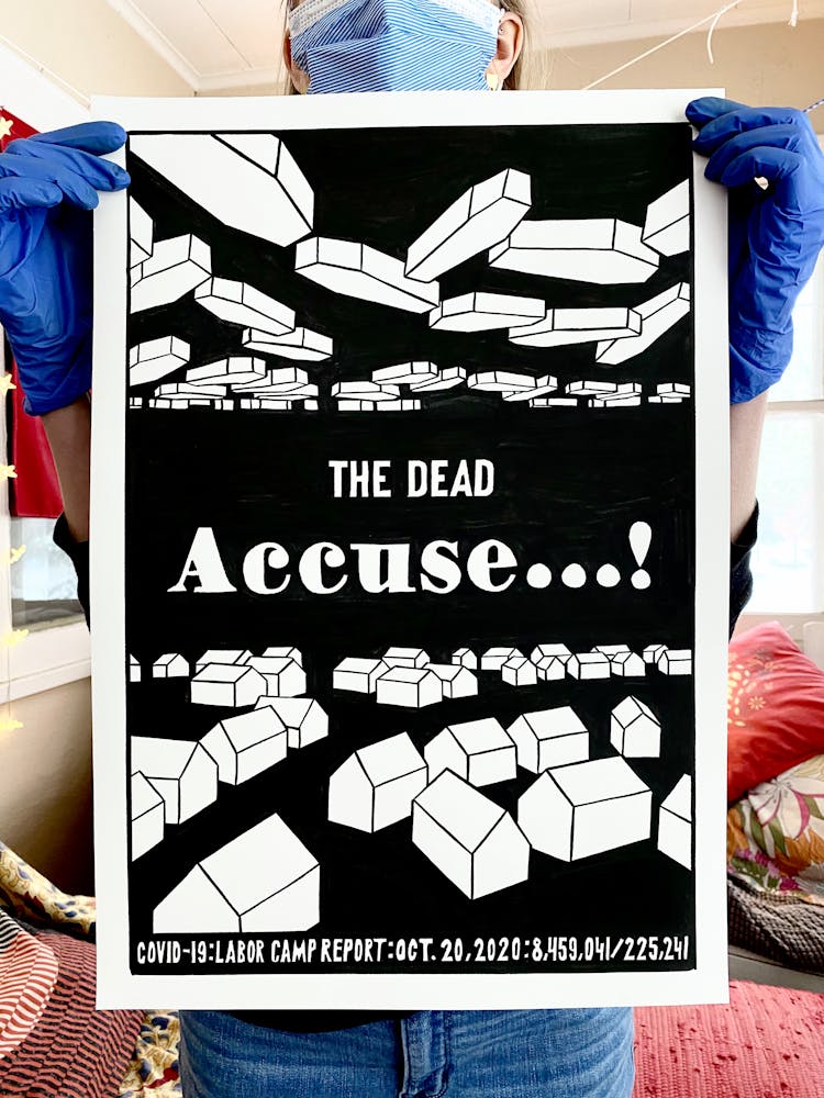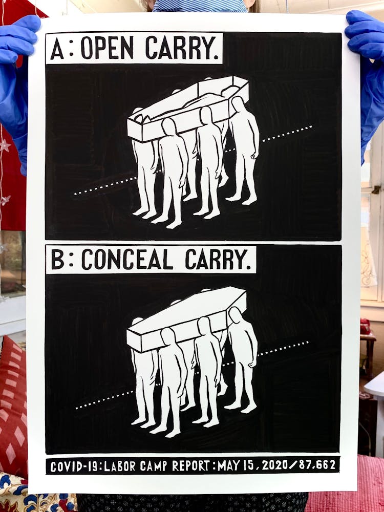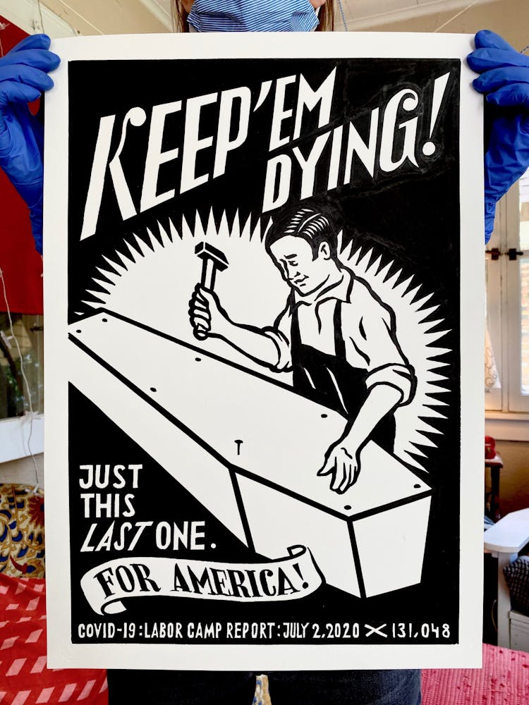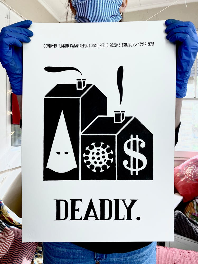 "I drew the image of the coffin with a dollar sign on it in 2015 for a project entitled THEM, also known as The Banner Project. I can’t stop thinking about how frighteningly specific it seems today. The debasing mathematics of death and profit. The warped logic of perverted ideology. The rampant thievery, and lies."