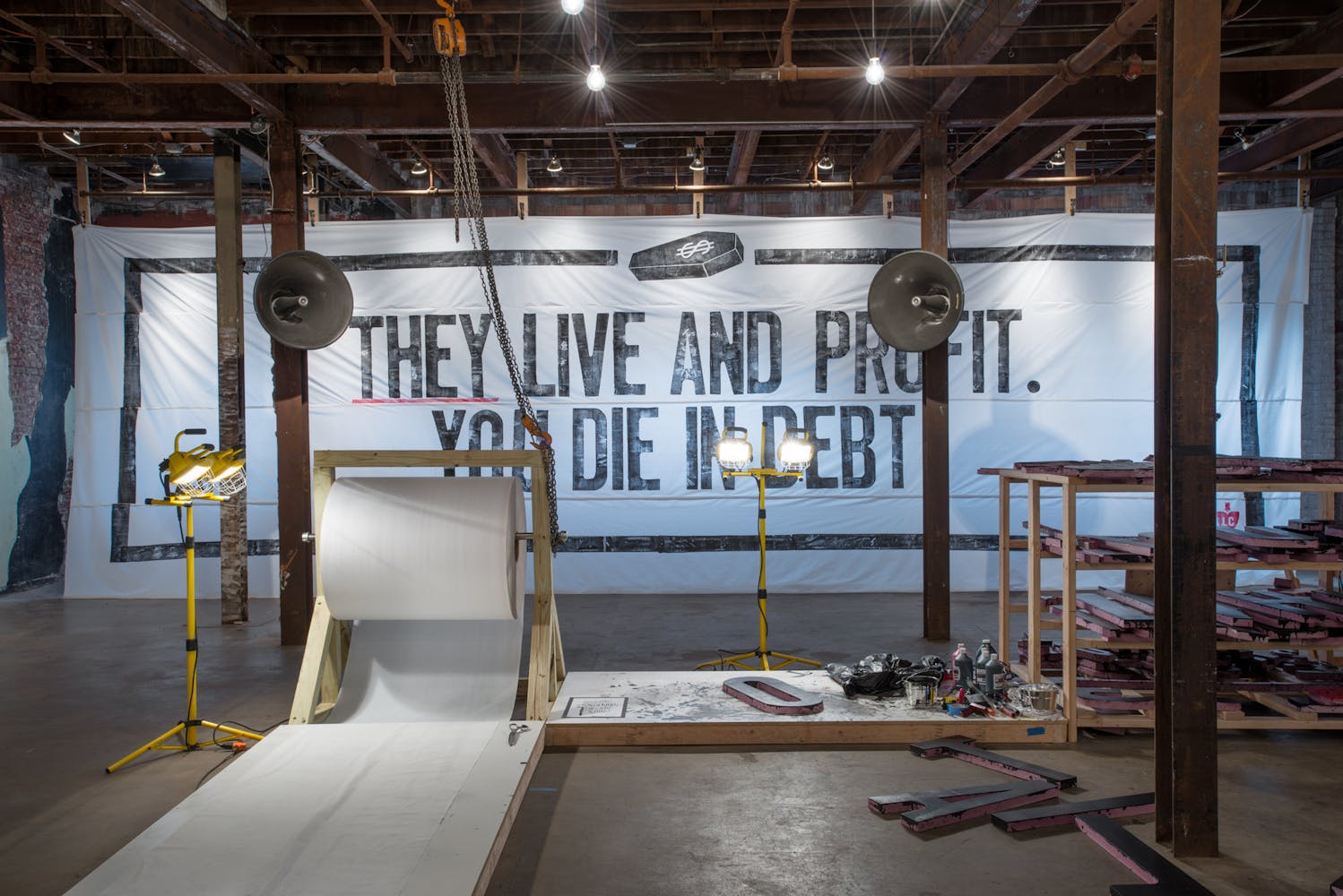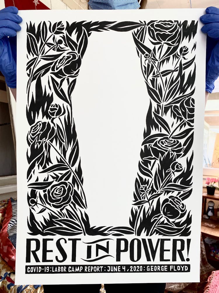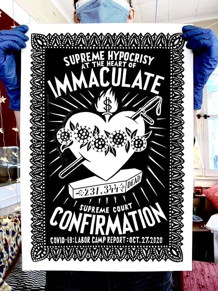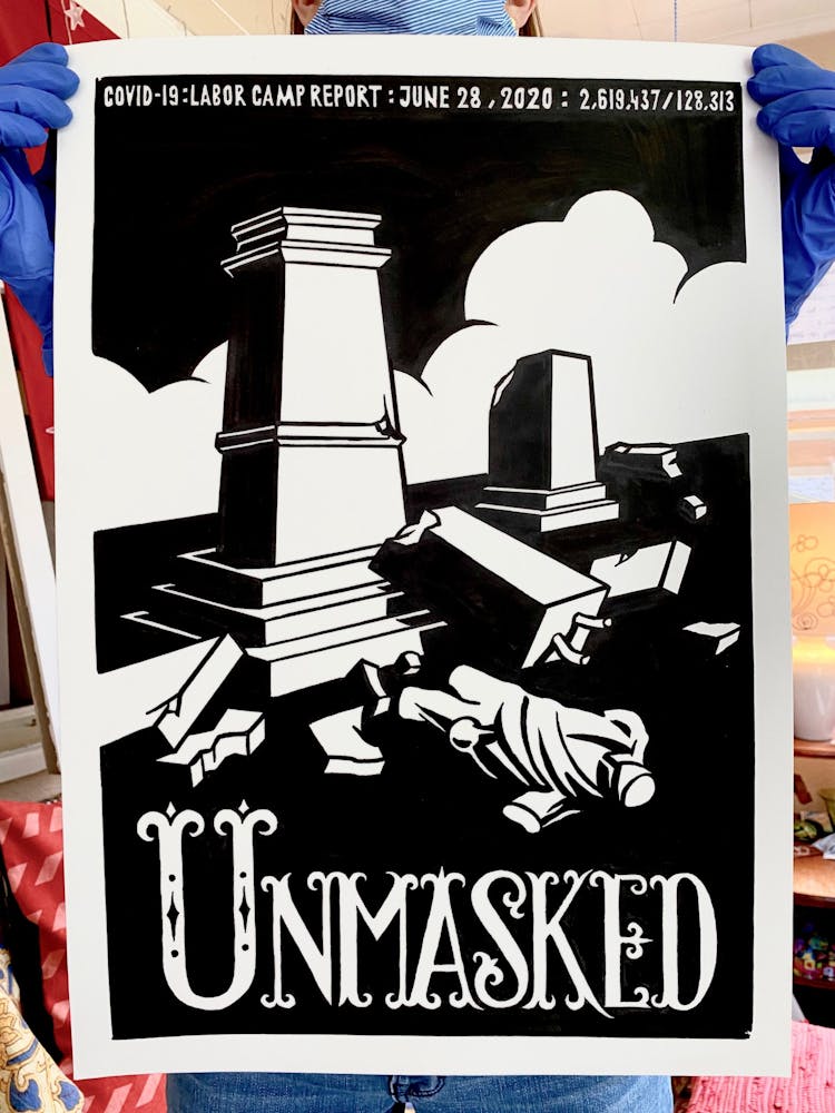 "I drew the image of the coffin with a dollar sign on it in 2015 for a project entitled THEM, also known as The Banner Project. I can’t stop thinking about how frighteningly specific it seems today. The debasing mathematics of death and profit. The warped logic of perverted ideology. The rampant thievery, and lies."