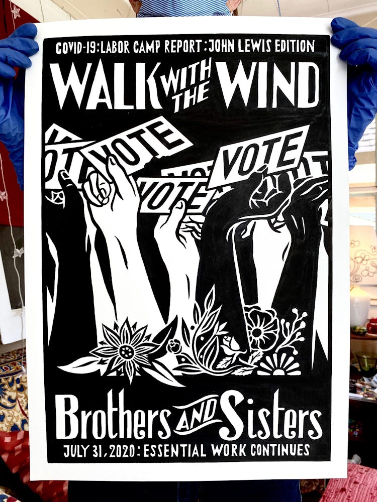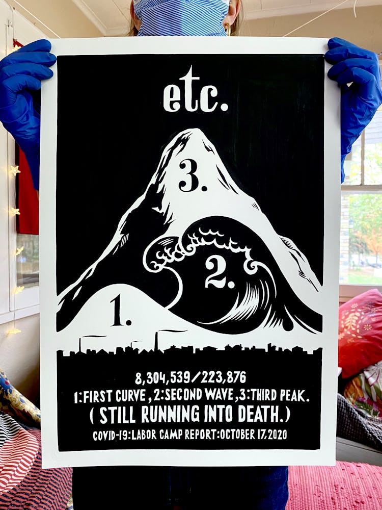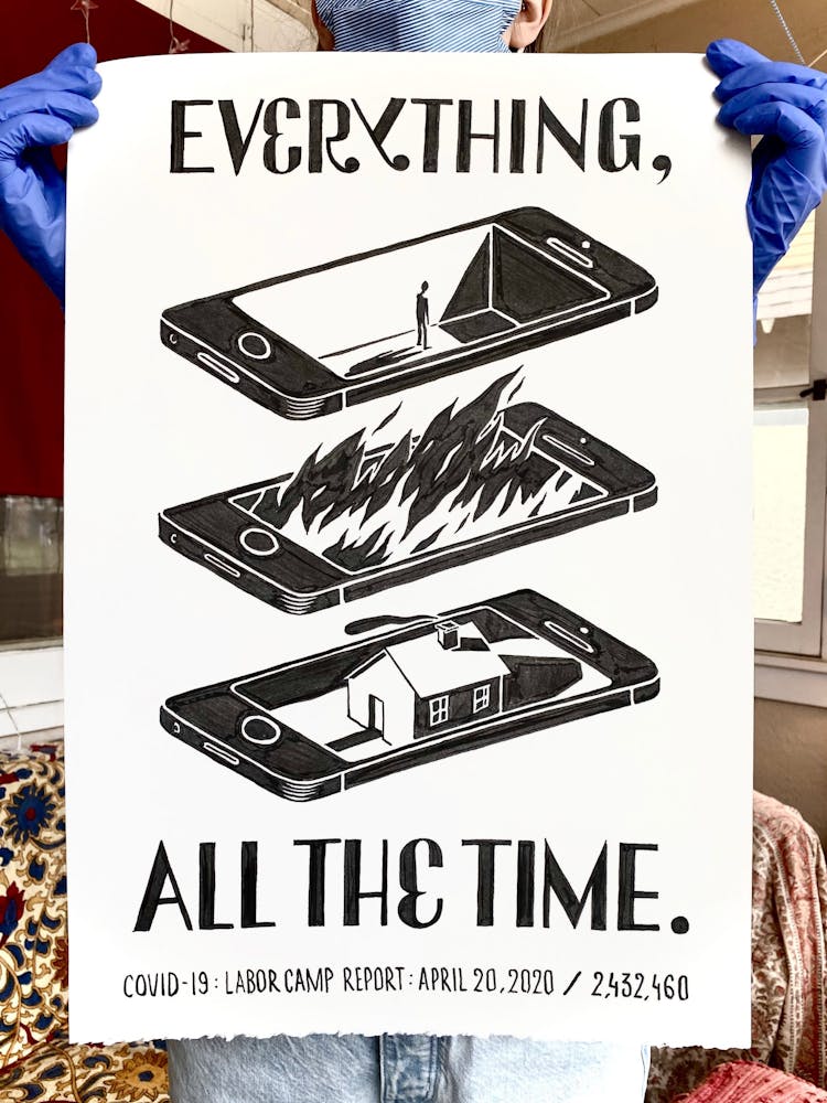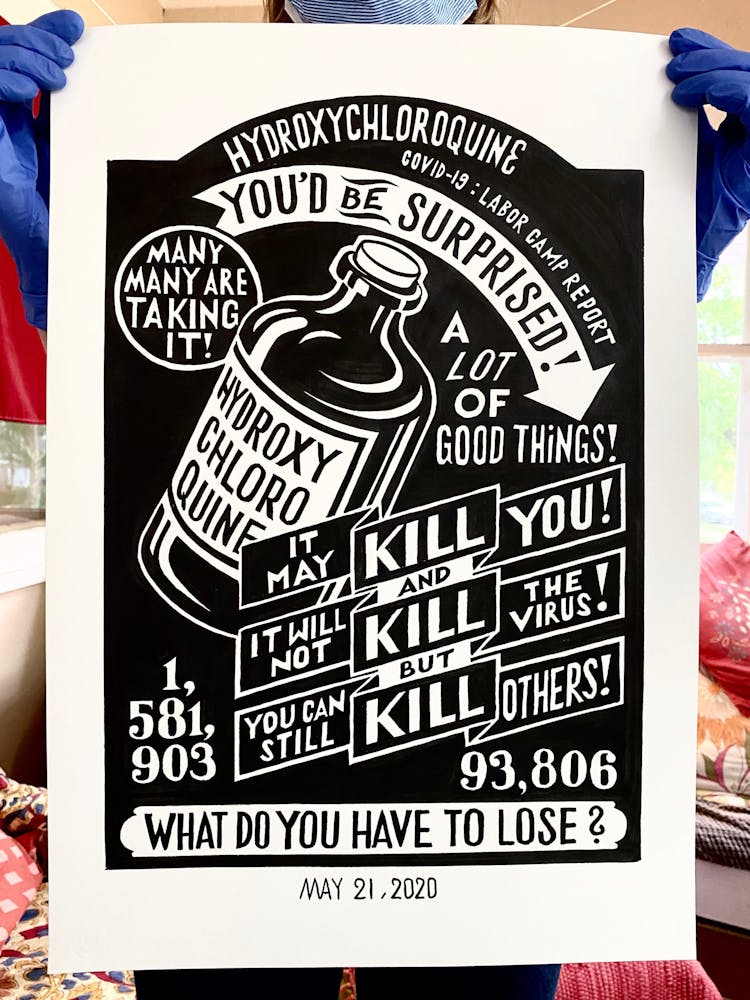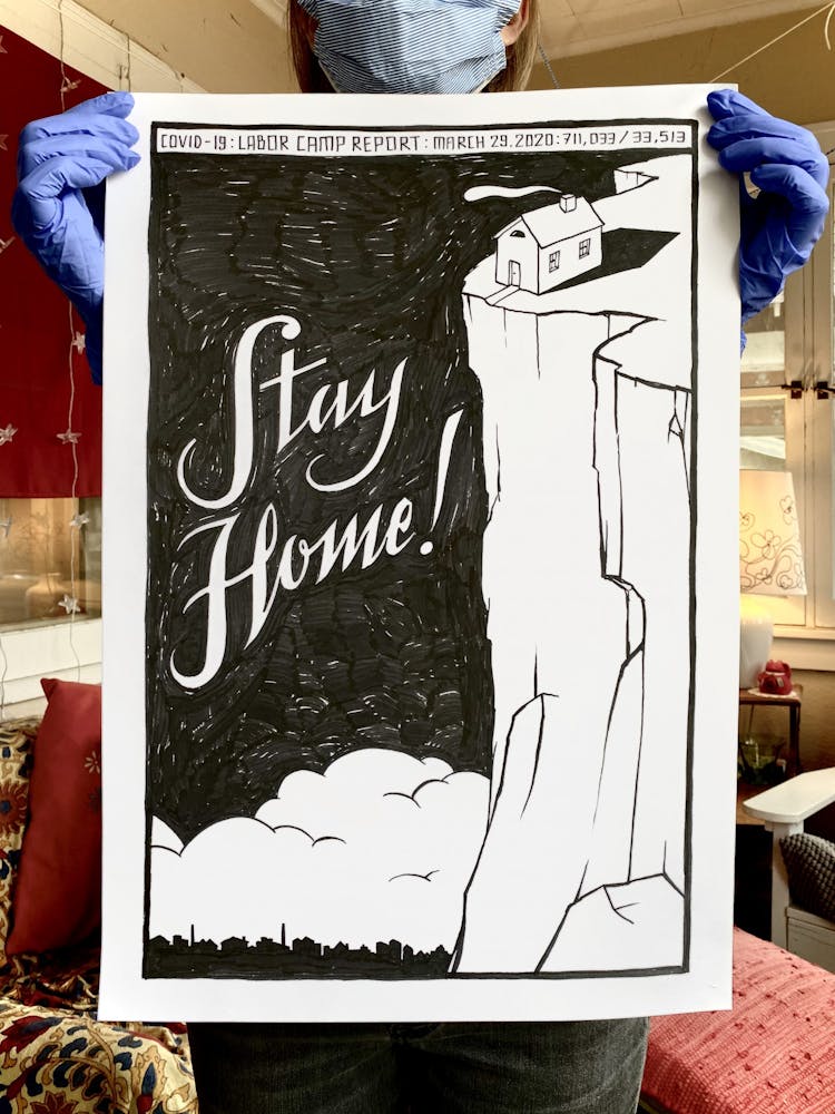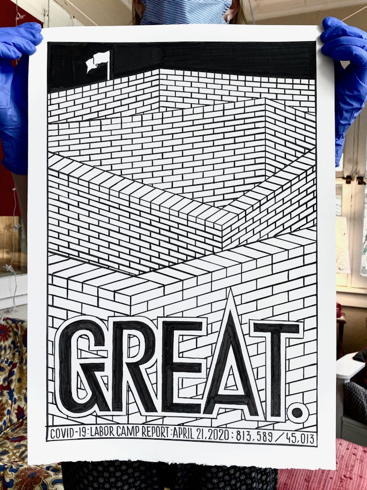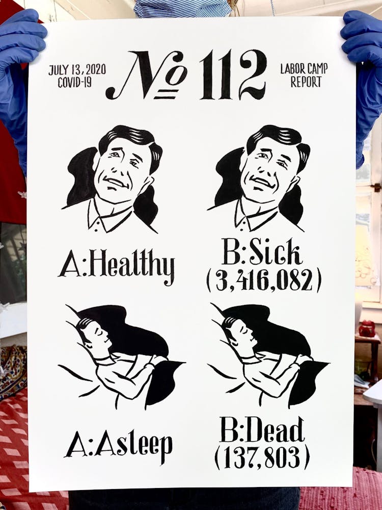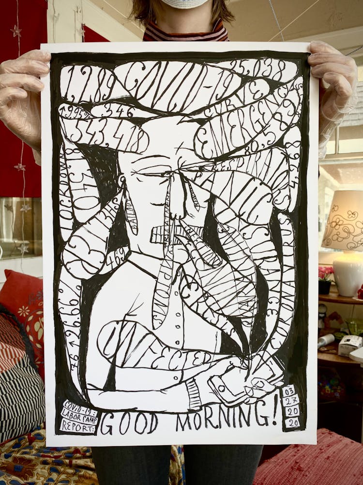 Szyhalski has agreed to share his COVID-19 project with Walker Reader as it progresses. Below, an archive of the full series, updated daily and annotated with Szyhalski’s comments, in reverse chronological order. To view on Instagram, visit @laborcamp.