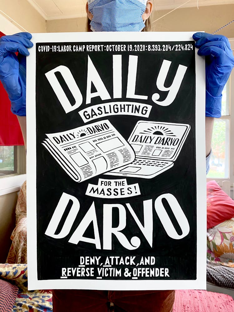 If it feels like we are all in an abusive relationship with the Great Leader, it’s because we really are! I only found out this morning that there is a name for what the Regime does constantly: DARVO! When a narcissist is accused of abuse, they Deny it, Attack, and Reverse the Victim and Offender. This is the exact dynamic we have been subjected to for the last 4 years. Daily.