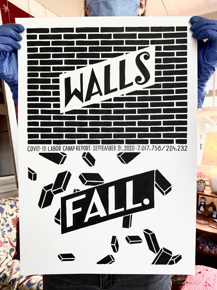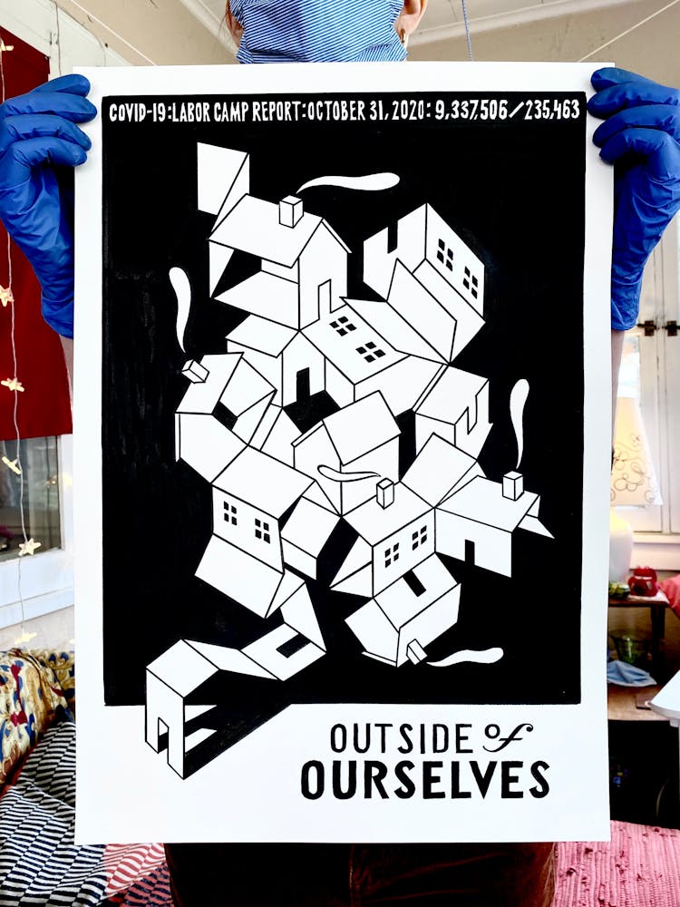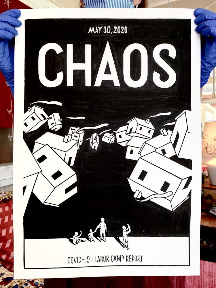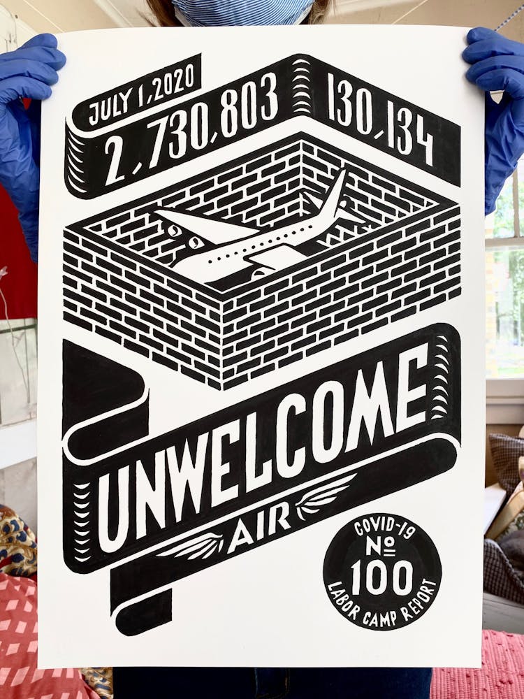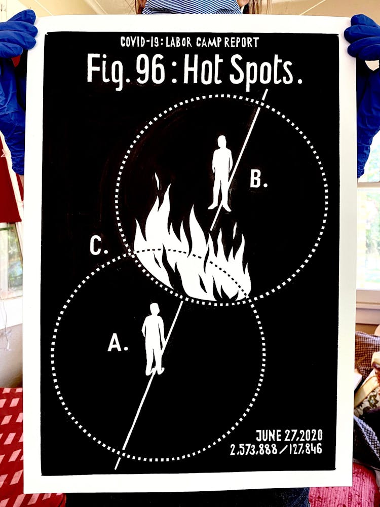 "We knew that jails, nursing homes, and meat plants have been consistent breeding grounds for COVID-19. Come fall we will be looking at schools the same way. This drawing is about the various scenarios of confinement and vulnerability, different scales of prisons, and the fact that since the travel ban our country became a kind of prison itself."