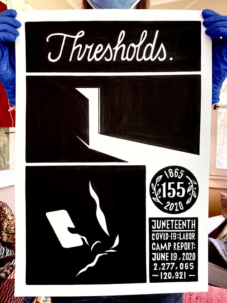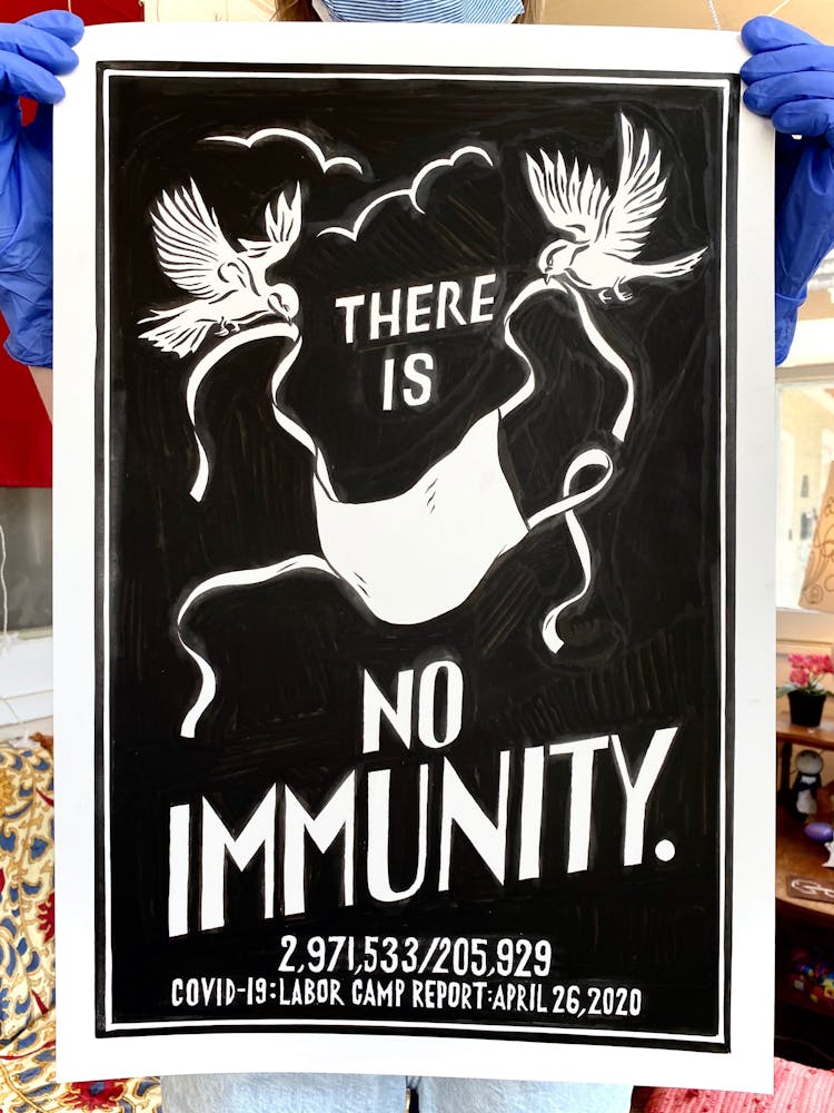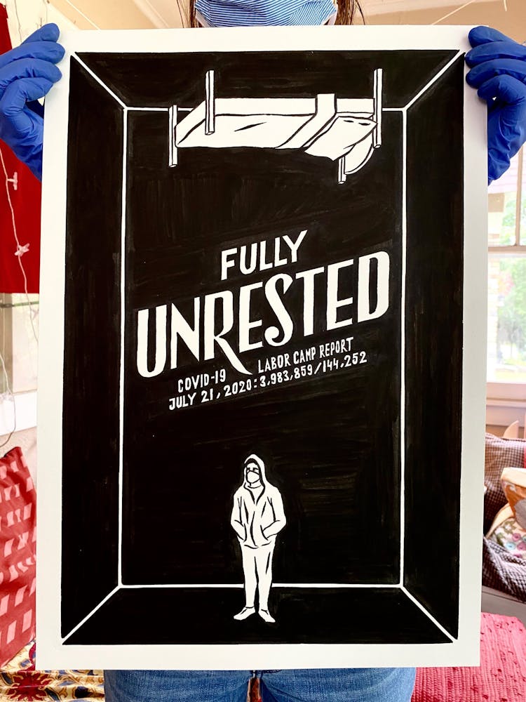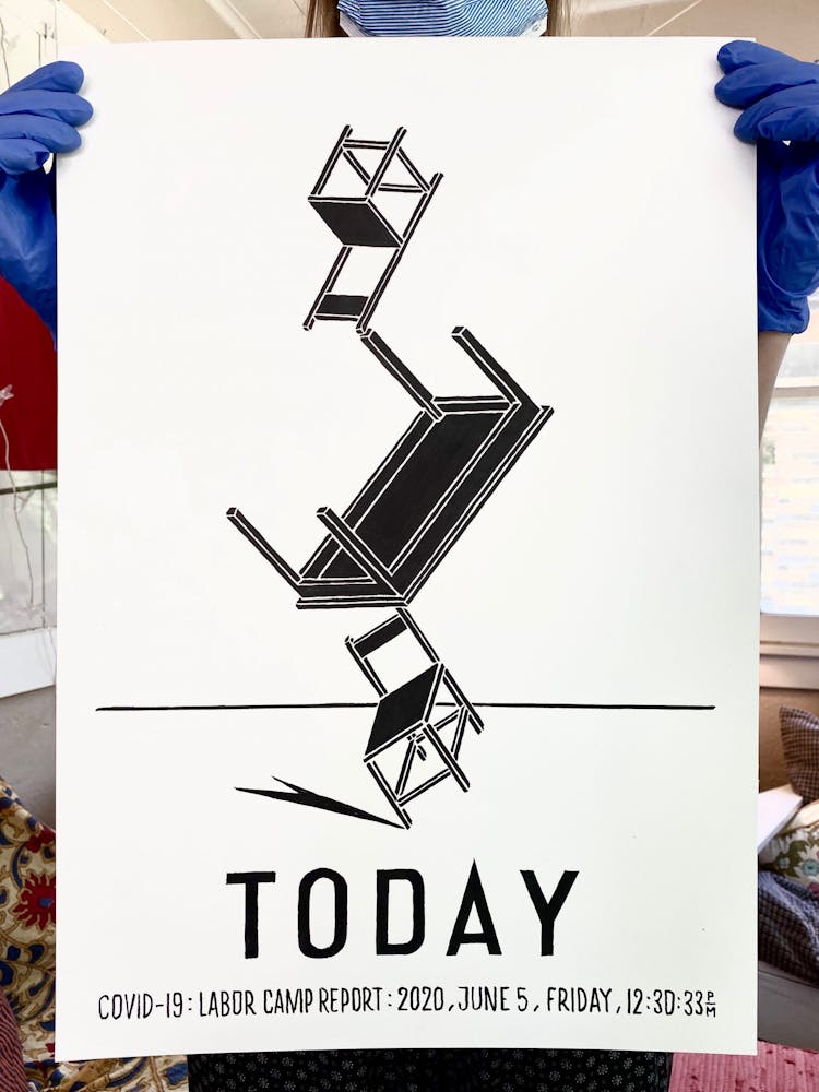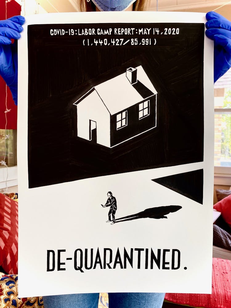 "We knew that jails, nursing homes, and meat plants have been consistent breeding grounds for COVID-19. Come fall we will be looking at schools the same way. This drawing is about the various scenarios of confinement and vulnerability, different scales of prisons, and the fact that since the travel ban our country became a kind of prison itself."