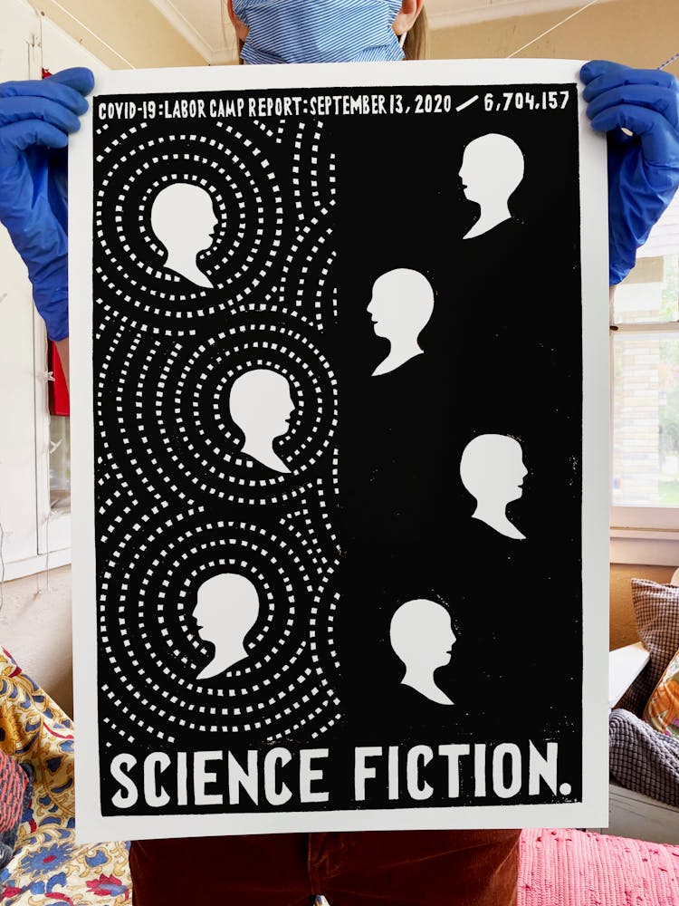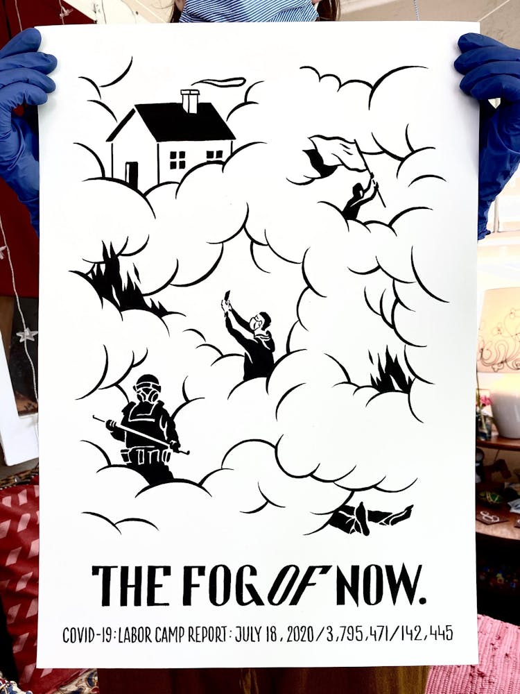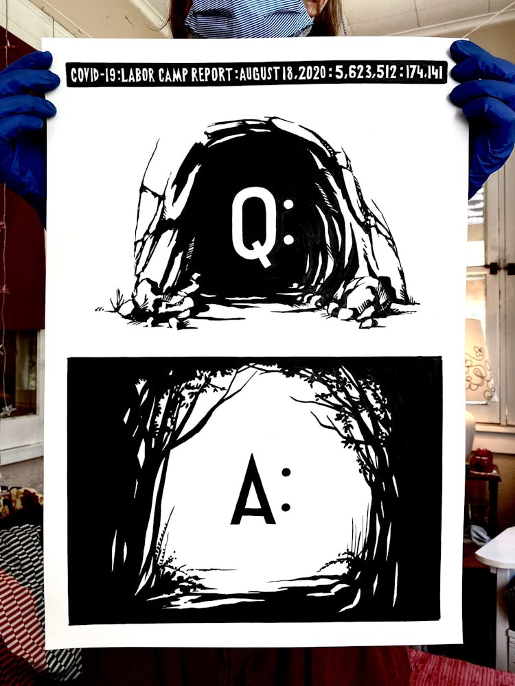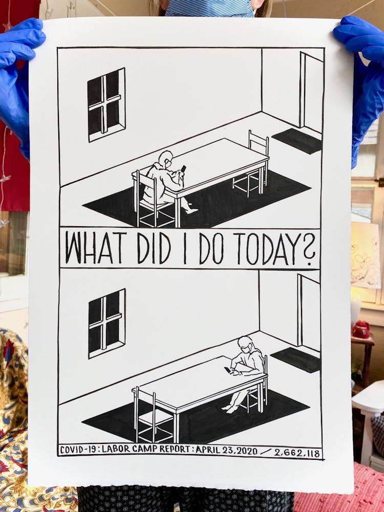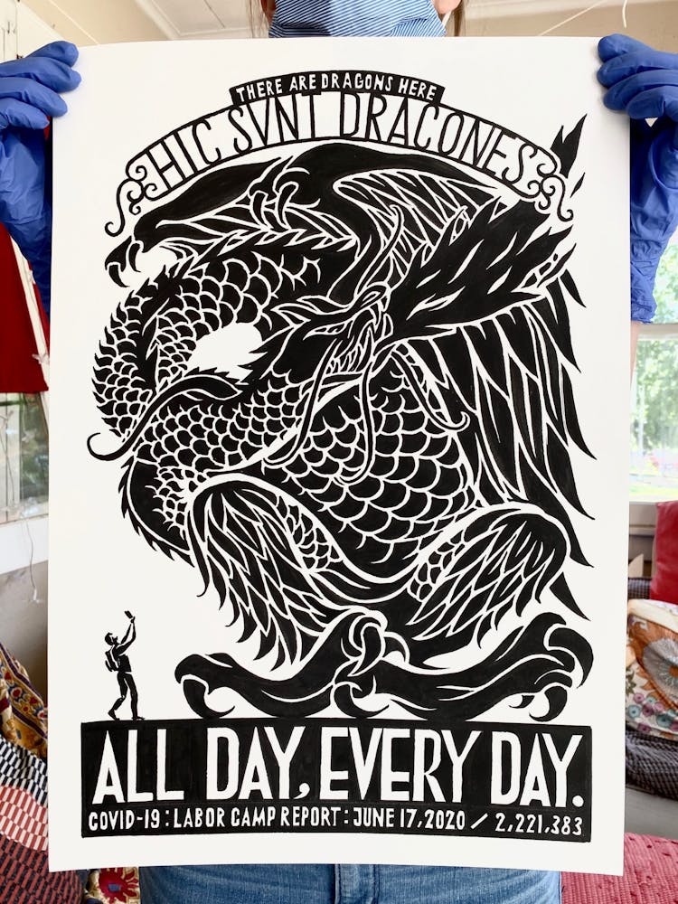 But he acknowledges that while his ideas and energy won’t soon dry up, daily Labor Camp Reports may come to an end before the coronavirus pandemic does. When he began the series in late March, he used tools on hand: seven sheets of leftover paper and a half bottle of ink. During an online meeting with artist Mike Hoyt, creative community liaison at Minneapolis’s Pillsbury House, he offhandedly mentioned that he was running low. Hoyt halted the meeting to text his coworker, artist Masanari Kawahara, who teaches art classes for kids at Pillsbury. “Masa took a large bottle of ink and put it in their Little Free Library outside,” Szyhalski says. “So I just drove up and picked it up like some kind of clandestine operation.” The project continued.