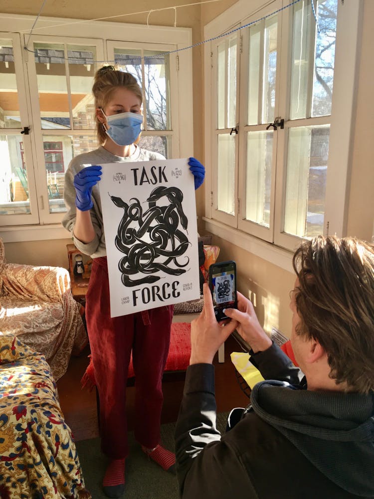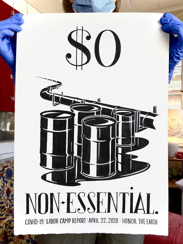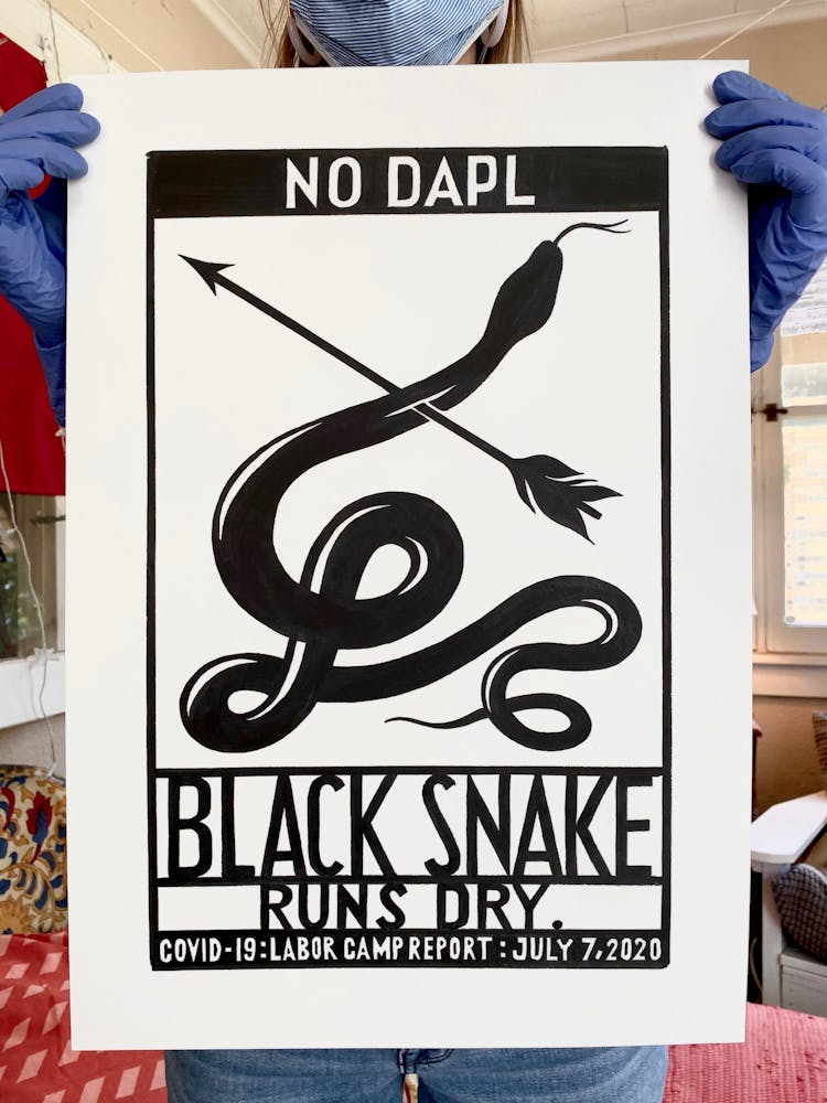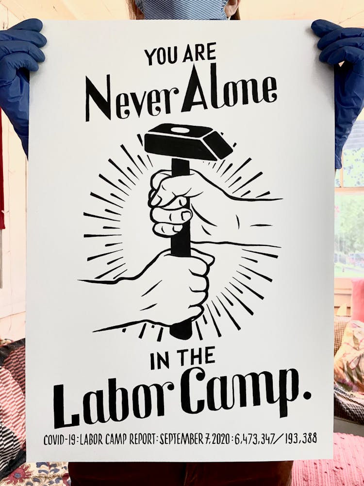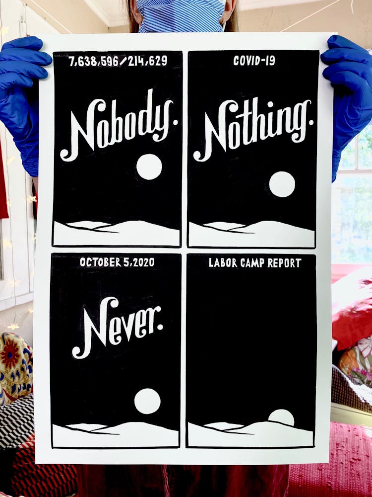 But he acknowledges that while his ideas and energy won’t soon dry up, daily Labor Camp Reports may come to an end before the coronavirus pandemic does. When he began the series in late March, he used tools on hand: seven sheets of leftover paper and a half bottle of ink. During an online meeting with artist Mike Hoyt, creative community liaison at Minneapolis’s Pillsbury House, he offhandedly mentioned that he was running low. Hoyt halted the meeting to text his coworker, artist Masanari Kawahara, who teaches art classes for kids at Pillsbury. “Masa took a large bottle of ink and put it in their Little Free Library outside,” Szyhalski says. “So I just drove up and picked it up like some kind of clandestine operation.” The project continued.