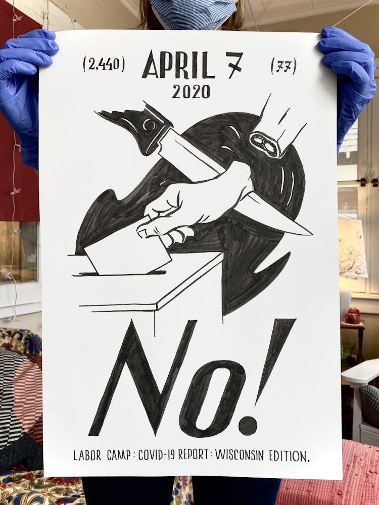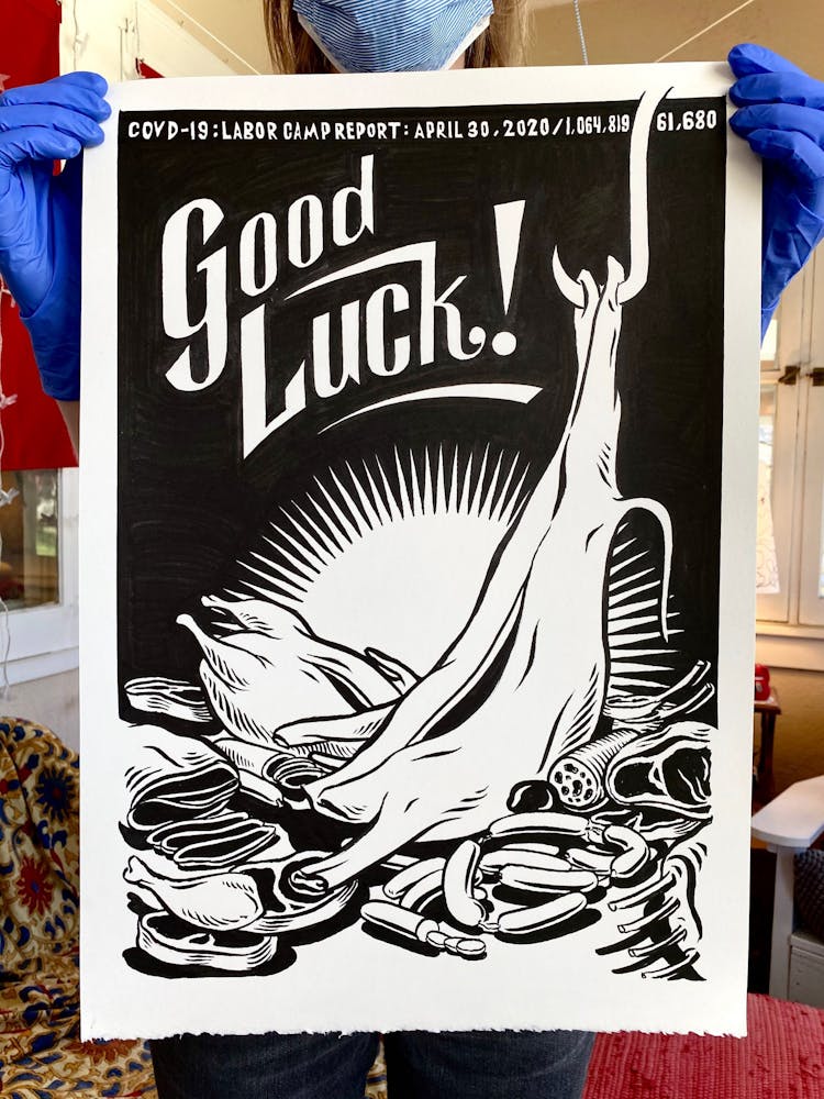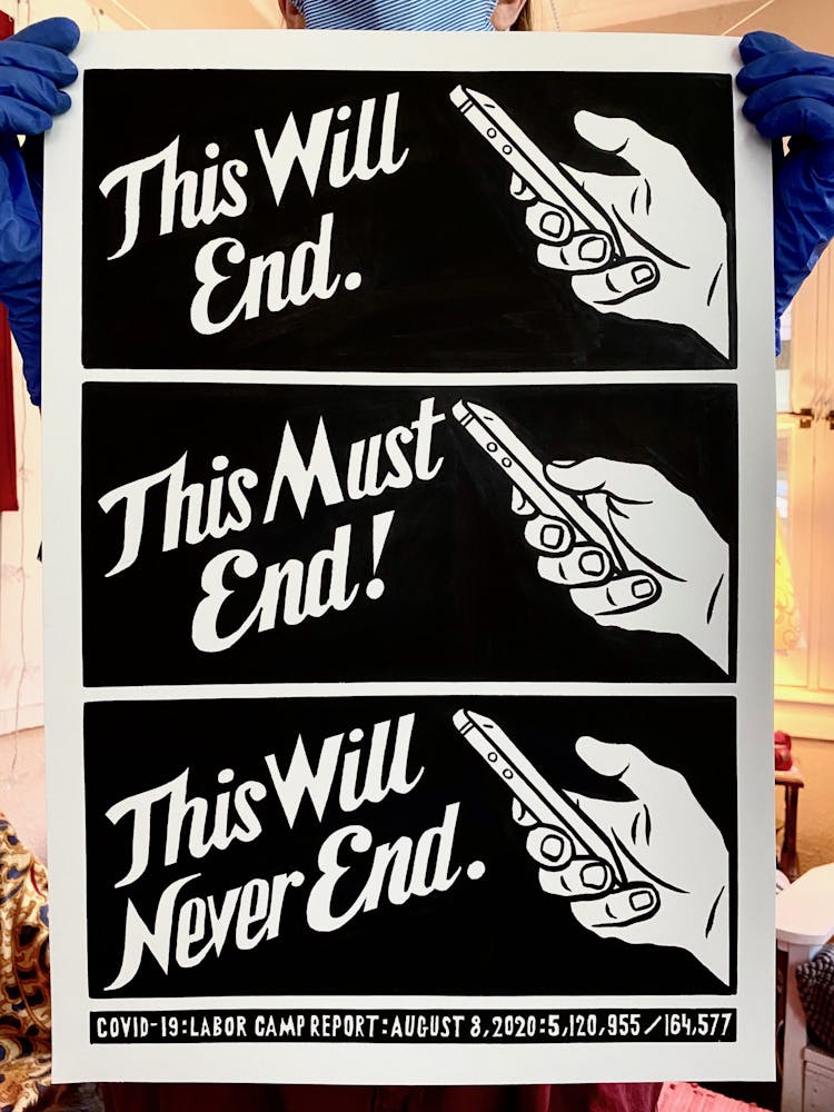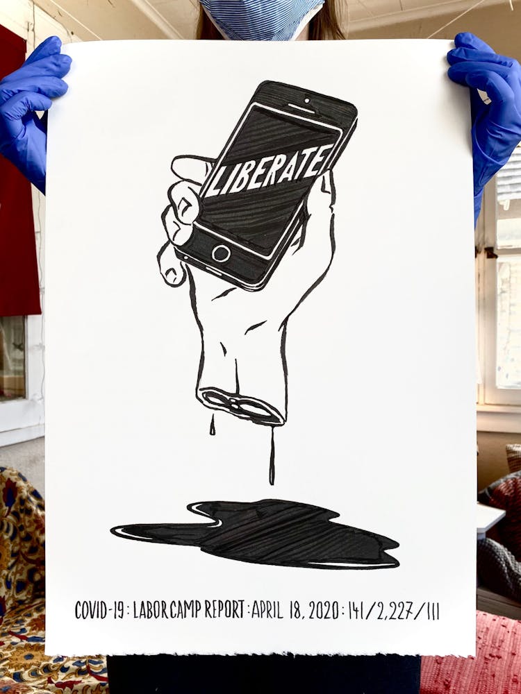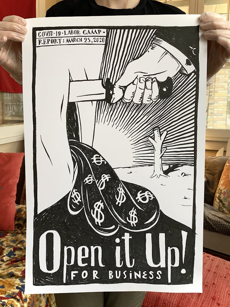 The next day, just as Minnesota Gov. Tim Walz was issuing a shelter-in-place order that continues today, he started another piece, setting in motion a daily practice of artmaking in response to the politics and pain surrounding COVID-19. This second “Labor Camp Report,” named after the artistic framework Szyhalski has been making art under for years, is even darker: the hand of a man wearing a suit is seen eviscerating what appears to be a body, entrails marked with dollar signs spilling onto the ground. “Open it up! For business,” it reads, an ebullient exclamation mark contrasting the gruesome scene.