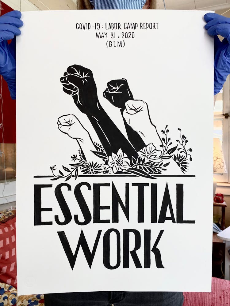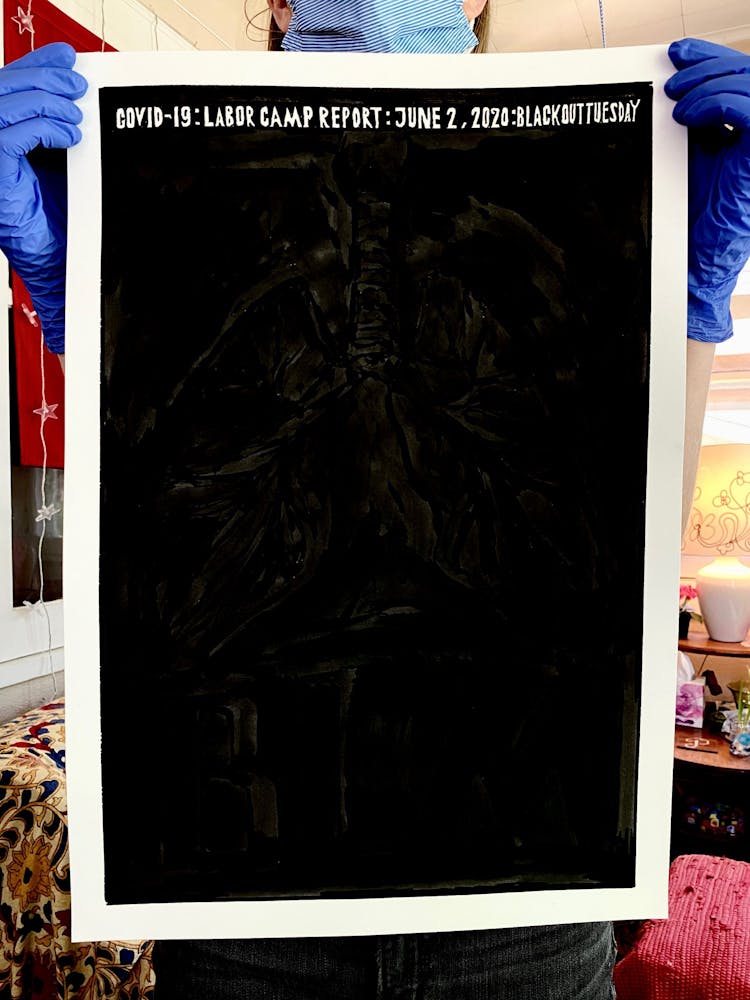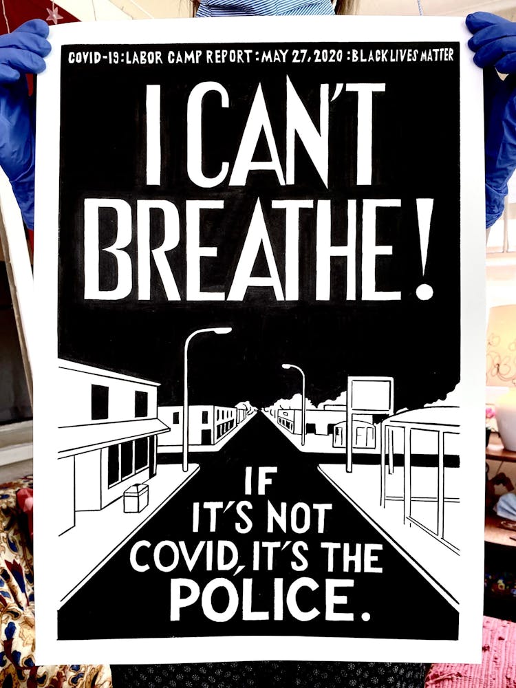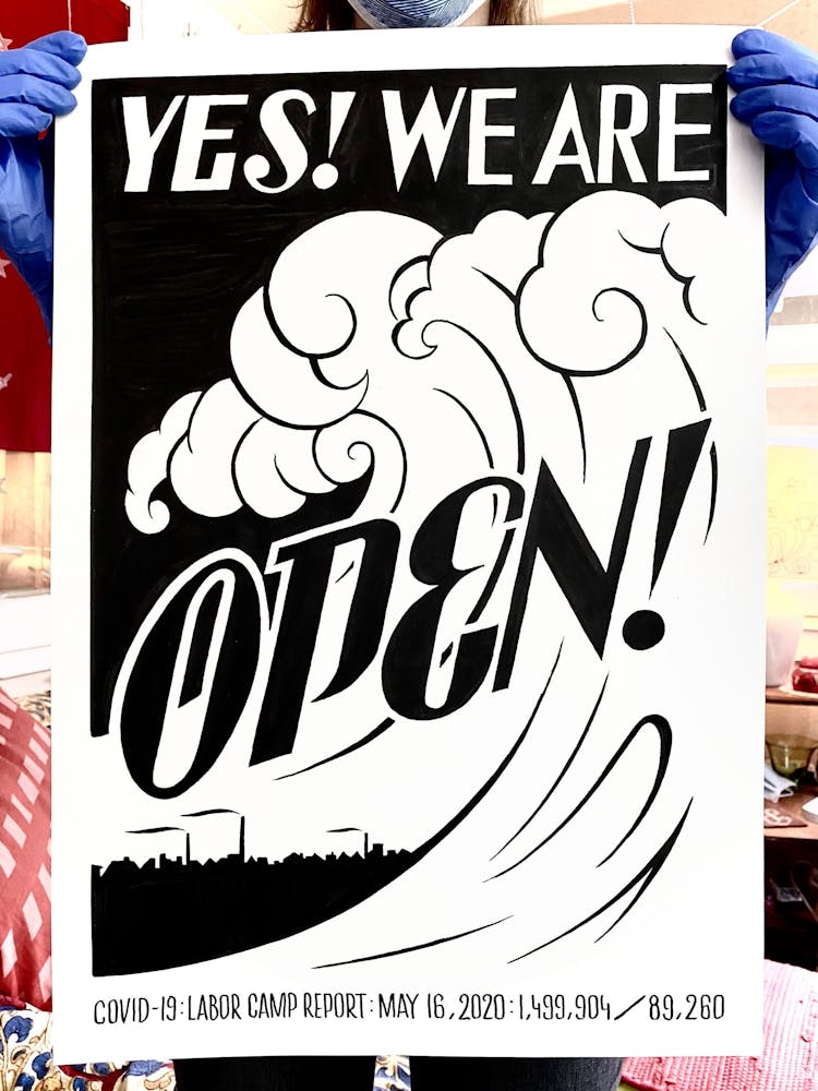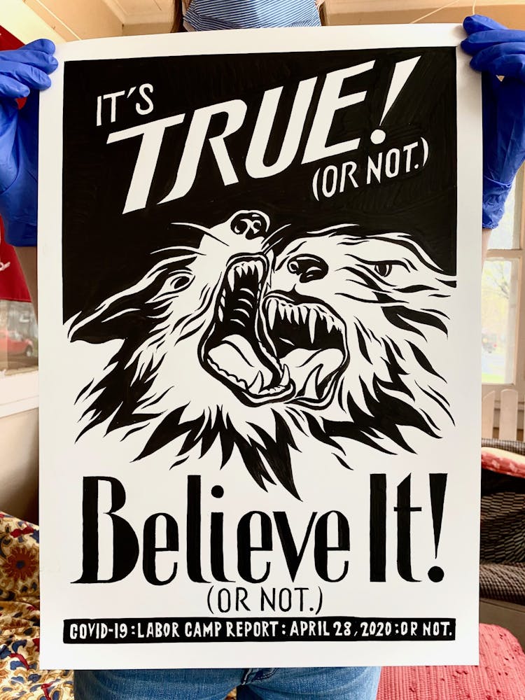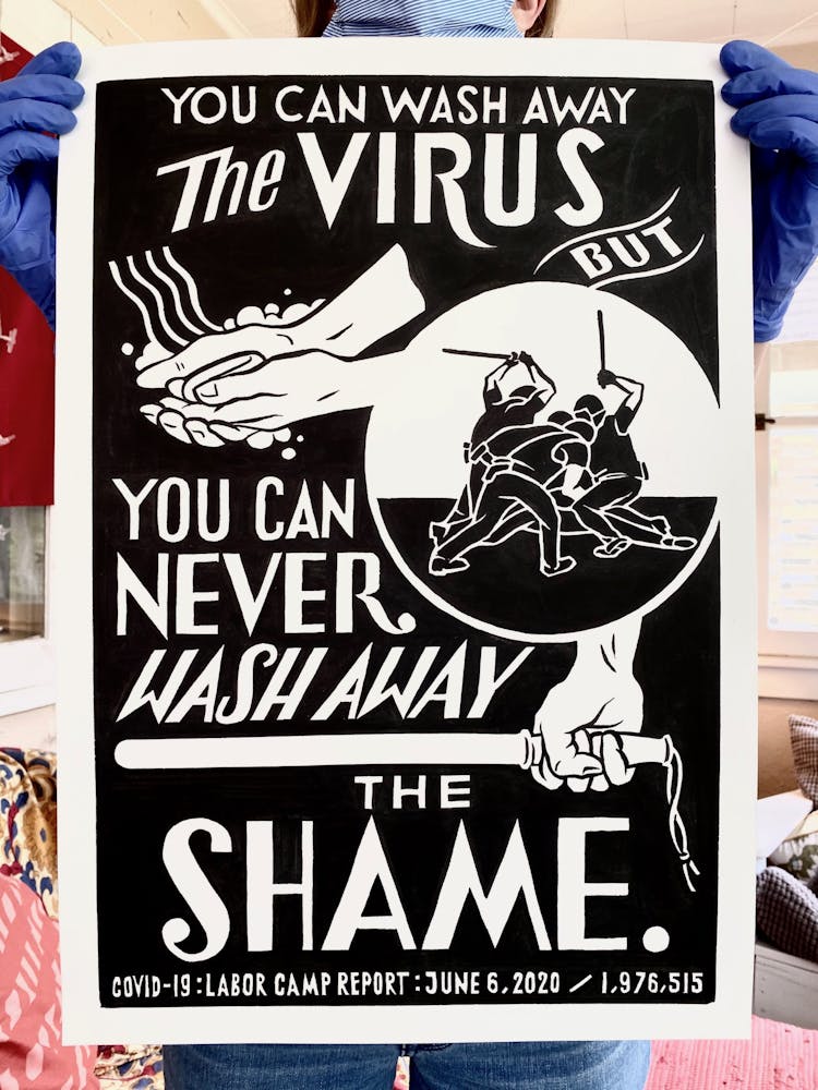 The next day, just as Minnesota Gov. Tim Walz was issuing a shelter-in-place order that continues today, he started another piece, setting in motion a daily practice of artmaking in response to the politics and pain surrounding COVID-19. This second “Labor Camp Report,” named after the artistic framework Szyhalski has been making art under for years, is even darker: the hand of a man wearing a suit is seen eviscerating what appears to be a body, entrails marked with dollar signs spilling onto the ground. “Open it up! For business,” it reads, an ebullient exclamation mark contrasting the gruesome scene.